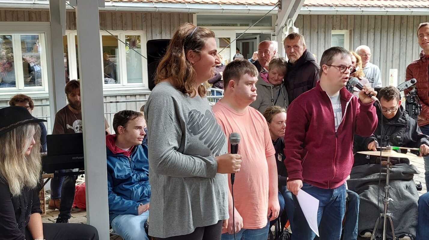 Die Band rückt zusammen, denn es sind gut 20 Musikerinnen und Musiker, die hier auf dem etwas beengten Platz mit ihren Songs die Zuhörer begeistern wollen. Rund die Hälfte von ihnen hat ein Handicap. Dazu kommen einige Amateurmusiker aus der Region, die das musikalische Gerüst stellen. Und auch Betreuerinnen sind dabei, die dafür sorgen, dass alles ohne Zwischenfälle verlaufen kann.