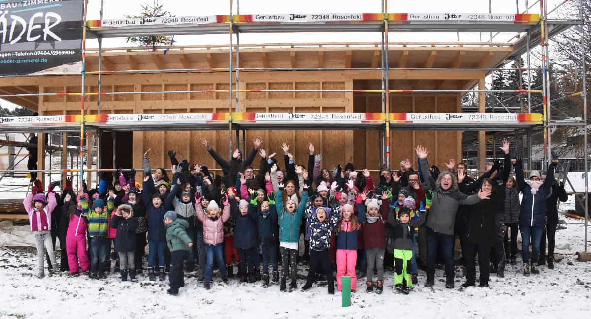 Ein Freudentag nicht nur für Ganztagesleiter Markus Mauch, sondern auch für Erzieherinnen, Lehrer und vor allem Kinder, die sich um das hölzerne Hauptgebäude versammelten. Die Zeremonie der Zimmerleute war schnell vorbei, so dass die Kinder bald um das wärmende Feuer sitzen konnten. Mit dem Lied „Schwarze Fingernägel“, das sich als „Ohrwurm“ entpuppte, begann der gemütliche Teil mit Kinderpunsch und Hefezopf.