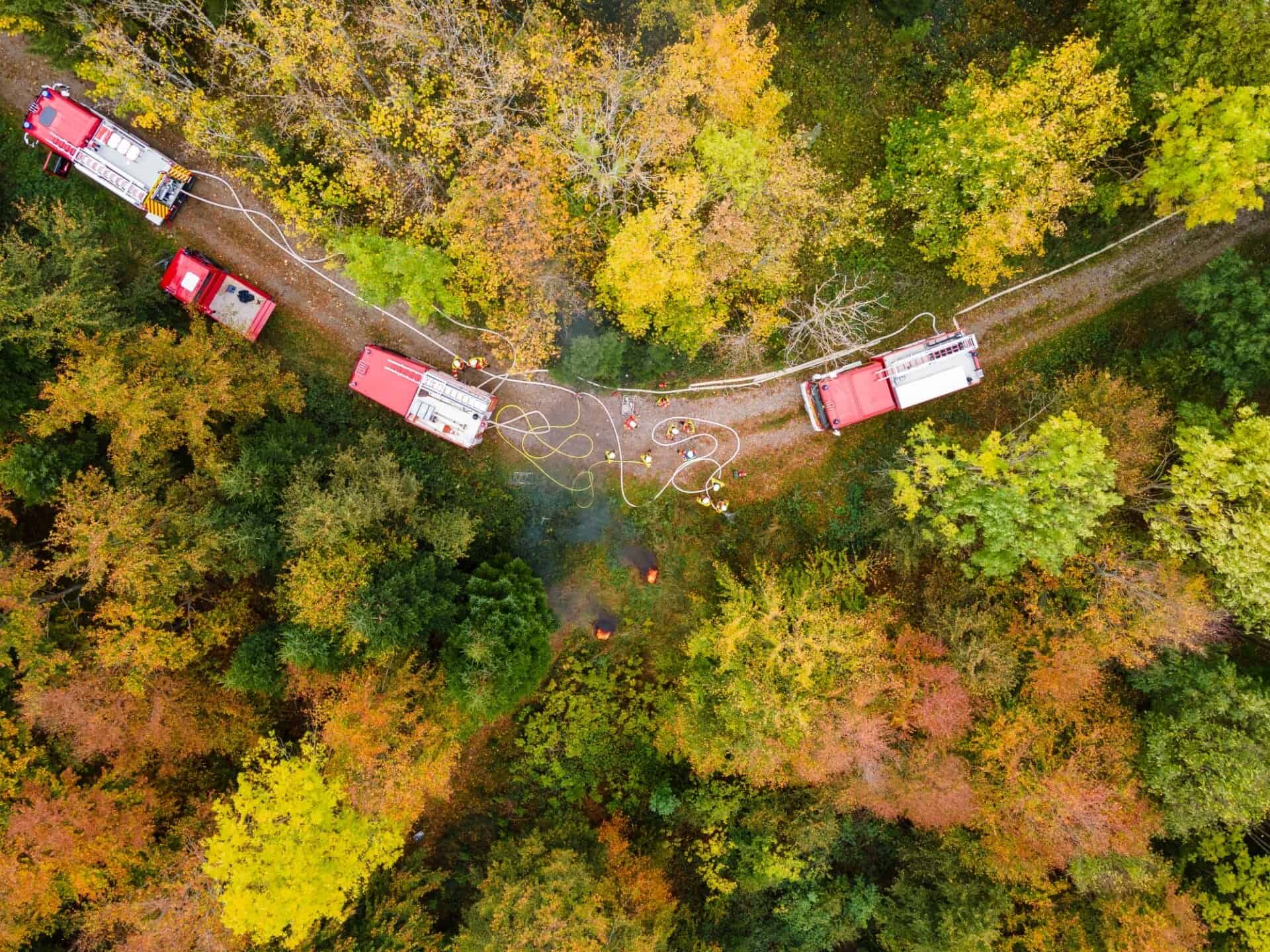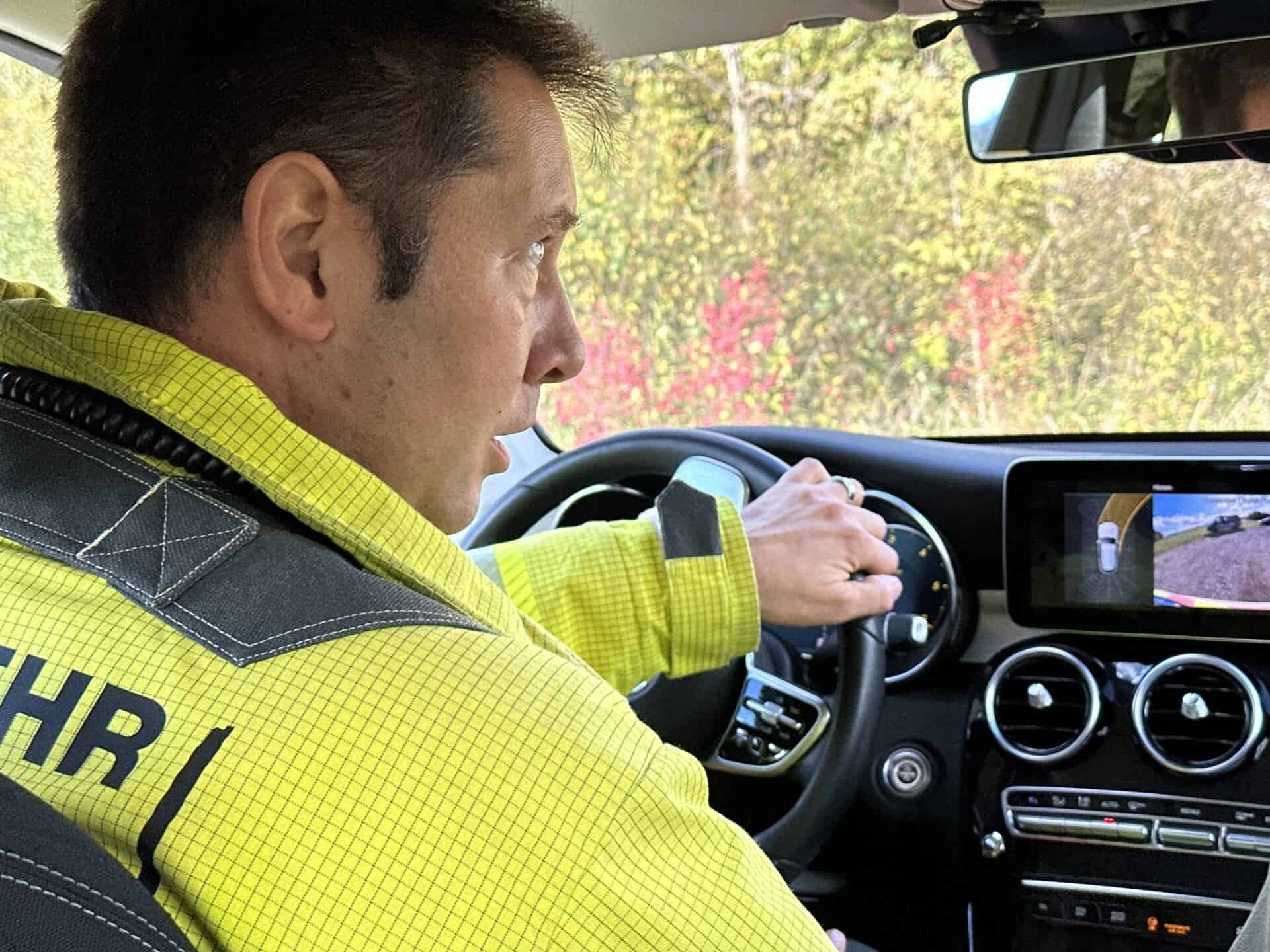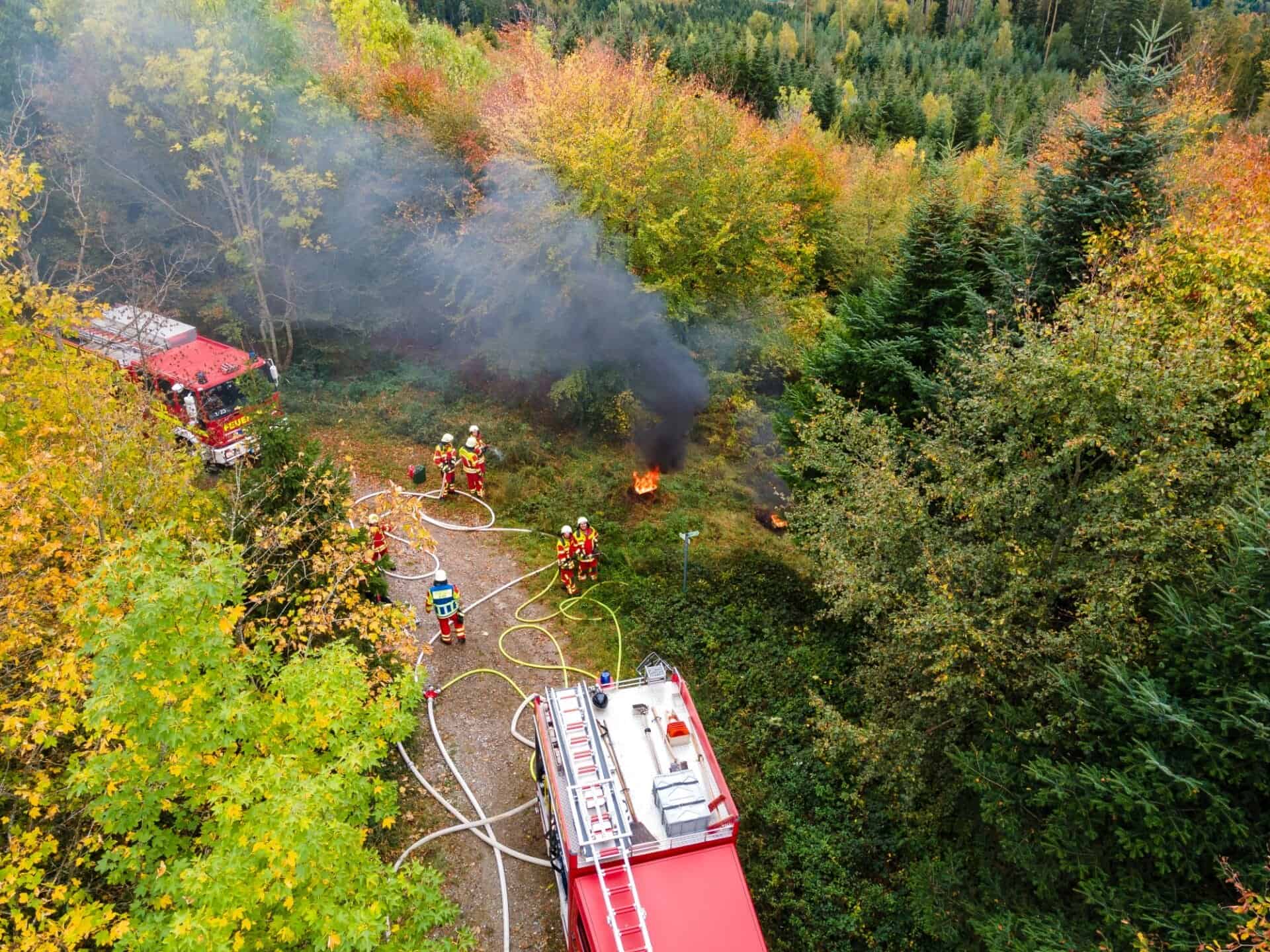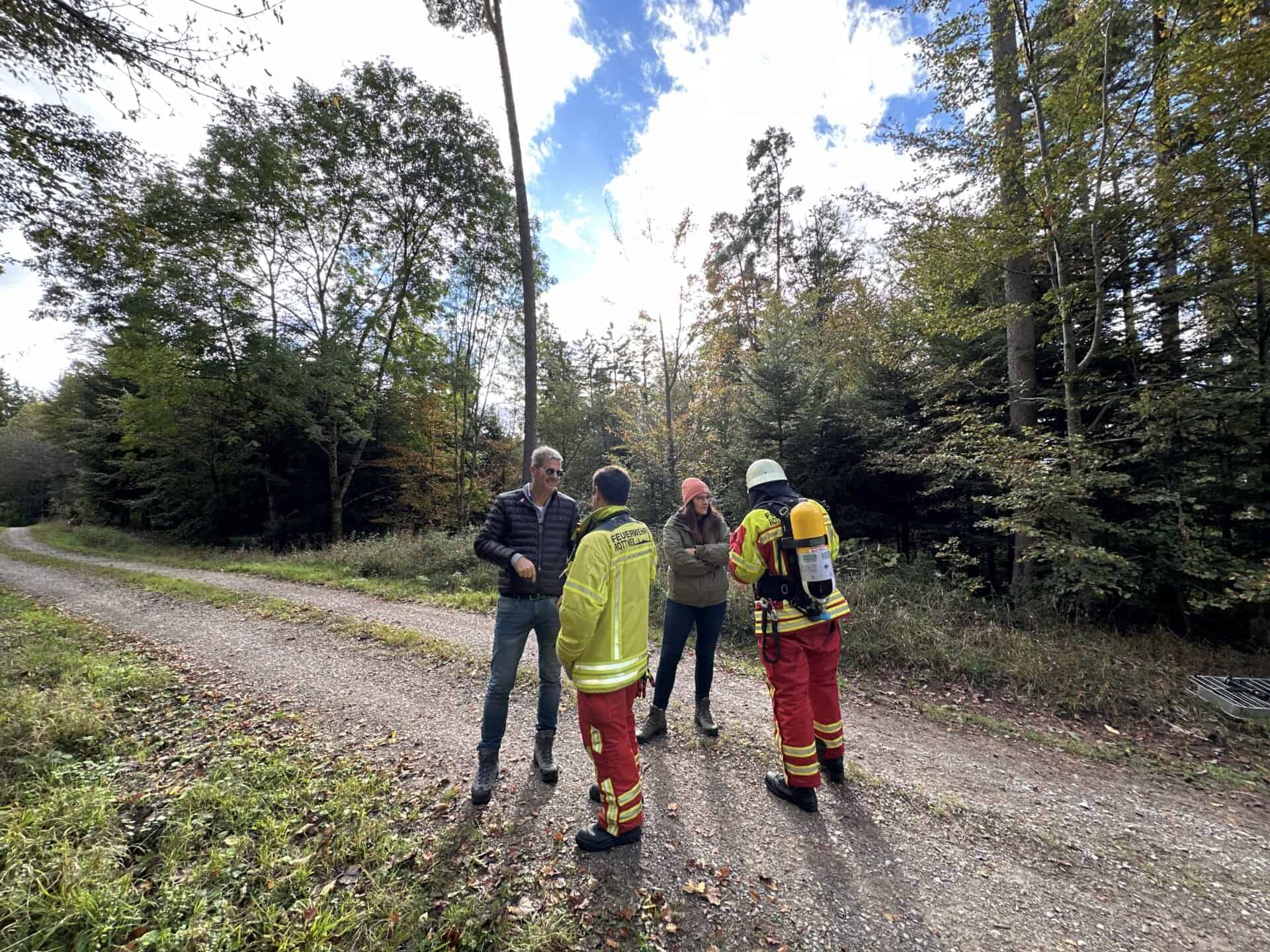 Gegenwärtig sind die Feuerwehrleute zu Fuß im Wald unterwegs, um die Einsatzstelle zu erkunden und das Ausmaß zu ermessen, so Wendel. Alles läuft unter der Annahme eines realen Einsatzes.