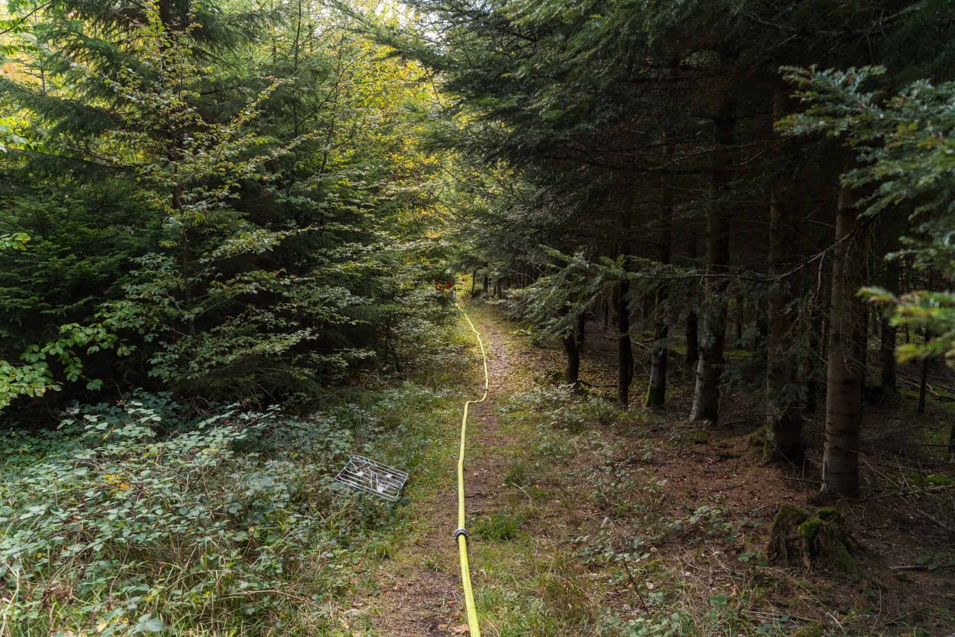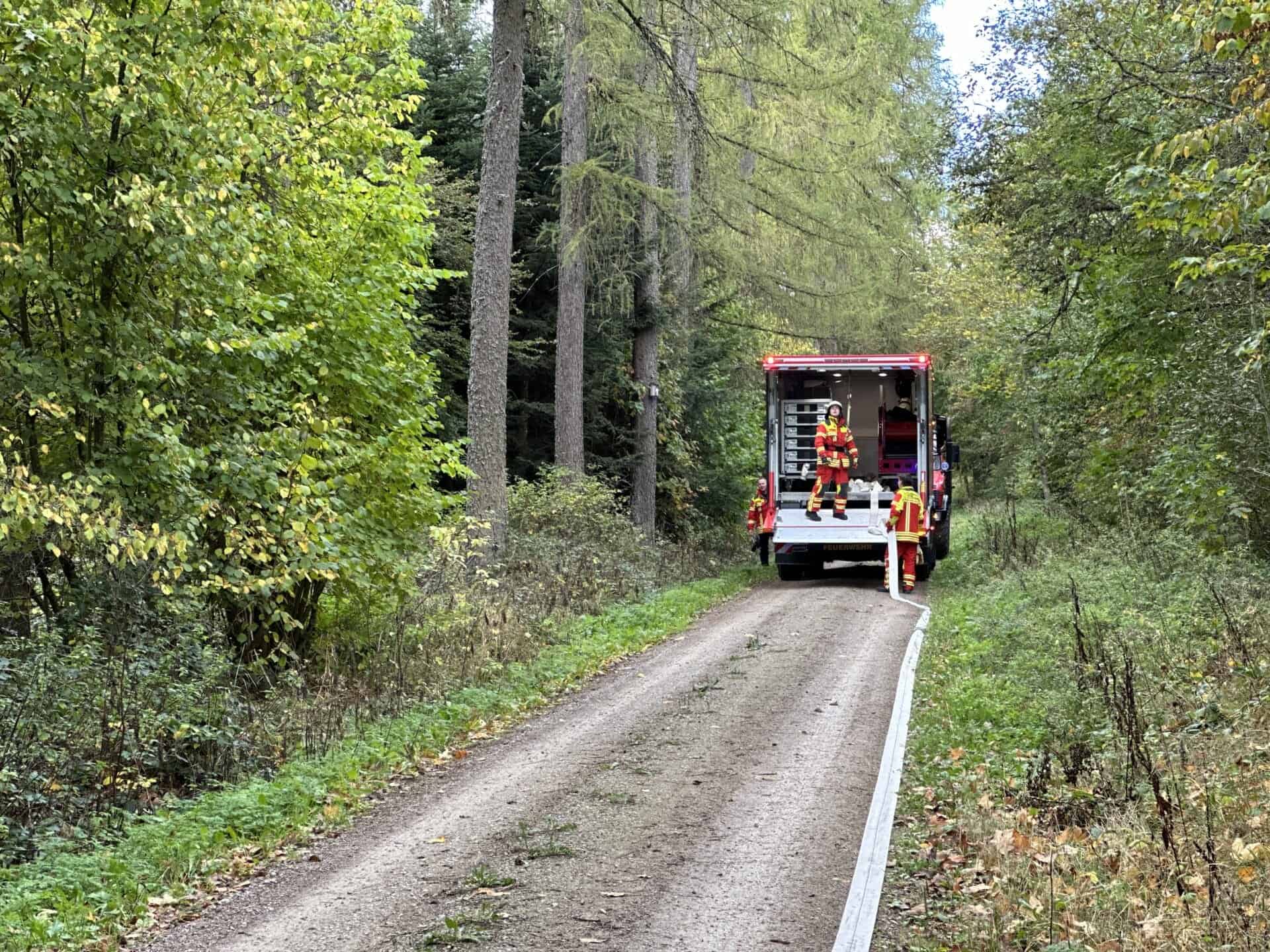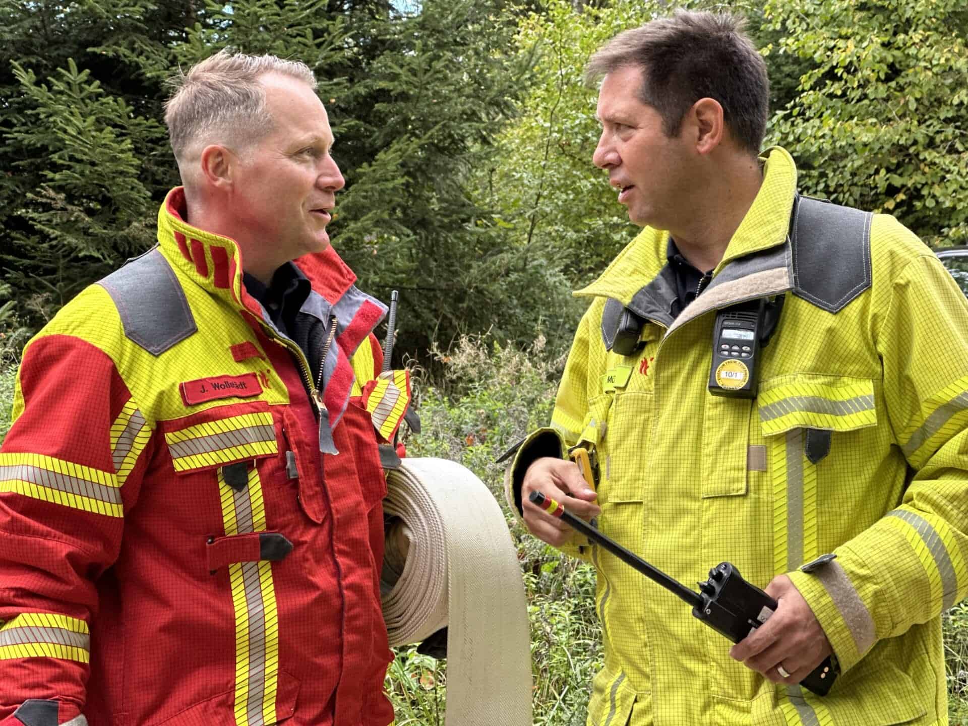 Update, 15.30 Uhr: Laut Einsatzleiter Frank Müller habe die Feuerwehr häufiger Gebäudebrände abzuarbeiten. Man übe daher ein unbekanntes Szenario. Außerdem sei es wichtig, etwa den umfangreichen Funkverkehr in dem weitläufigen, undurchsichtigen Waldgebiet zu üben. Und Überraschungen zu erleben – etwa dass ein naher Hochbehälter nicht mehr in Betrieb ist, dass ein Hydrant trocken steht, im Einsatzfall kein Wasser liefern kann.