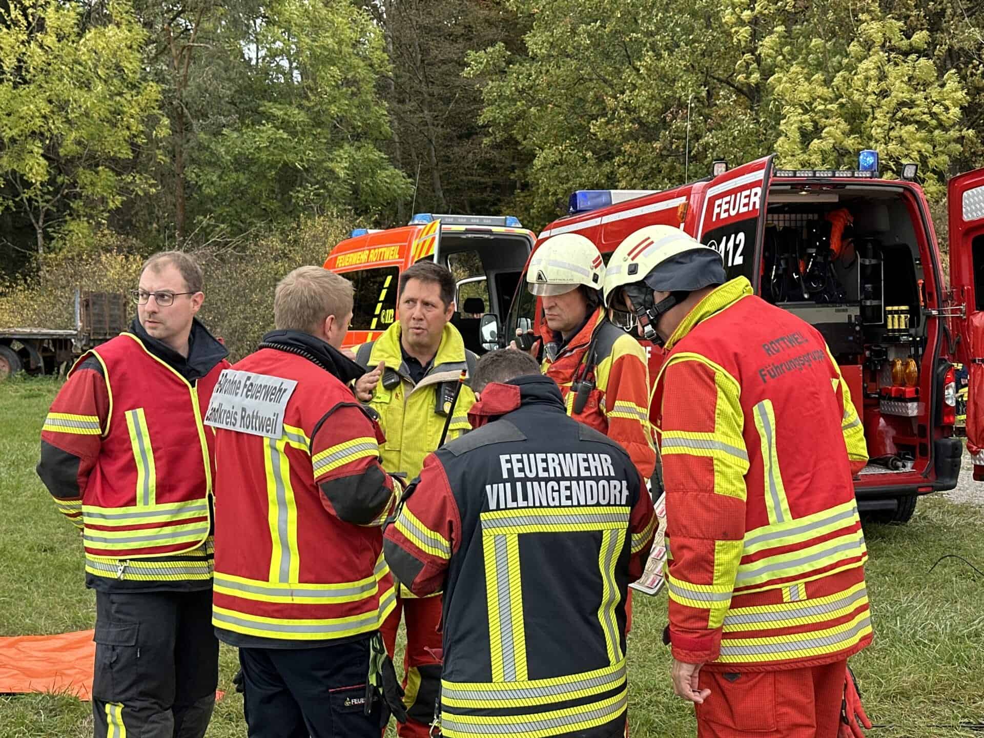 Die Feuerwehr Rottweil hat, wie berichtet, am Samstagnachmittag ihre Hauptübung 2023 abgehalten. Nach einem zuvor nicht öffentlich gemachten Plan probte sie das ganz große Programm mit mehr als 100 Beteiligten. Die Übung – obschon realistisch gehalten und ernsthaft angegangen – war zu allem Überfluss flankiert von zwei realen weiteren Einsätzen. Und beim insgesamt vierten sprang die Feuerwehr Wellendingen ein und leistete Überlandhilfe.
