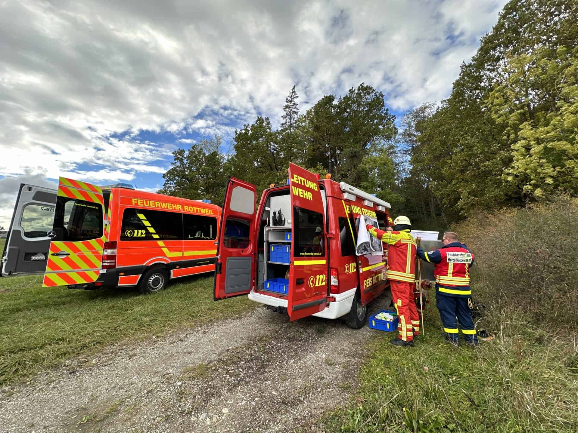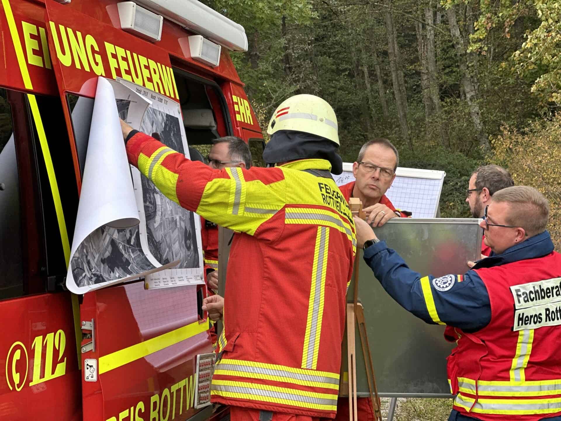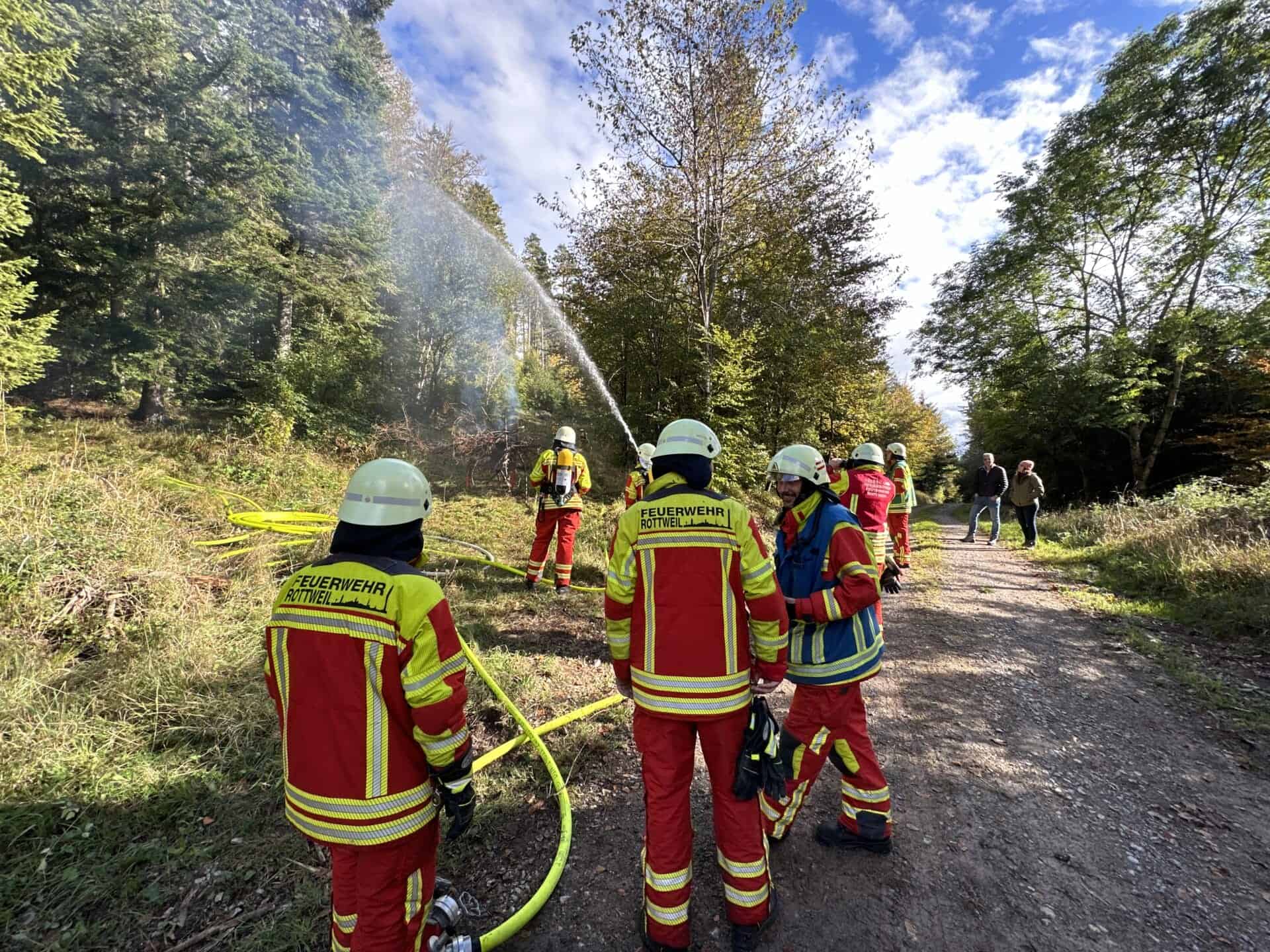 Die Feuerwehr Rottweil wurde zur Hauptübung am 21.10.23 um 14:09 Uhr mit dem Stichwort Vegetationsbrand klein alarmiert. Übungsannahme war eine unklare Rauchentwicklung aus einem Waldstück, die von einem Autofahrer von der Bundesstraße B27 gemeldet worden war. Eine erste Erkundung auch durch eine nachgeforderte Drohne ergab ein brennendes Waldstück zwischen Rottweil und Neukirch. Nach Erhöhung auf das Stichwort Brand Vegetation groß wurde Gesamtalarm für die Feuerwehr Rottweil ausgelöst.