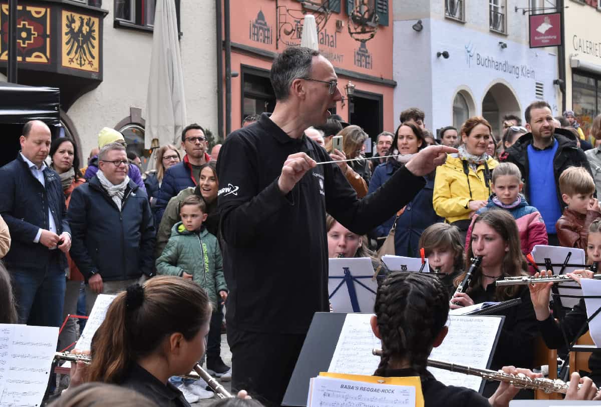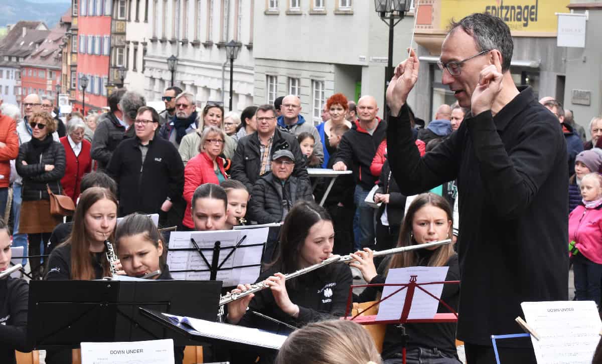 Nach vier Jahren endlich wieder Jazz in Town in gewohnter Form und ohne Einschränkungen, freute sich Busch vor gut über 200 Zuhörern. Ruf sprach seinen Dank aus an Busch, seinen Mitstreiter Claus Gams und alle die anderen Helferinnen und Helfer, die das Fest erst möglich machen. Er wünschte dem Fest, dass es nicht regnen möge. Und er stellte das traditionell zuerst auftretende Ensemble vor, die 70-köpfige Jugendkapelle der Stadtkapelle unter „Stadtmusikdirektor“ Johannes Nikol – dem ganz offiziell dieser Titel erst am 10. Mai verliehen werden soll, wenn der Gemeinderat zustimmt.
