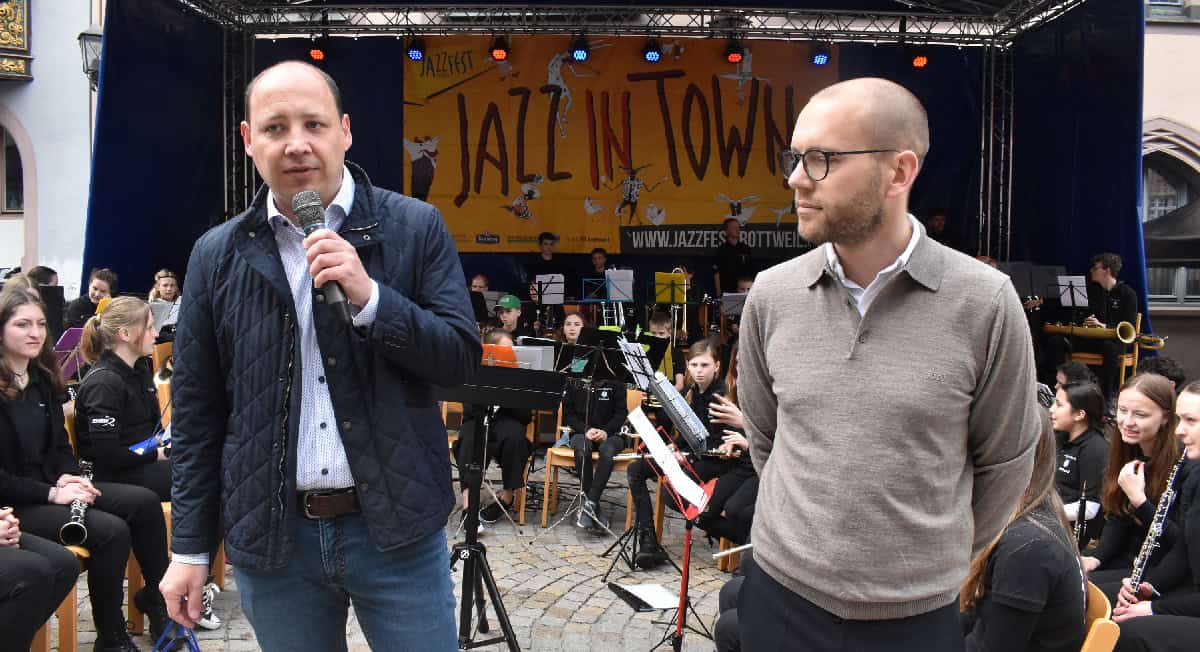 Rottweil – Punkt 16 Uhr heute gab es den Start: Gemeinsam eröffneten Simon Busch, der Vorsitzende des Jazzfestvereins, und Oberbürgermeister Dr. Christian Ruf das Jazzfest und dessen Auftakt „Jazz in Town“.