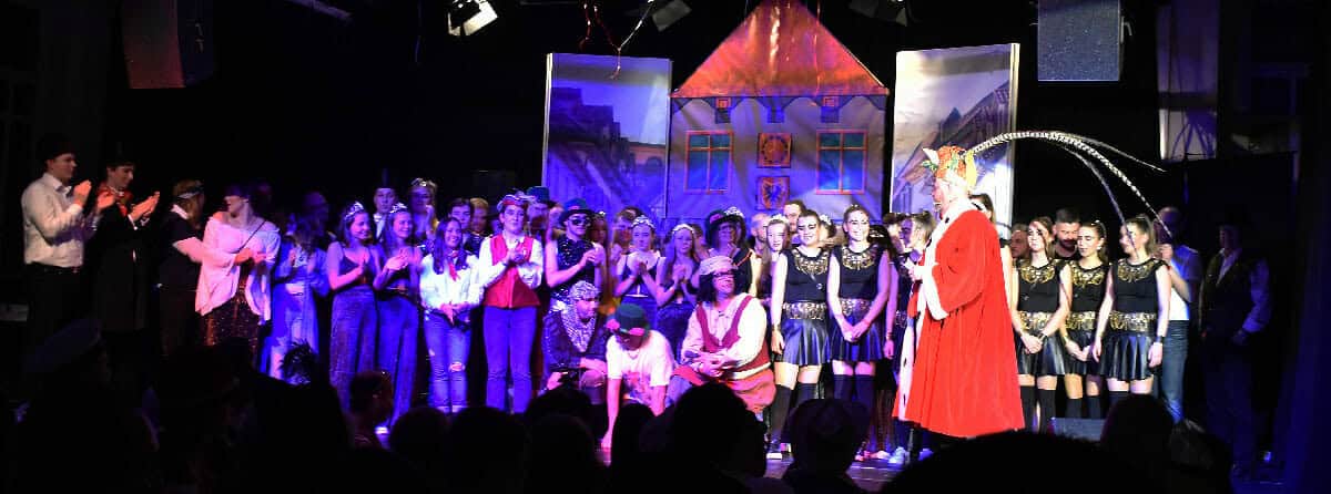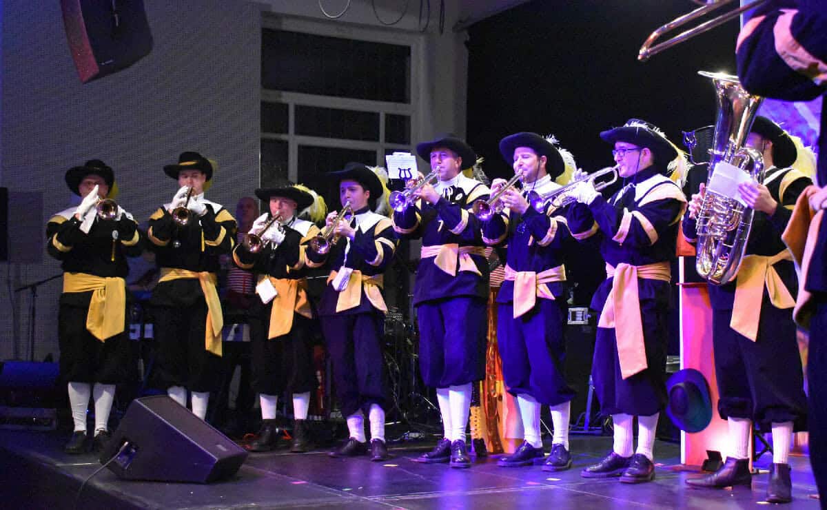 Bewährt ist der Einzug der Akteure zu den Marsch-Klängen der Stadtmusikanten und die Begrüßung durch den Oberelfer Stephan Drobny. Das Motto „Zeitreise“ hatte auch vor der Eintrittskarte nicht Halt gemacht, so erklärte Drobny das dort aufgedruckte Datum 22. Februar (das ist bekanntlich der Aschermittwoch). Wer auch immer es ihm glaubte…