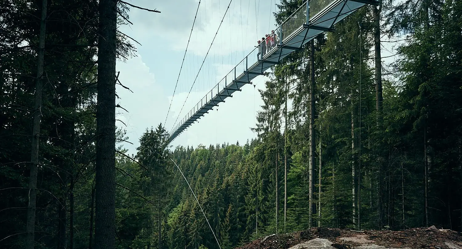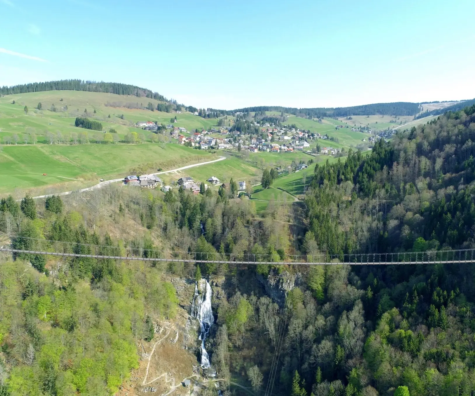 450 Meter Spannweite, 120 Meter über dem Talgrund. Allein die gut zu fassenden Eckdaten des Projekts sind beeindruckend. Der Laufsteg der Hängebrücke bietet einen Rundumblick von 360 Grad, sodass die einzigartige Natur um den Todtnauer Wasserfall aus der Vogelperspektive mit ganz neuen Eindrücken beobachtet werden kann. Technische Daten, die weniger greifbar erscheinen, sind Gewichtsangaben: 730 Tonnen Gesamtgewicht, der 1,20 Meter breite Laufsteg wiegt 55 Tonnen. 55 Tonnen Laufsteggewicht entspricht rund 50 Kleinwagen, die an den Tragseilen aufgehängt werden.