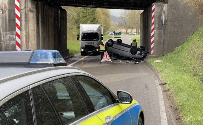 Ein Kleinwagen war auf der Fahrt Richtung Rottweil-Saline zunächst rechts gegen die Mauer einef Bahnunterführung geprallt. Dann wurde der Wagen auf die Gegenspur geschleudert – und um die eigene Achse gedreht. Auf dem Dach blieb er völlig demoliert liegen.