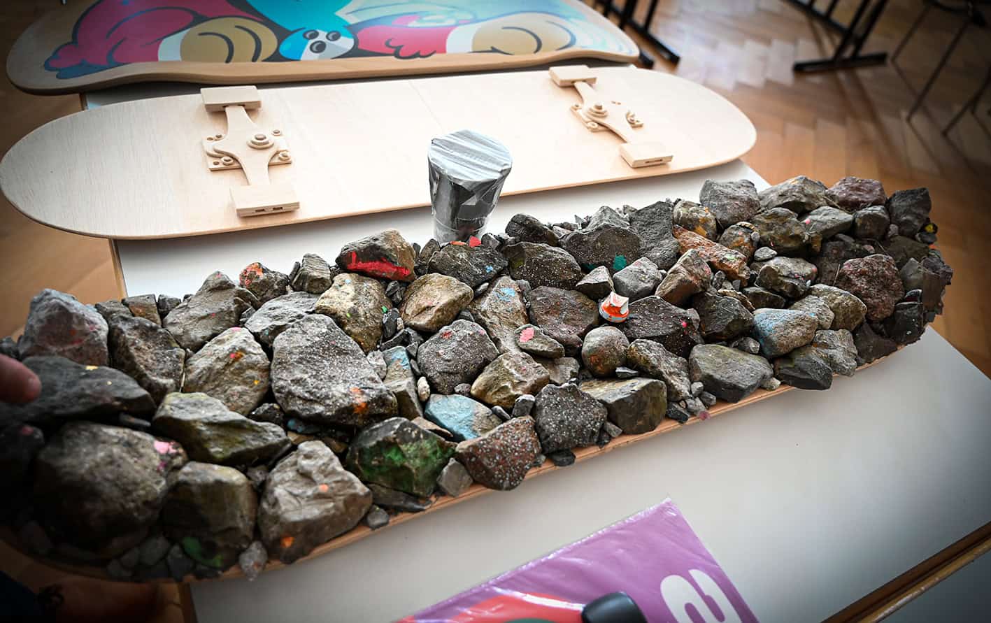 Ein Urban Artist zum Beispiel hat sein Brett komplett mit kleinen Steinen beladen. Wie ein Containerschiff im Bonasi-Format sieht es aus. Aber die Pointe liegt woanders: Jeder Stein hätte eine Geschichte zu erzählen, denn er wurde bei einer Spray-Aktion eingesammelt – kleine Farbspritzer zeugen davon.