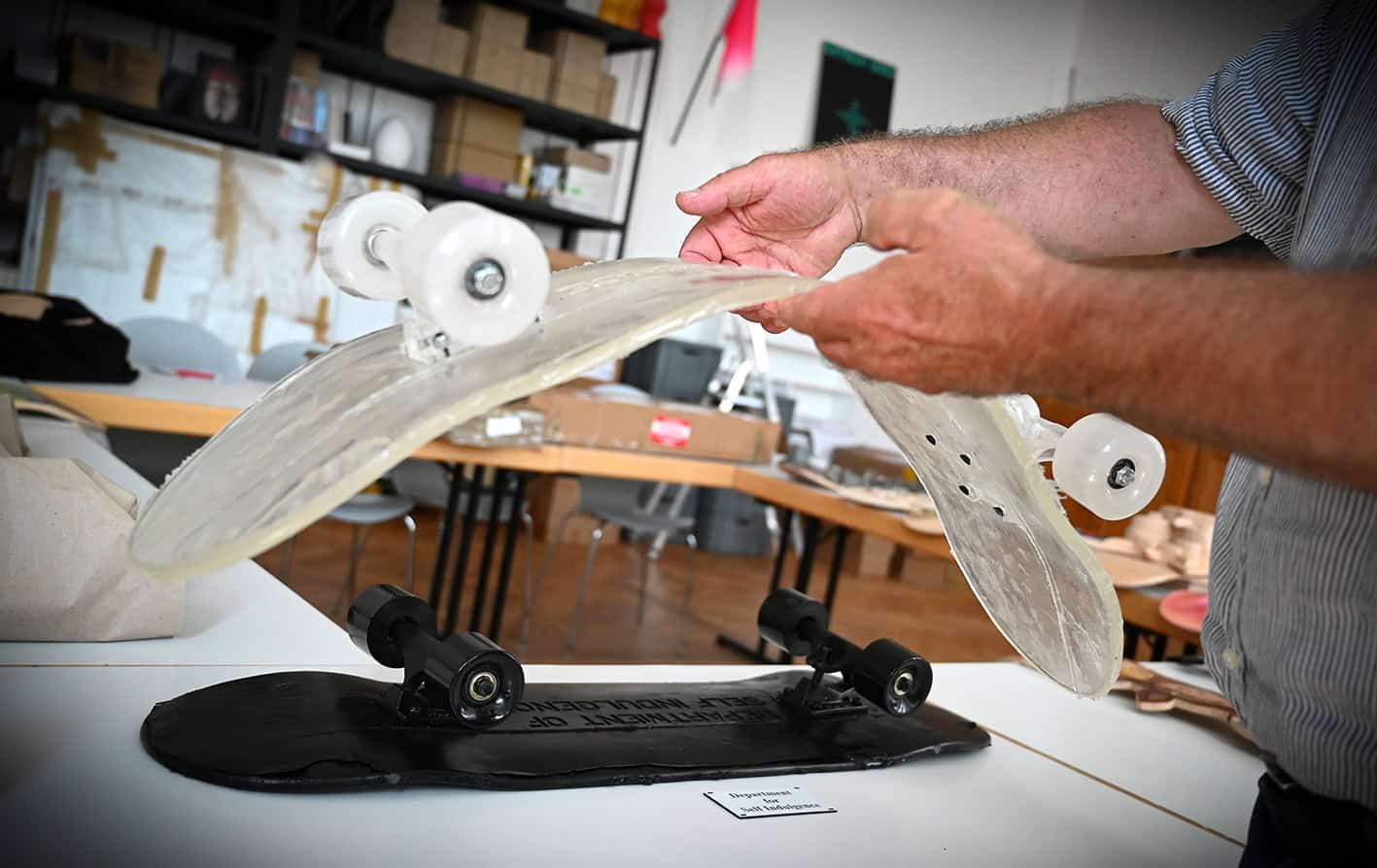 Aus einem anderen Brett wächst grimassierend ein Gesicht heraus – und erinnert an die spöttisch gestalteten Wasserspeier an gotischen Kirchen. Ein anderes Deck wirkt wie eine Landefläche für üppige Figürchen von Nike de Saint Phalle. Auch mit dem Brett des Stuttgarter Künstlers Thomas Putze ließen sich keine Runden mehr drehen: Er hat es brachial dreigeteilt und wie auf ein Totenbett aufgebahrt.