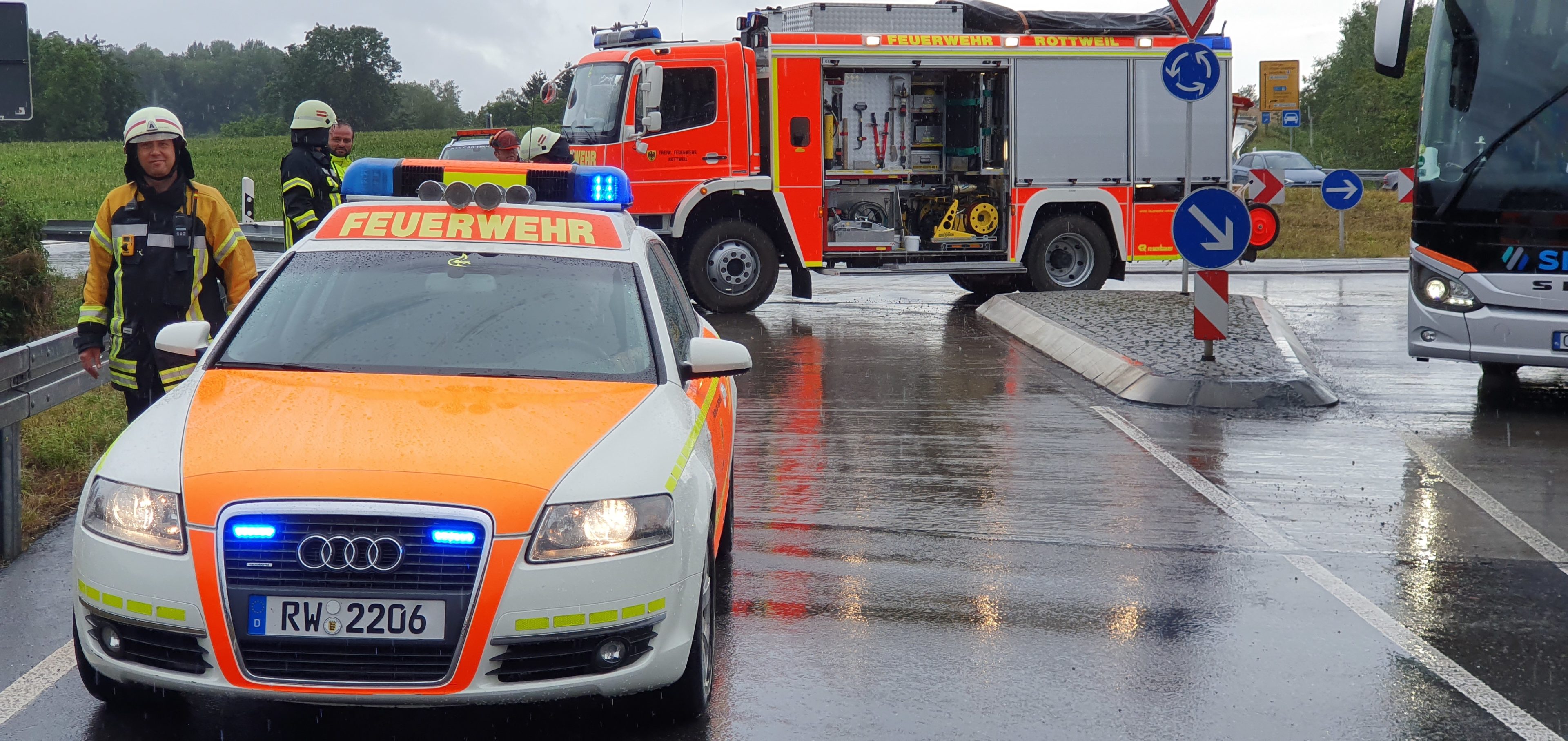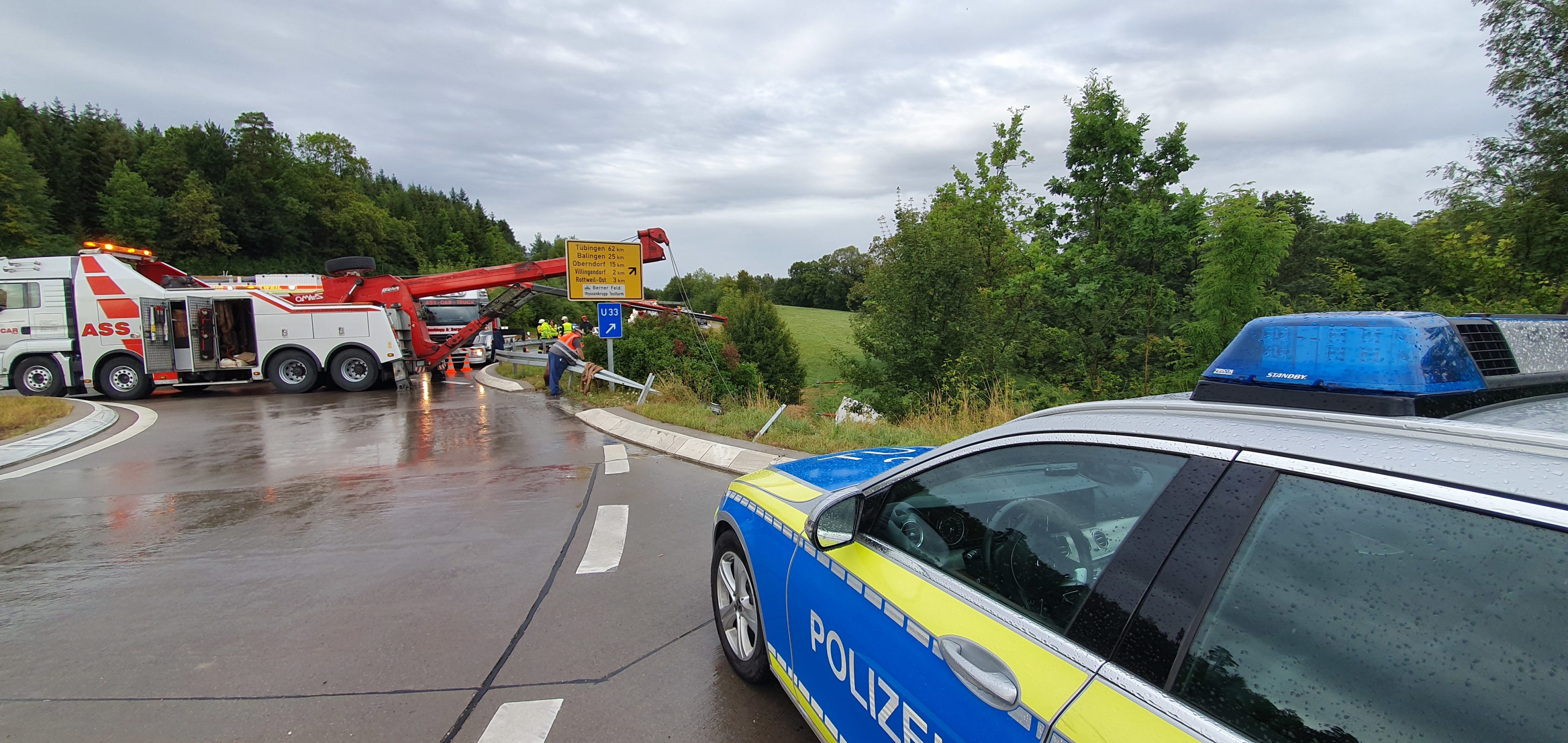 An einem Kreisverkehr bei Rottweil ist am späten Nachmittag ein Lkw abgestürzt. Der Fahrer wurde leicht verletzt. Die Bergungsarbeiten dauerten bis zum Abend, es haben sich lange Staus gebildet. Die Polizei riegelte die Unfallstelle teilweise, etwa von Rottweil aus, ab, leitete den Verkehr über die betroffene Bundesstraße selbst aber einspurig vorbei.