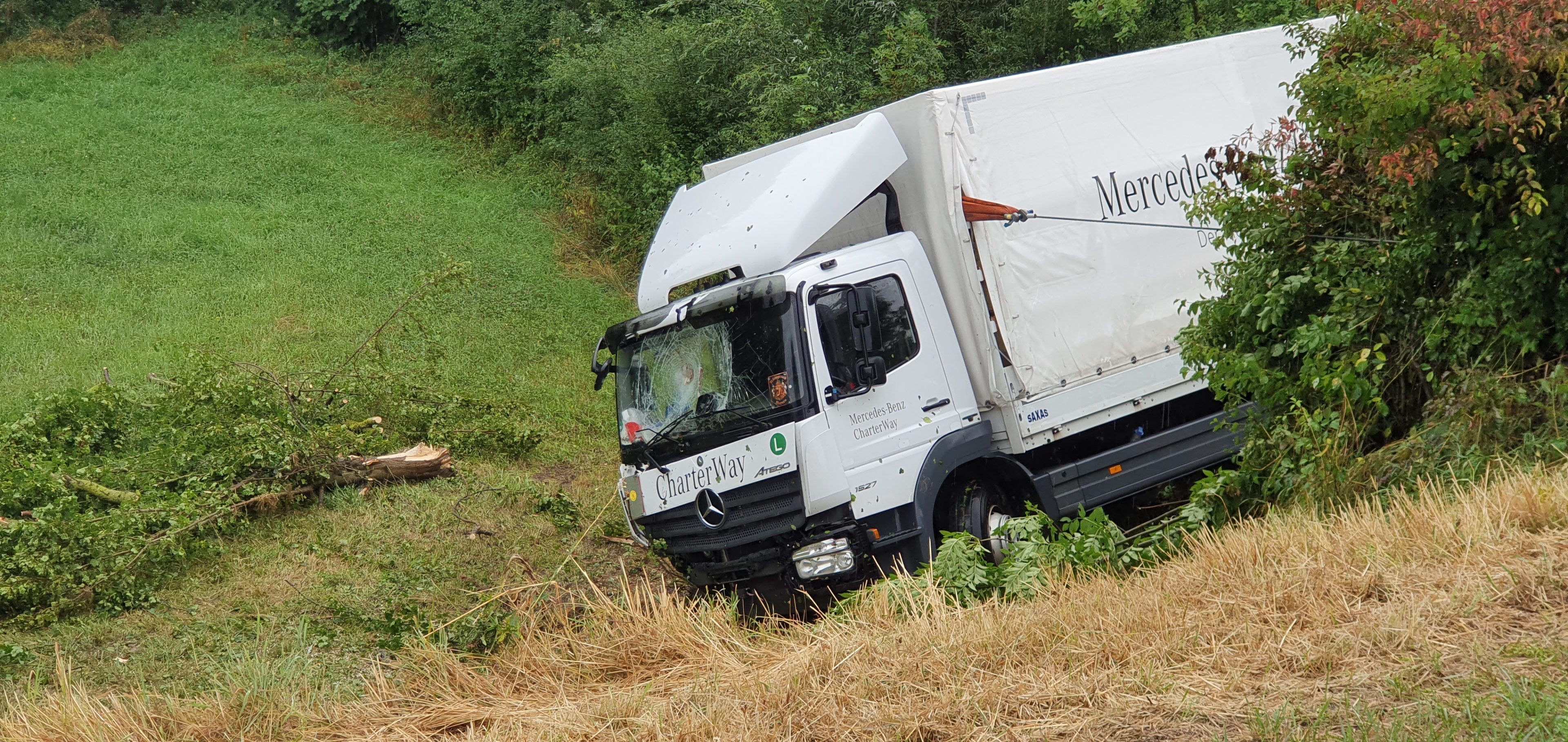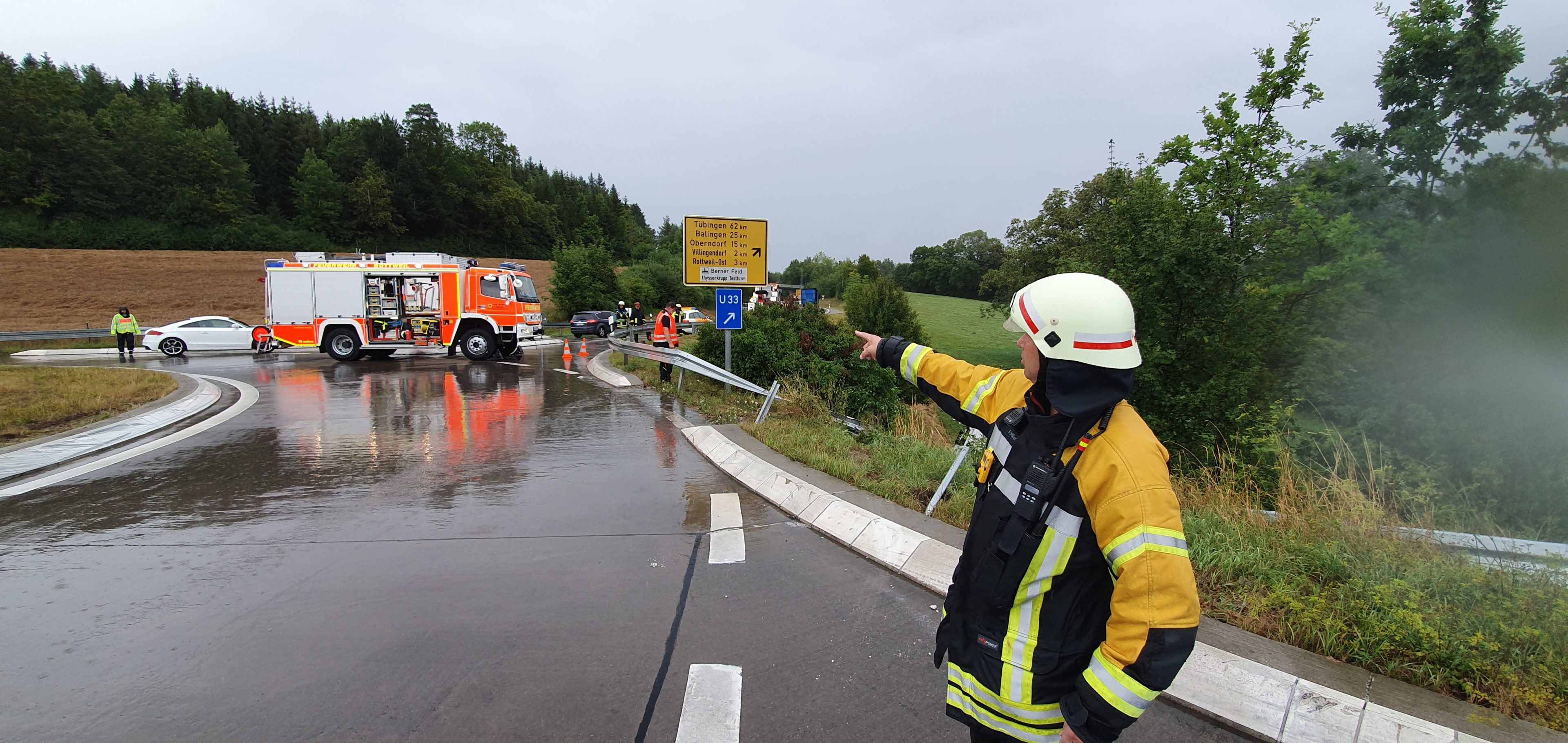 Der Unfall ereignete sich an der B 14-Umfahrung. Von der B 462 kommend, war der Fahrer eines Lasters offenbar zu schnell unterwegs. Er verlor bei regennasser Fahrbahn die Kontrolle über sein Fahrzeug. Der Lkw kam noch im Kreisverkehr nach rechts von der Fahrbahn ab und stürzte eine Böschung hinab. Dabei krachte ein Baum in die Frontscheibe. Den Baum fällte die Feuerwehr später, um den Lkw bergen zu können.