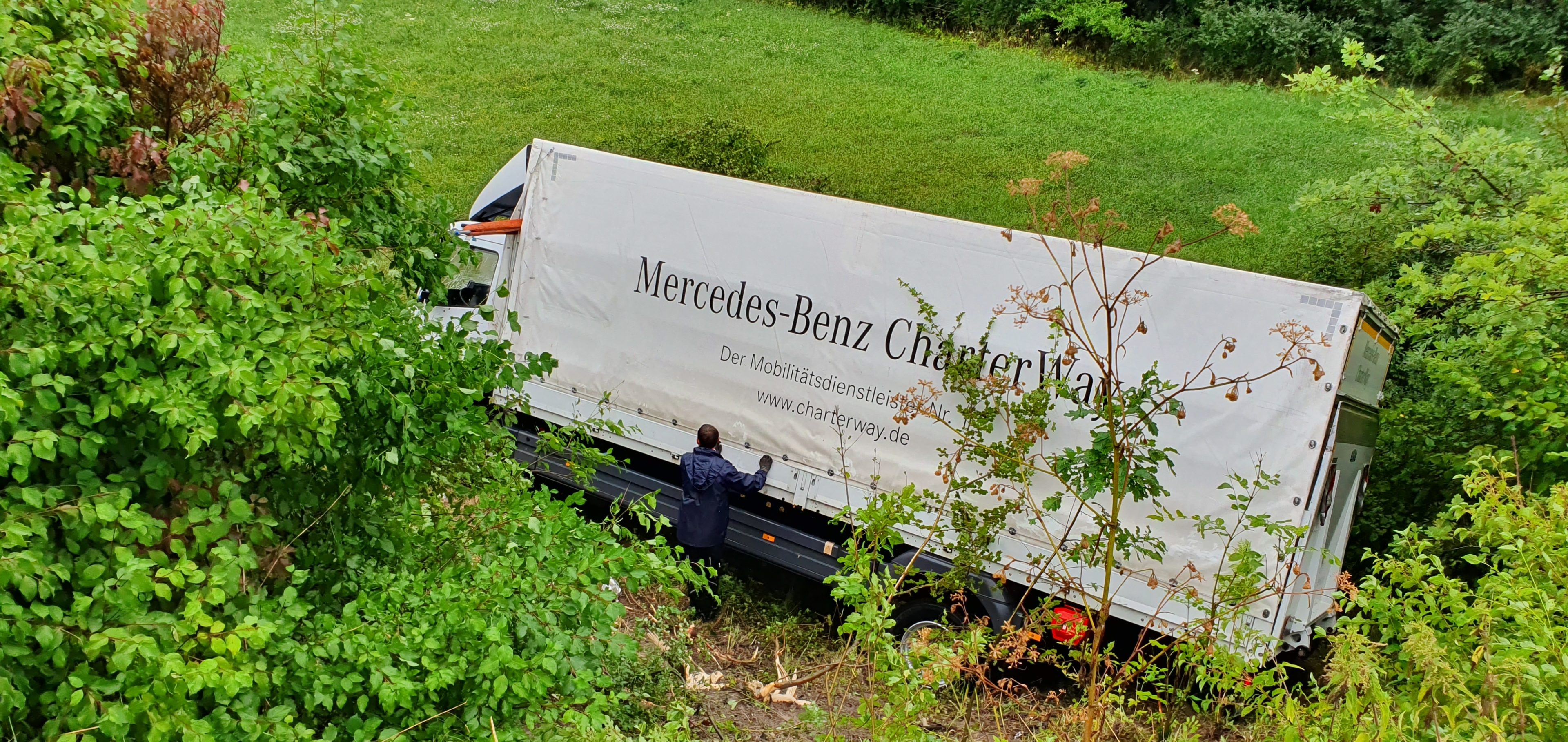 Die Einsatzkräfte bargen dann gemeinsam den Lkw. Dazu arbeitete die Feuerwehr eng mit den Mitarbeitern des Abschleppunternehmens zusammen. Der Laster wurde aus seiner misslichen Lage befreit, stabilisiert und dann der Topographie folgend wieder Richtung Straße gezogen.