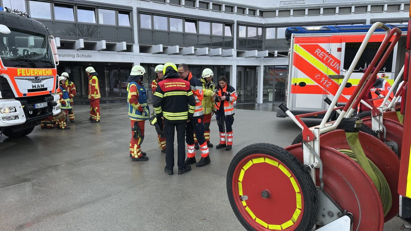 Die Schülerinnen und Schüler haben das Gebäude zu Einsatzbeginn offenbar bereits verlassen. Zunächst war die Rottweiler Feuerwehr von Schulleiter Ingo Lütjohann gerufen worden, wie dieser der NRWZ sagte, um das Gebäude zu belüften. Laut dem Einsatzleiter der Feuerwehr, Stadtbrandmeister Frank Müller, hätten sich dann immer mehr Schüler gemeldet, die über Beschwerden klagten. „Rote Augen, Husten“. Die Leitstelle habe auf „ManV“ erhöht – einen sogenannten Massenanfall an Verletzten. Das DRK rückte daraufhin mit haupt- und ehrenamtlichen Kräften an, inklusive eines Rettungswagens. Auch ein Notarzt ist eingetroffen. Feuerwehrkommandant Müller schätzte die Zahl der Betroffenen insgesamt auf etwa zehn, das DRK bestätigte dies am Montag, die Polizei korrigierte diese Zahl in ihrem Bericht auf neun.