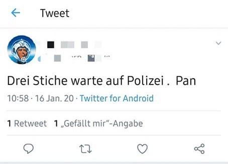 Uwe B. twittert dann allerdings selbst wieder: „Drei Stiche warte auf Polizei“. Wieder „unterzeichnet“ er mit „Pan“. Was er damit meint, bleibt unklar, sein Profilfoto auf Twitter ähnelt dem echten Uwe B. gar nicht, es zeigt einen behelmten Mann mit scharfen Gesichtszügen, ganz anders, als der 58-Jährige wirklich aussah. Es zeigt Perry Rhodan, den Sience-Fiction-Held.