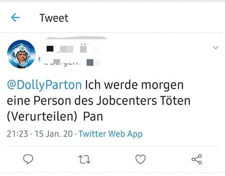 Es sind verstörende Worte, die auch einen Tag nach dem Messerattentat auf der Social-Media-Plattform Twitter zu finden sind (nicht im Account des mutmaßlichen Täters Uwe B., dieser ist gesperrt worden): „Ich werde morgen eine Person des Jobcenters töten (Verurteilen) Pan“, schrieb er am Mittwoch, 15. Januar, um 21.23 Uhr, der Screenshot liegt der NRWZ vor. Einen Tag darauf macht er seine Drohung offenkundig wahr.