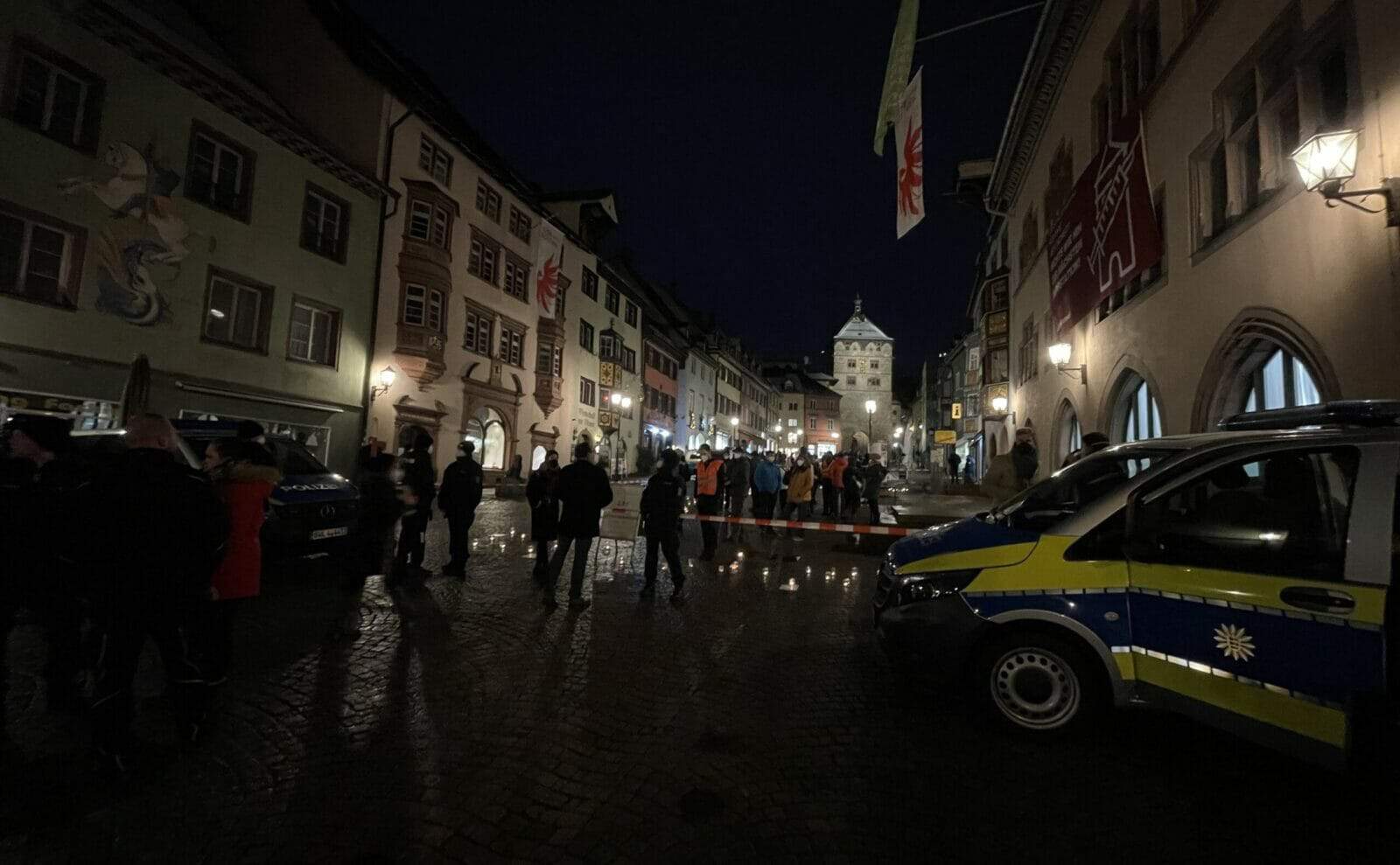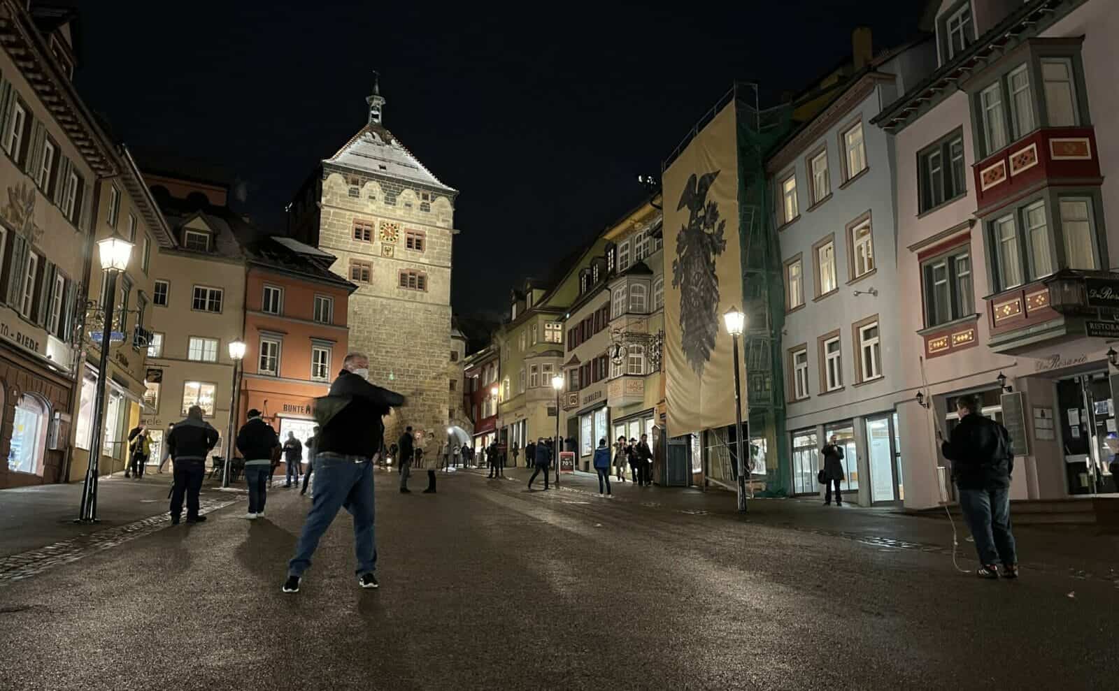 Unter dem Knallen der Peitschen vom Schwarzen Tor herab sammelten sich die „Spaziergänger“ schließlich gegen 19 Uhr im unteren Bereich der Oberen Hauptstraße. Die historische Innenstadt von Rottweil war damit weiterhin dreigeteilt, die Polizisten zeigten sich entspannt. Die Demonstration endete erneut im Applaus und Jubel der Teilnehmenden für sich selbst, während weitere Demonstranten nachrückten. Untermalt von einem wütenderen Peitschenknalllen einige Meter entfernt.
