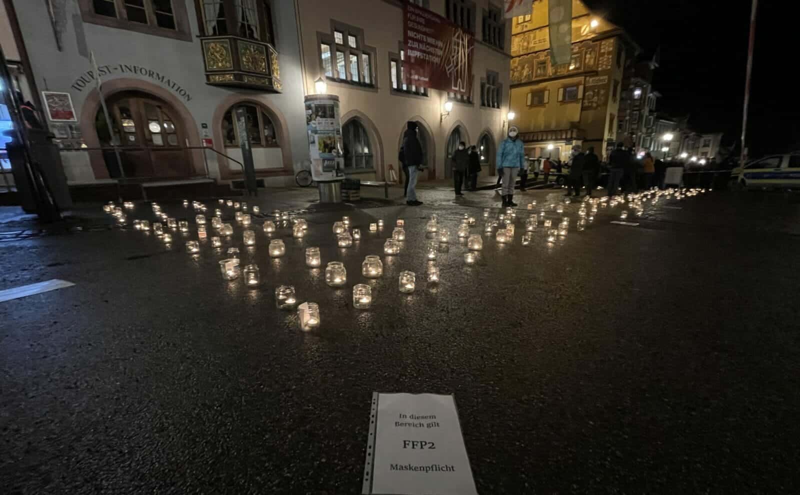 Für Montagabend hatte sich zudem eine Mahnwache angekündigt. Dies – im Gegensatz zu den Spaziergängern – ganz offiziell im Vorfeld bei der Stadtverwaltung. Die Teilnehmenden wollten an die derzeit 235 Coronatoten im Landkreis Rottweil erinnern, eine Kerze für ein jedes Opfer anzünden. Zunächst war es ein Geheimnis, wer hinter dieser Mahnwache steckte. Am Montagnachmittag meldete sich eine der Initiatorinnen und Initiatoren bei der NRWZ. Es handelt es sich um Elke Reichenbach, Stadträtin von Forum für Rottweil. Für die Aktion hat sie sich zusammengetan mit Peter Bruker, stellvertretendem Vorsitzenden der Vorstandsmitglied des Grünen-Kreisverbands.