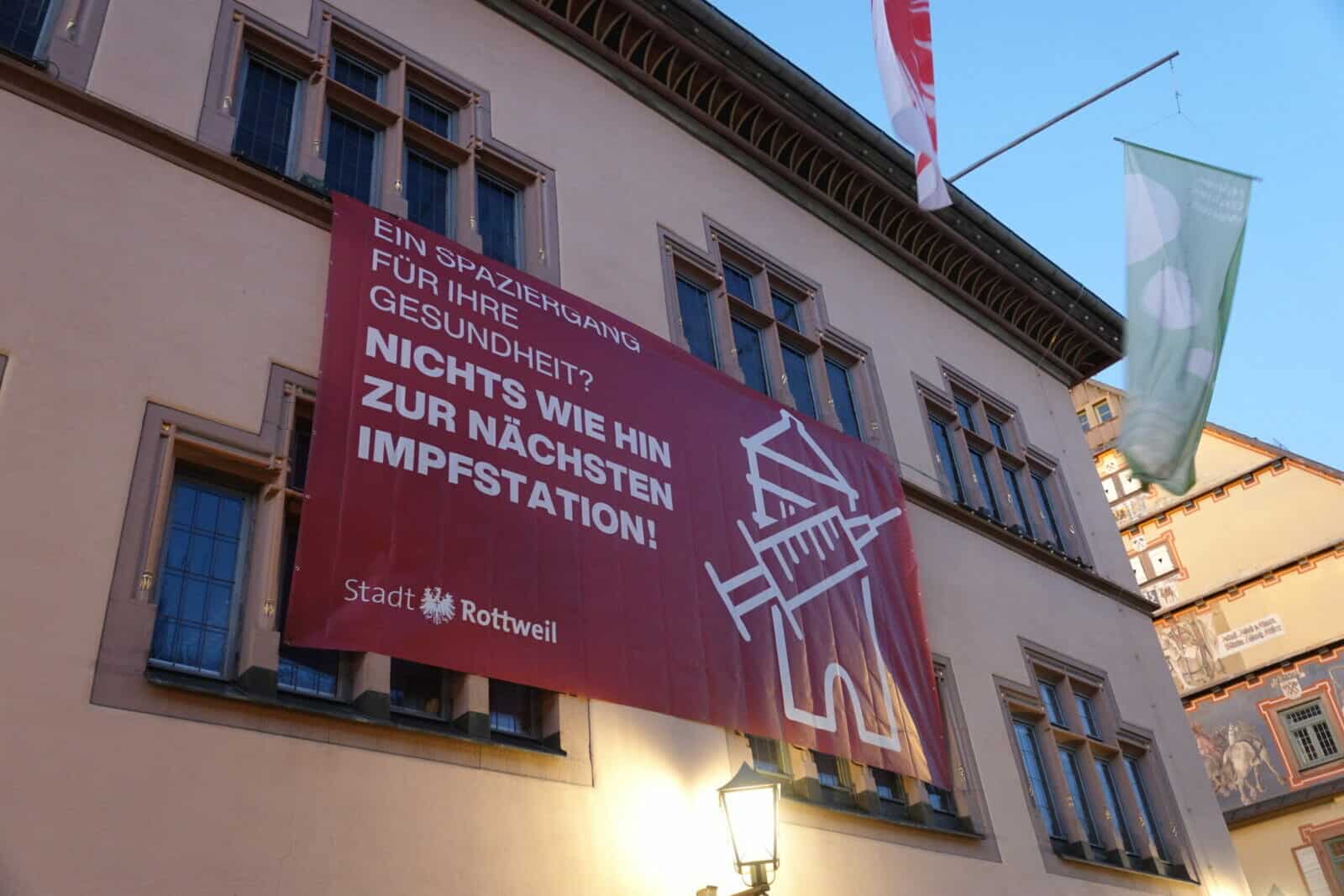 Unter dem Motto „Corona ist kein Spaziergang“ appellierte die Stadtverwaltung Rottweil an die Bürger, nicht an den „‚Spaziergängen‘ von Kritikern der Schutzmaßnahmen und der Impfungen durch unsere Innenstadt“ teilzunehmen. „Gerne dürfen Sie Ihre Meinung äußern, aber wählen Sie bitte einen anderen Weg“, so die Stadtverwaltung. Dem schloss sich etwa der Vorstand der Volksbank Rottweil an, wie an den Fenstern seit Sonntag zu sehen.