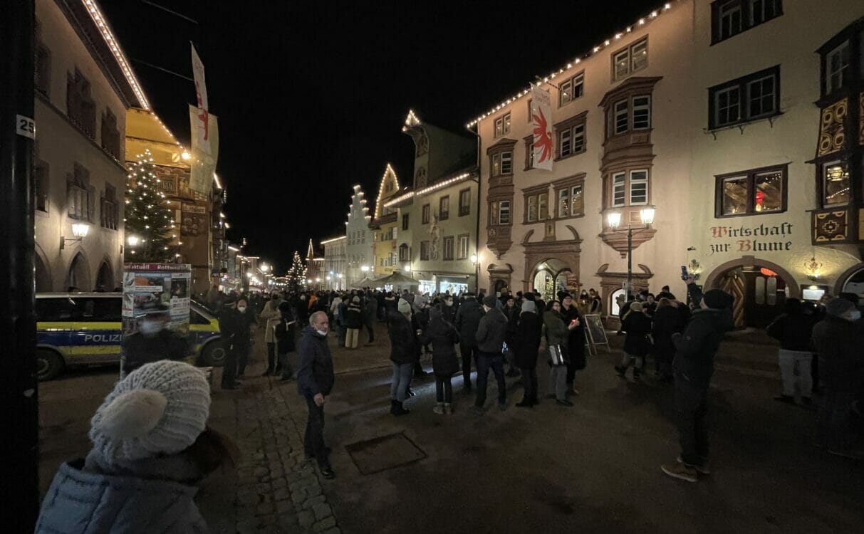 Mehr Teilnehmende und mehr Polizei – bereits die zweite Auflage des Lichterspaziergangs in Rottweil, der neuen Montagsdemo gegen die Corona-Maßnahmen, hat stattgefunden. Einen Zwischenfall gab es: eine Beißerei zwischen Hunden. Ansonsten blieb es friedlich. Die Polizei hätte sich allerdings mehr Fairness gewünscht. Sie griff in Rottweil nicht durch, in Singen etwa schon. Update: Auch ein Rottweiler Einzelhändler bezeichnet die Spaziergänge als unfair. Sie schadeten dem Handel.