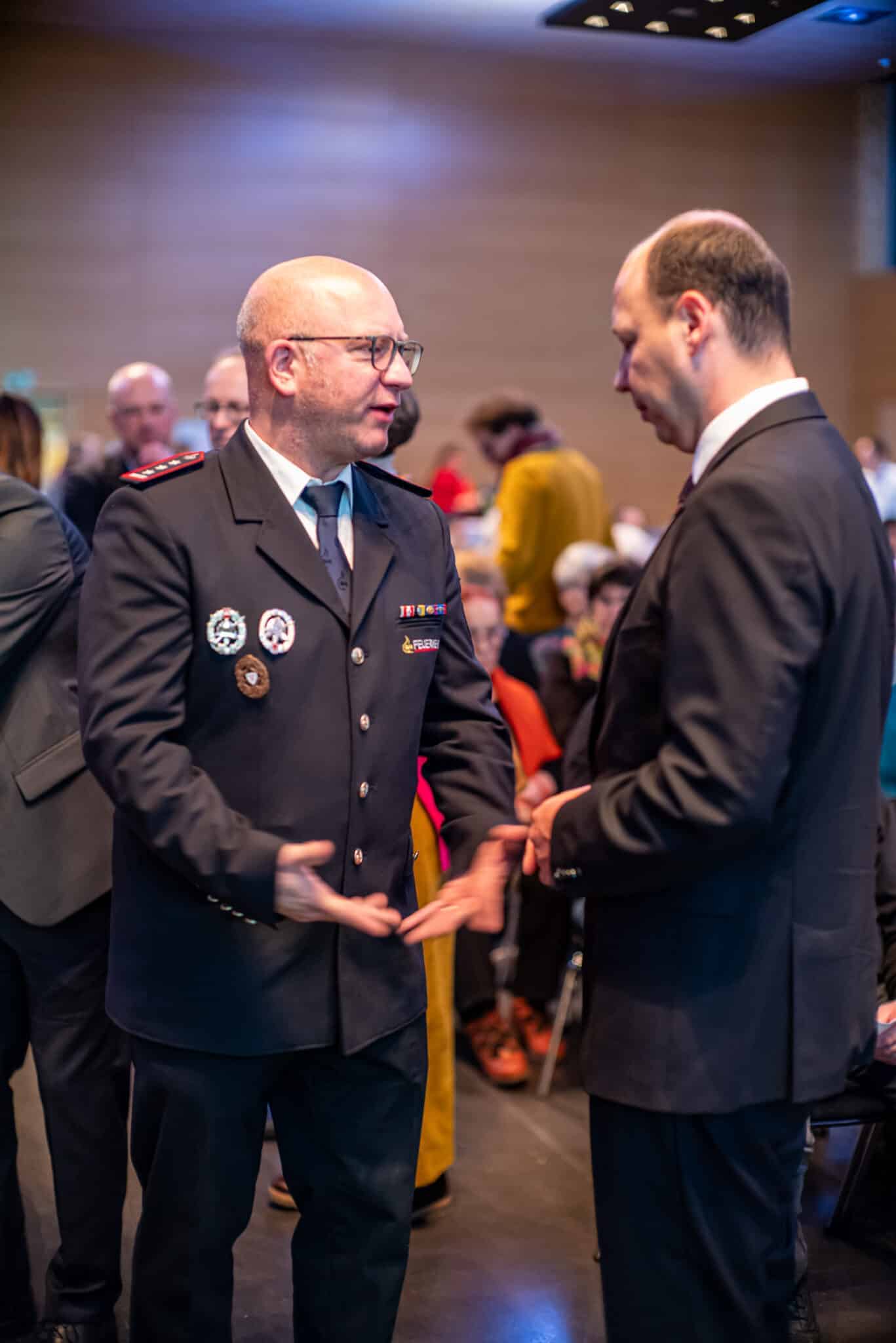 Ruf, der über die Wahlkampfzeit und während der beruflichen Doppelbelastung als Ober- und Bürgermeister abgenommen hat, trat in einem schwarzen Anzug mit bordeaux-farbener, leicht gemusterter Krawatte vor sein Publikum. Mit fester, klarer Stimme, fast ohne Versprecher, oft mit einem Lächeln, manchmal einem Strahlen, sprach er rund eine Dreiviertelstunde lang. Er erntete bisweilen Zwischenapplaus und vereinzelte Lacher. Zeigte sich als Mann, der den gesamten Bereich zwischen Späßchen und Ernst auszufüllen vermag. Zu den Lauschenden gehörten etwa auch seine Amtsvorgänger Ralf Broß und Thomas J. Engeser, der Bürgermeister a.D. Franz Albrecht.