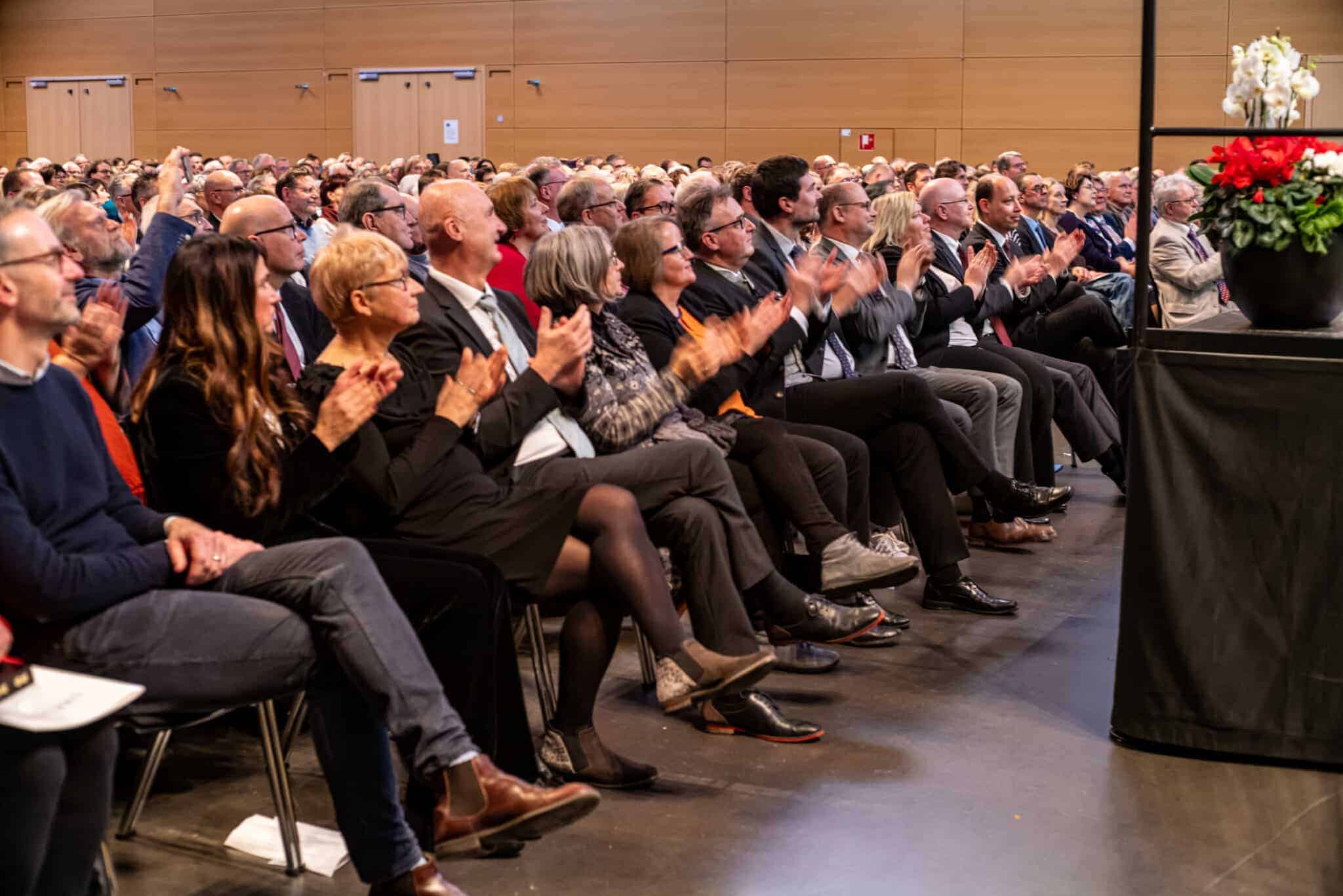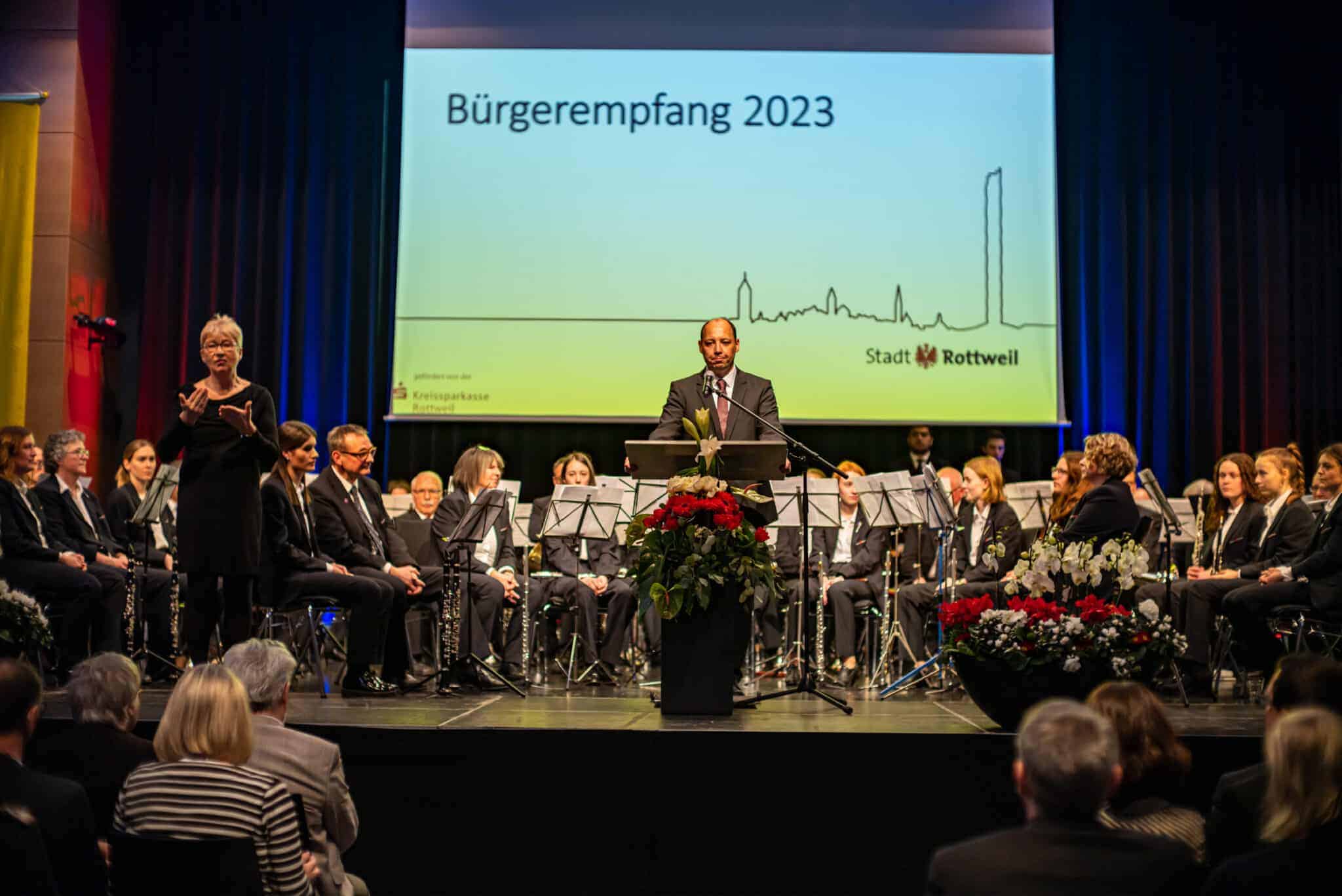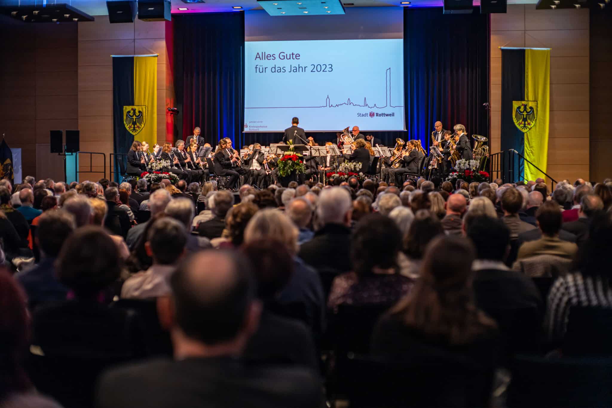 Das Interesse an seinem, am Neujahrsempfang der Stadt Rottweil, war groß. So groß, dass kurz vor Beginn noch dutzendweise Stühle in die bis dahin nur zu drei Vierteln bestuhlte Stadthalle gekarrt werden mussten. Was in Stadt und Landkreis Rang und Namen hat, aber auch, wer sich für den neuen Oberbürgermeister interessierte, war da. Die Stadtkapelle Rottweil umrahmte den Abend gekonnt und festlich unter der Leitung von Johannes Nikol. „Gut gespielt, schön!“, lautete ein individueller, aber vermutlich mehrheitsfähiger Kommentar im Publikum. Nikol und seine Musikerinnen und Musiker brachten das Publikum sogar dazu, „Verdamp lang her“ zu singen und mitzuklatschen. Und zu jubeln. Und eine Zugabe zu verlangen – es wurde der Narrenmarsch, laut Nikol anlässlich des Kindernachmittags der Narrenzunft Rottweil, der am gleichen Tag stattgefunden hat. Sehr zur Freude zur Anwesenden.