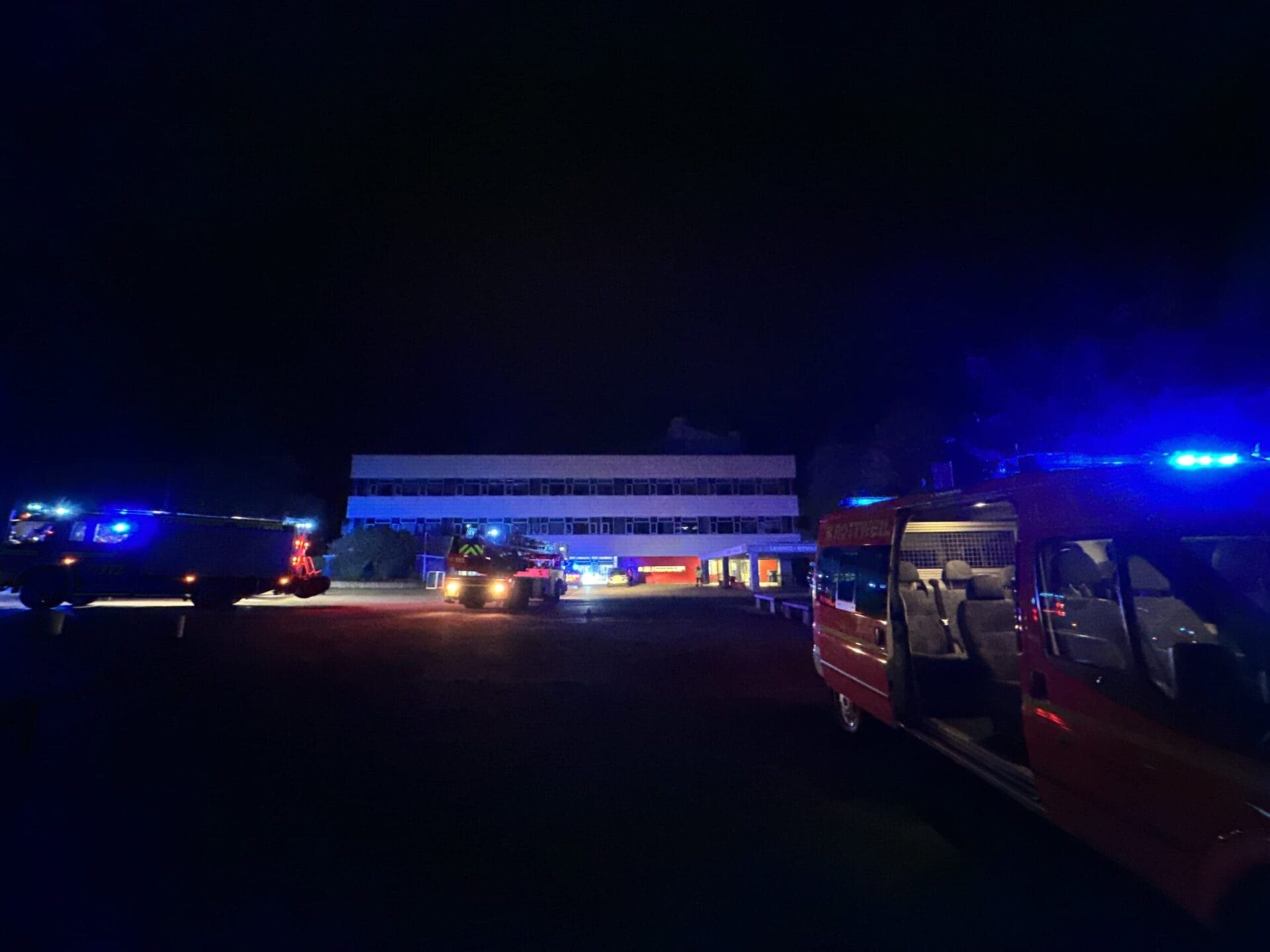 Nur wenige Minuten später dann die Entwarnung. Die Brandmeldeanlage wurde zurückgesetzt. Erkennbar daran, dass die durchdringende Lautsprecherdurchsage abrupt endete. Diese hatte gemeldet: „Achtung, Achtung! Aufgrund eines technischen Defektes bitten wir alle Klassen, ihre Räume sofort zu verlassen. Bitte geht ruhig und geordnet auf den Schulhof und haltet euch an die Anweisungen eurer Lehrer.“ Natürlich tat das niemand. Es sind Ferien, es war Nacht. Keine Schülerin und kein Schüler war in dem Gebäude.