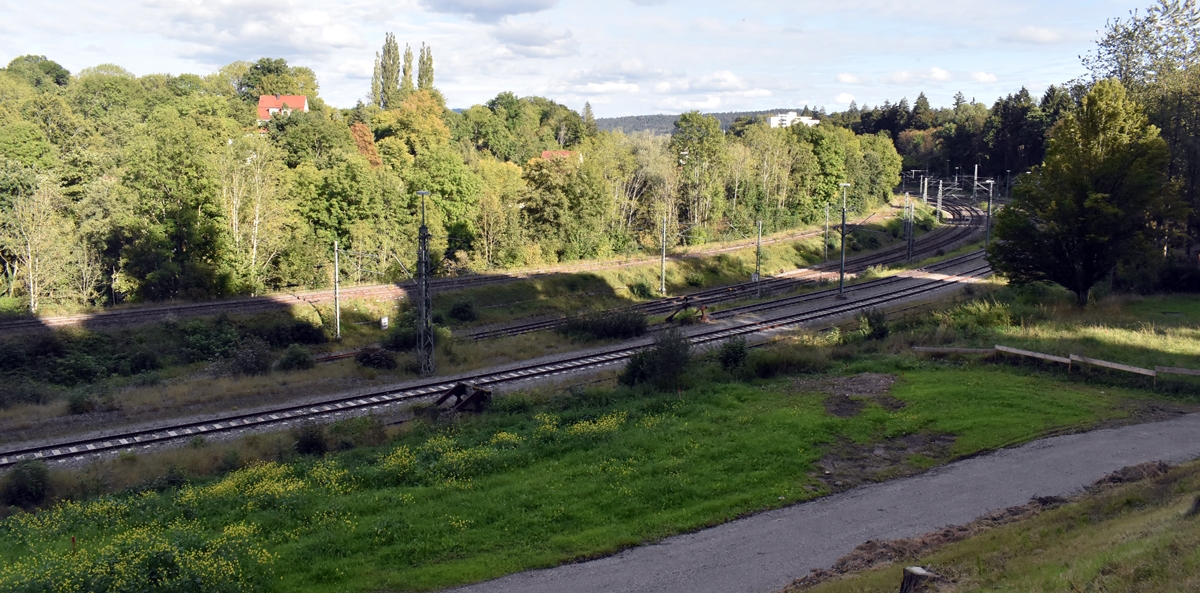 „Eine Gesetzesänderung hilft auch der Landesgartenschau“, sagte OB Ruf hier (und auch einen Tag später beim Spatenstich): Eine Säule der LGS-Brücke soll an den Platz kommen, wo jetzt noch Schienen sind. Das ganze Stück hatte die Stadt schon zuvor von der Bahn gekauft. Dann aber gab es vom Eisenbahnamt keine Genehmigung für den Bau, weil ein Gesetz das verhinderte. Rechtzeitig hat der Bundestag inzwischen das Gesetz geändert, so dass dem Bau der Brücke erst mal nichts im Wege stehe.