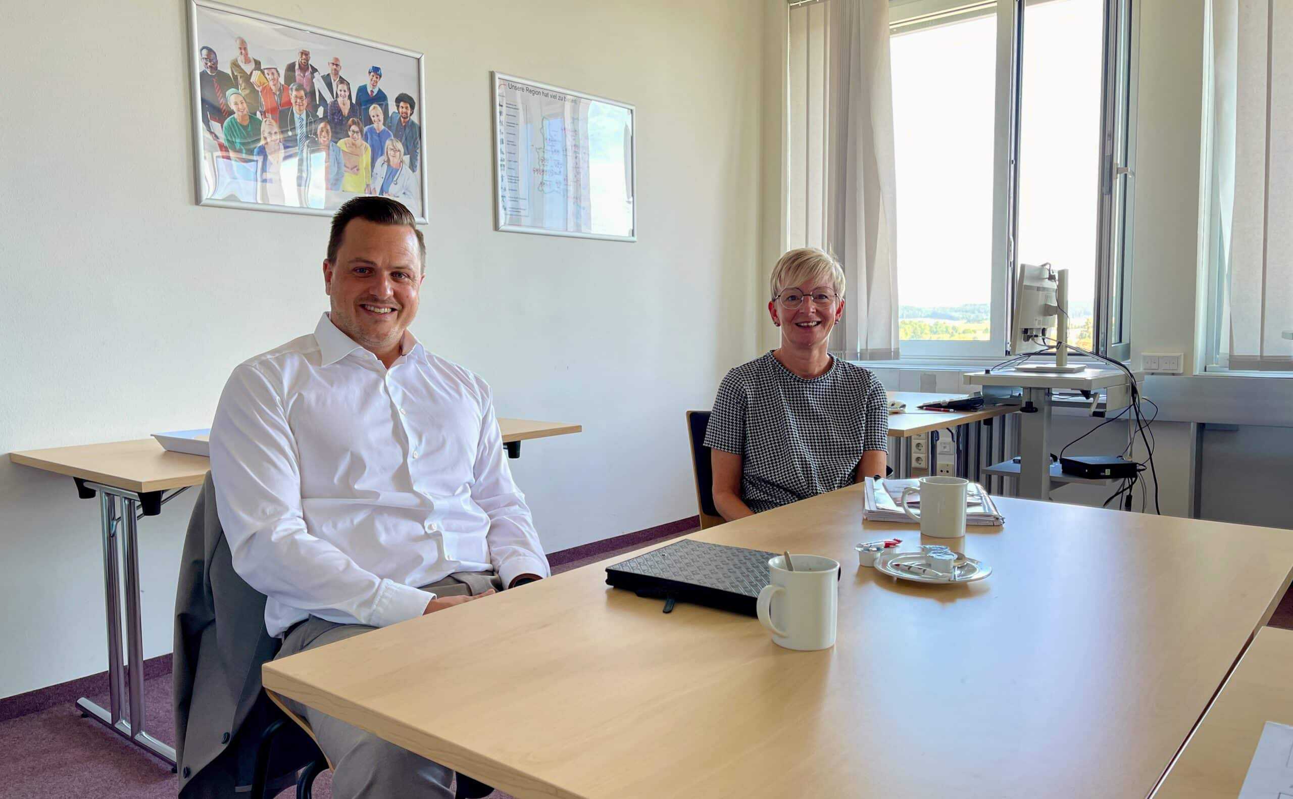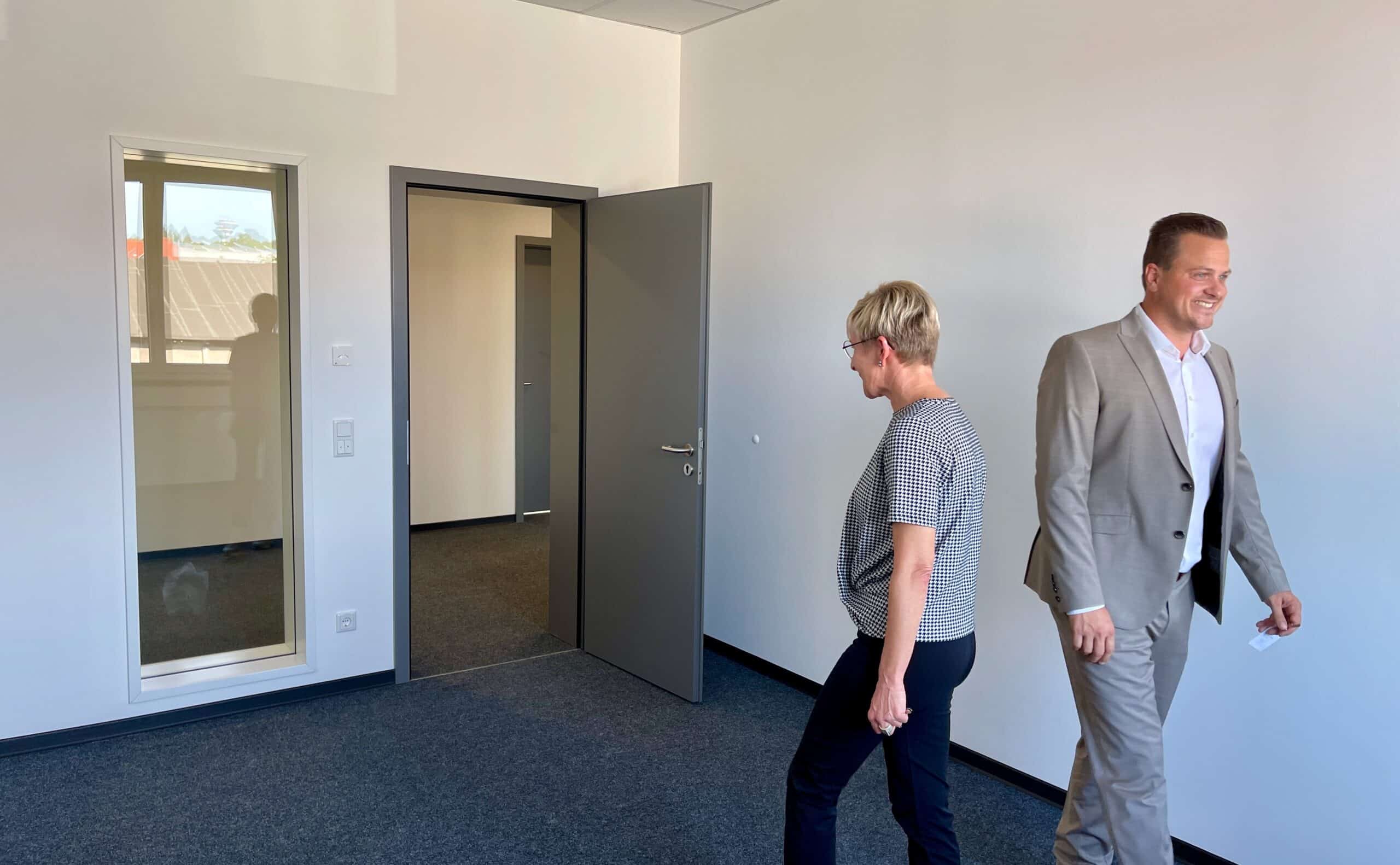 Simone Zeller erinnert sich: „Anfang 2017 war klar, dass sich etwas ändern muss“, sagt die Jobcenter-Geschäftsführerin an diesem Mittwochmorgen im Gespräch mit der NRWZ. Sie hat ausnahmsweise Zeit dafür, Mittwoch ist das Jobcenter für den Publikumsverkehr geschlossen. Sie habe sich 2018 auf die Suche nach einem Bestandsgebäude gemacht, in das sie mit ihren 40 Mitarbeiterinnen und Mitarbeitern vor Ort – inklusive den Zweigstellen in Oberndorf und Schramberg sind es 70 – würde umziehen können. Und dann kam die „glückliche Fügung“, wie Zeller sagt. In Person von Philipp Merz vom gleichnamigen Rottweiler Wohnbauunternehmen. „Es war Herbst, als wir uns das erste Mal trafen“, erinnert sich Zeller, 2019, wohl, ergänzt Merz, der auch an diesem Gespräch mit der NRWZ teilnimmt.