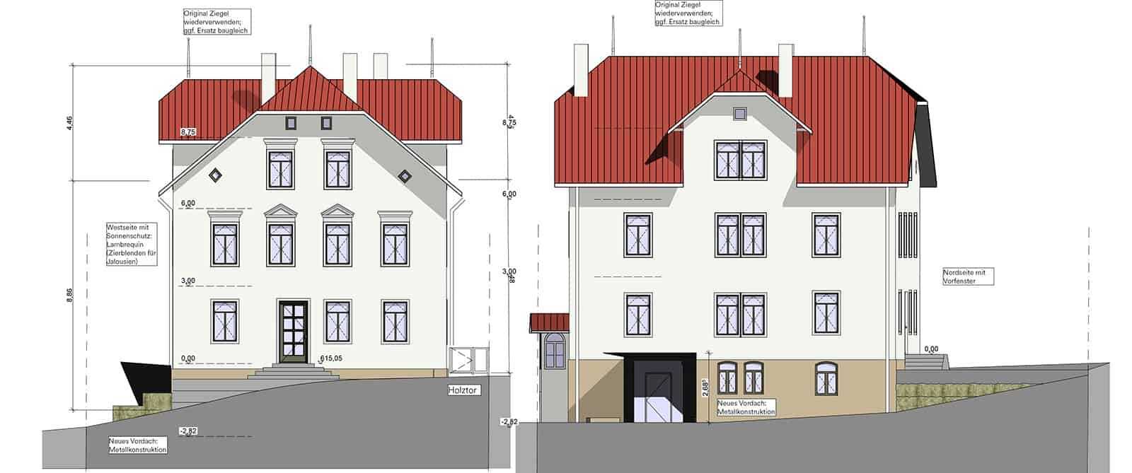Ansichten des sanierten Gebäudes. Quelle: Architekturbüro frw