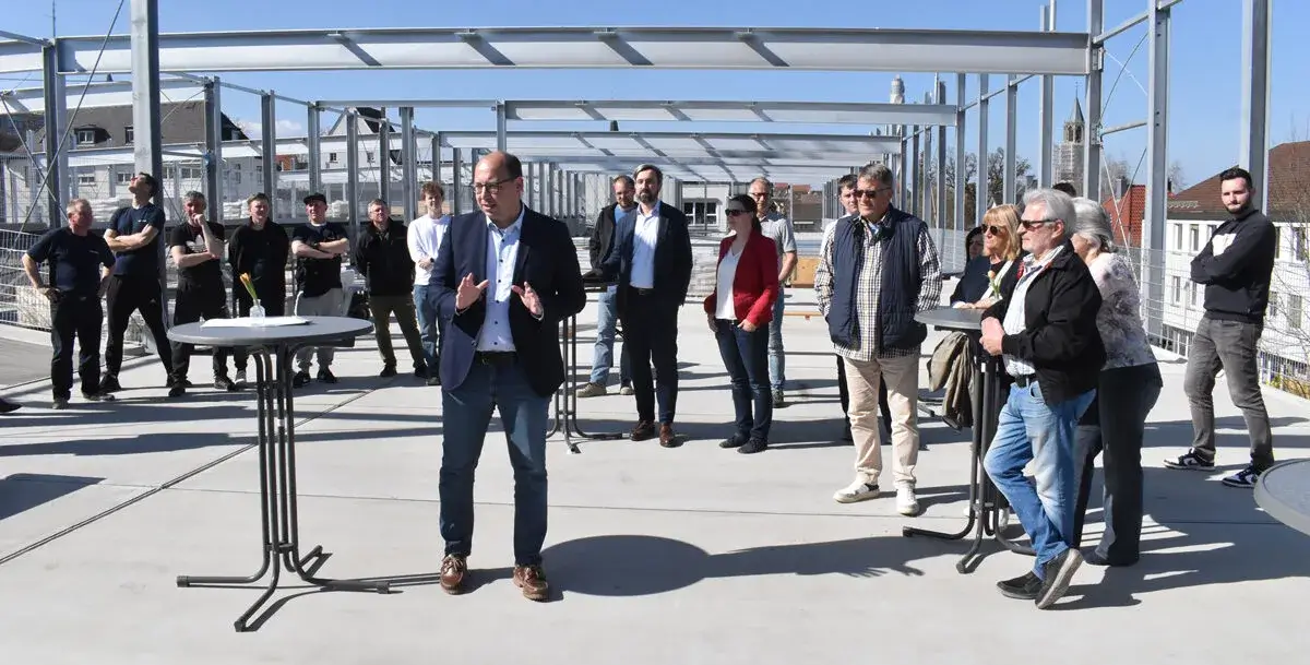 Rottweil – Eine kleine Einschränkung musste Oberbürgermeister Dr. Christian Ruf noch machen: „Wenn alles glatt läuft.“ Bislang aber läuft es, wie auch Jörg Parschat, der Niederlassungsleiter der Baufirma Goldbeck sagte. Und auch den OB begeisterte: „Es ist ganz beeindruckend, wie schnell das Parkhaus in den vergangenen Wochen in die Höhe gewachsen ist. Man konnte regelrecht zuschauen.“ Bevor es in die Höhe wuchs, wurden 10.000 Kubikmeter Erde bewegt, berichtete Ruf.