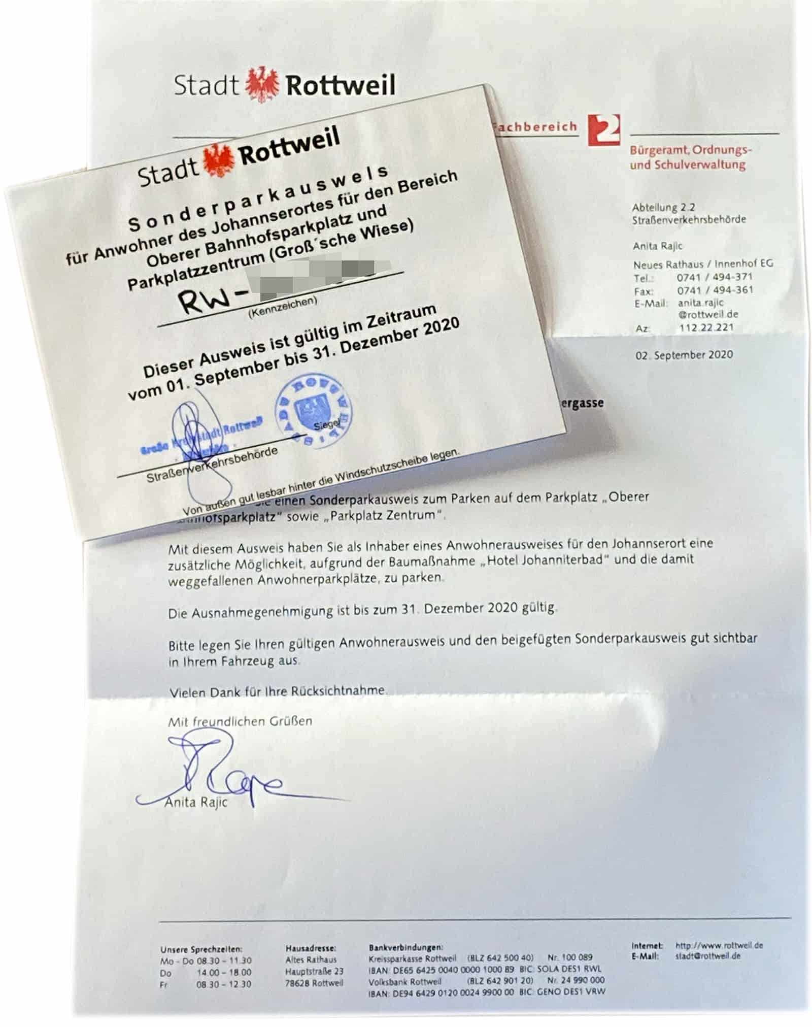 Inhaber eines Anwohner-Parkausweises im Johannserort haben heute Post von der Stadtverwaltung Rottweil bekommen. Darin ein „Sonderparkausweis“, der dazu berechtigen soll, den damit ausgestatteten Wagen im Zeitraum bis 31. Dezember 2020 kostenlos auf dem Oberen Bahnhofsparkplatz und auf dem Parkplatz Zentrum abzustellen.