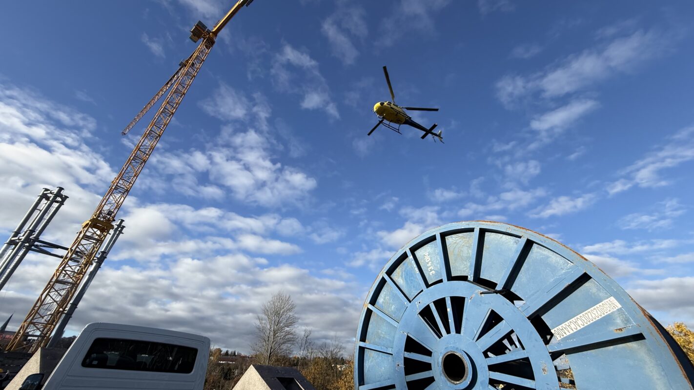 An diesem Montag wird das Verbindungsseil mithilfe eines Hubschraubers eingezogen. Dieser spektakuläre Moment markiert den Start in die nächste Bauphase: Auf Basis dieser Seilzugverbindung erfolgt anschließend, innerhalb von etwa vier Wochen, die Montage der Tragseile.