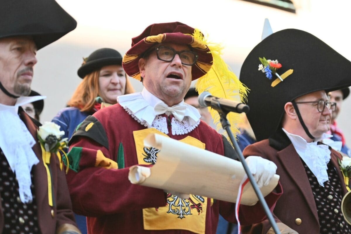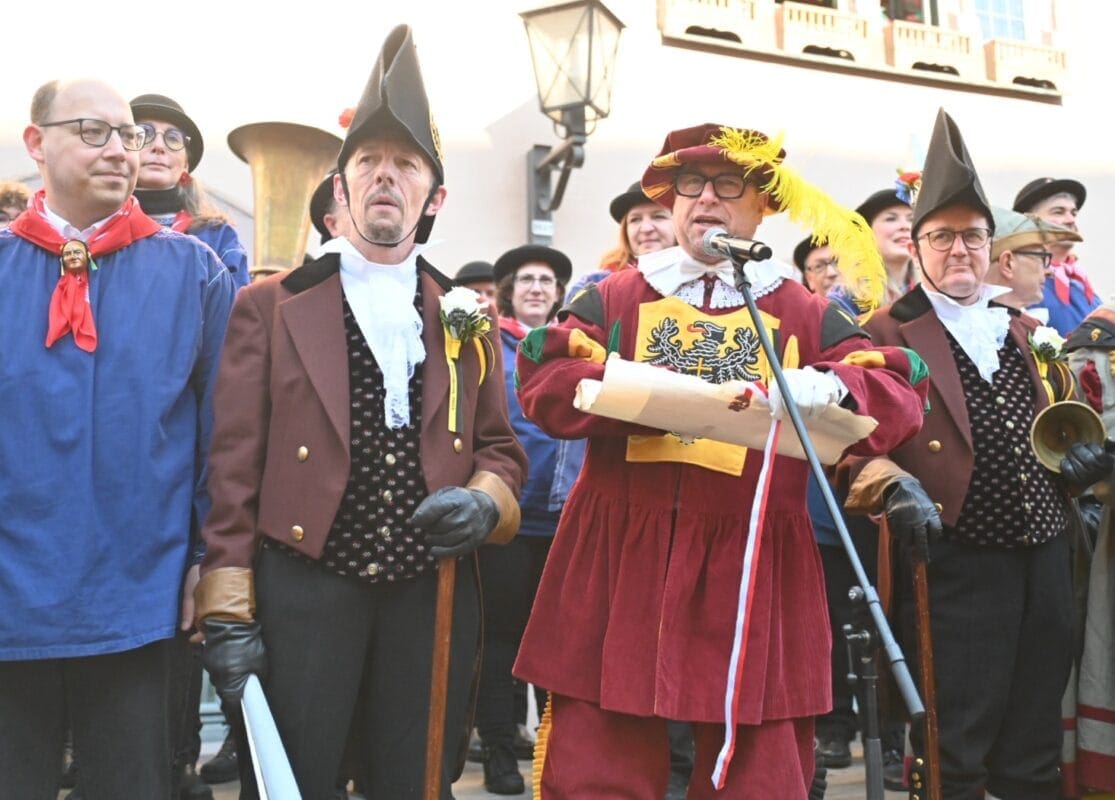 So proklamierte es Georg Hauser mit glanzvollem Gepränge vor einem stattlichen Publikum, das sich erwartungsvoll vor dem Alten Rathaus versammelt hatte. Sehen Sie hier die Bilder und lesen Sie im Wortlaut den von der Narrenzunft übermittelten Text der Proklamation aus der Feder von Zunftschreiber Prof. Frank Huber: