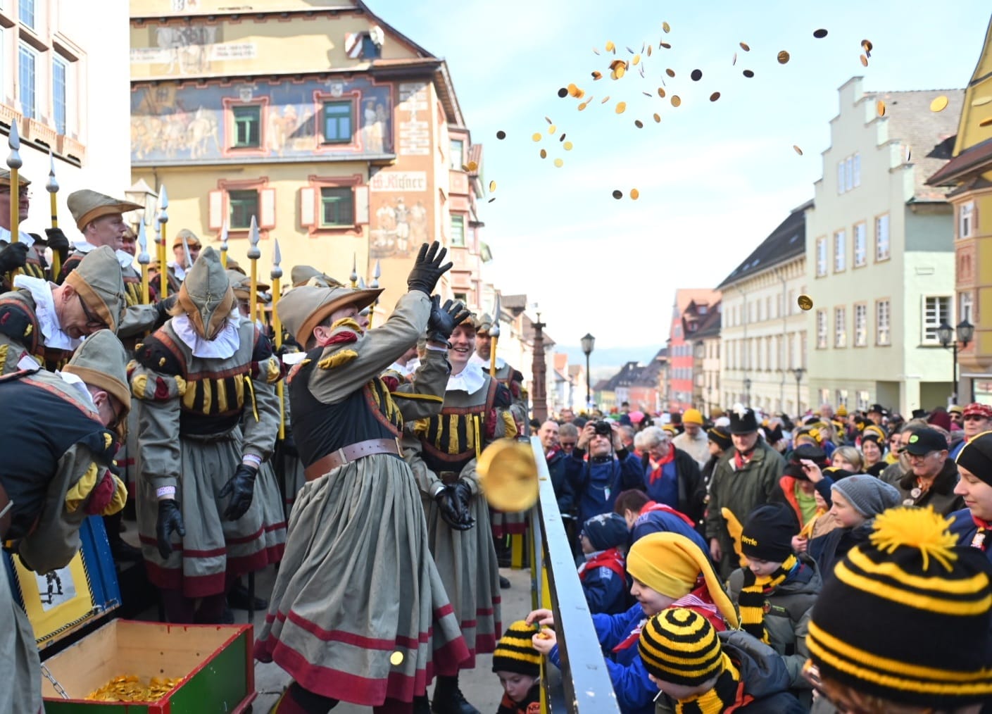 Bekannt gmacht sei weiter, dass wia äll Johr da Narramoaschter heut in ällera Früah mit sine Manna ufs Rothaus glofa isch. Kaum isch da Narramoaschter mit sine Manne aber durchs Schwarz Tor marschiert, war`s rum mit dera Tradition. Zmols kragelt da OB inera Lautstärke vom Rothaus d`Schtadt nuff, dass d`Stefan Drobny in Zizenhausa denkt hot, da Nicola Busch isch in da Zahnarztpraxis im Koroko bei era Wurzelbehandlung mit em Bohrer abgrutscht. „Wartet, wartet,“ schreit der wia verruckt, „bleibet um Himmelswilla schtanda, I muss eich erscht abkassiera.“ „Ha no, wa isch den jetzt au mit dem Bämolle los?“ frogt mi iser Narramoaschter. „Der geifert jo wia a alte Beisszang, so kenn I den gar it! Uff deana haufa Foto in da Zeitung und mit seiera neia Freindin im Arm do grinst der doch immer so schee.“