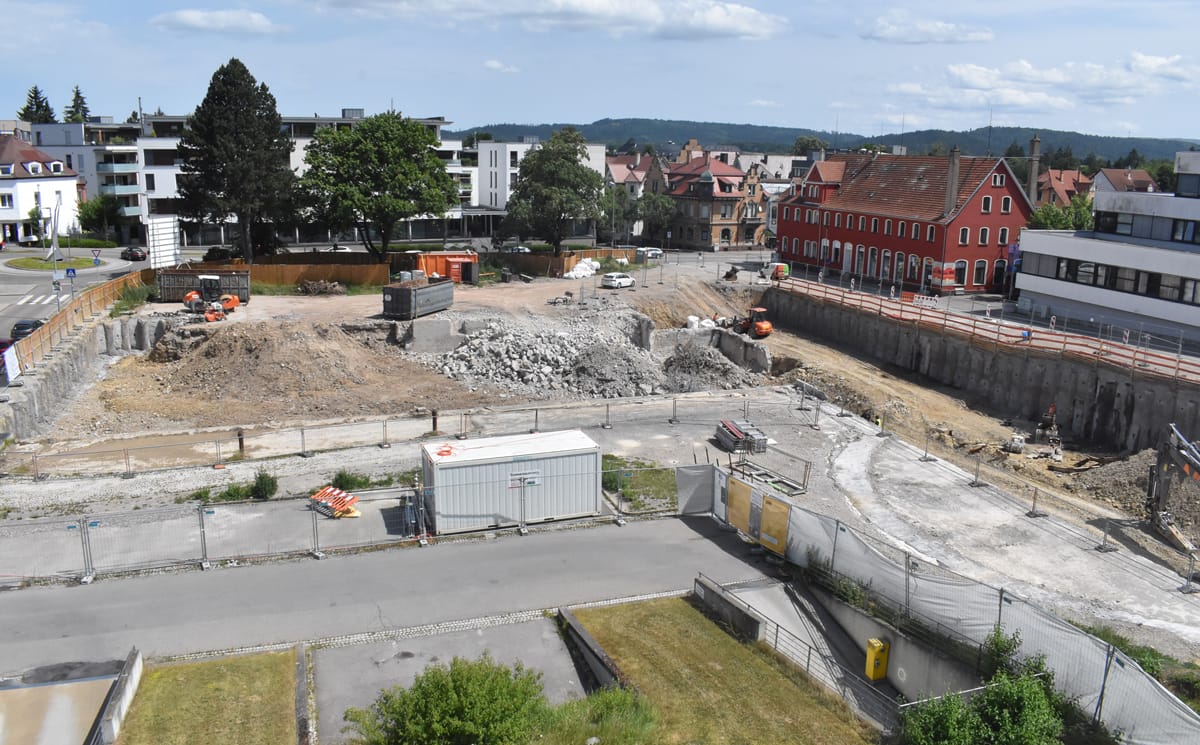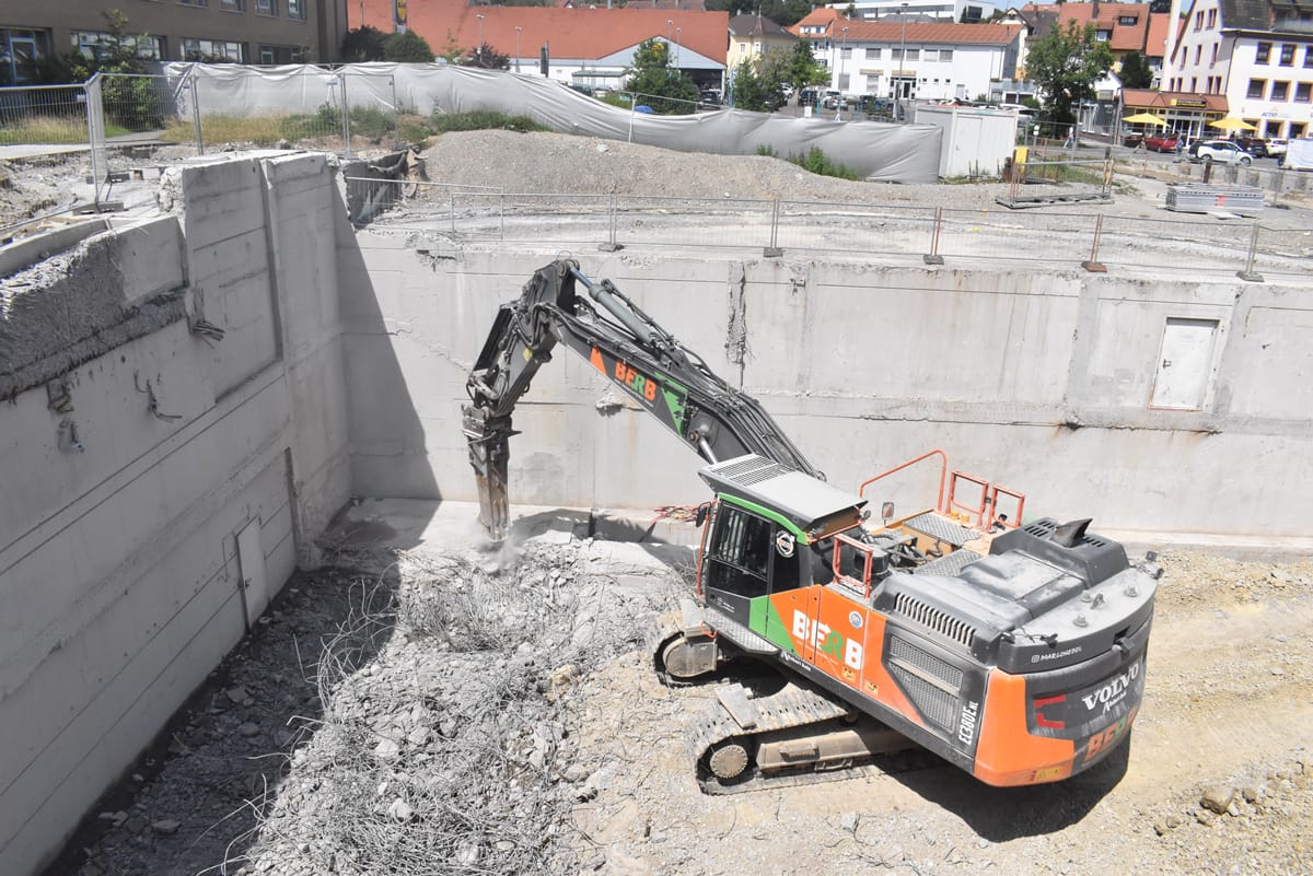 Rottweil – Die Gebäude des alten Landratsamts sind weg. Davon kann sich jeder überzeugen, der daran vorbeikommt. Dass die Abriss-Arbeiten noch nicht ganz fertig sind, ist beim Pressegespräch im nahen Gebäude Stadionstraße 5 zu spüren: Immer wieder ist lautes Klopfen zu hören. Und da steht niemand vor der Tür, sondern, wie sich bei der Besichtigung der Baustelle zeigt: Ein Bagger ist dabei, das Fundament des inzwischen verschwundenen Rundbaus zu demontieren. Und zwar, ohne die Außenwand der Tiefgarage zu beschädigen. Denn die bleibt erhalten.