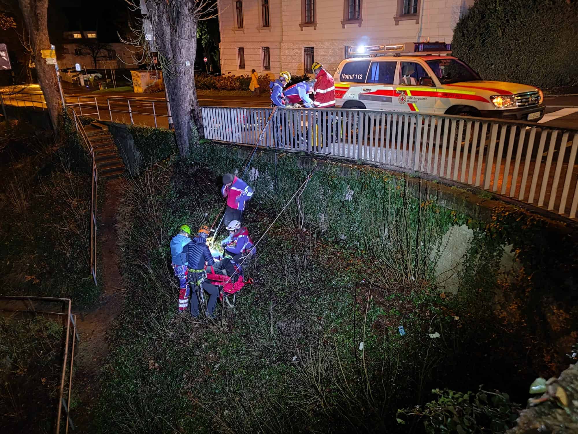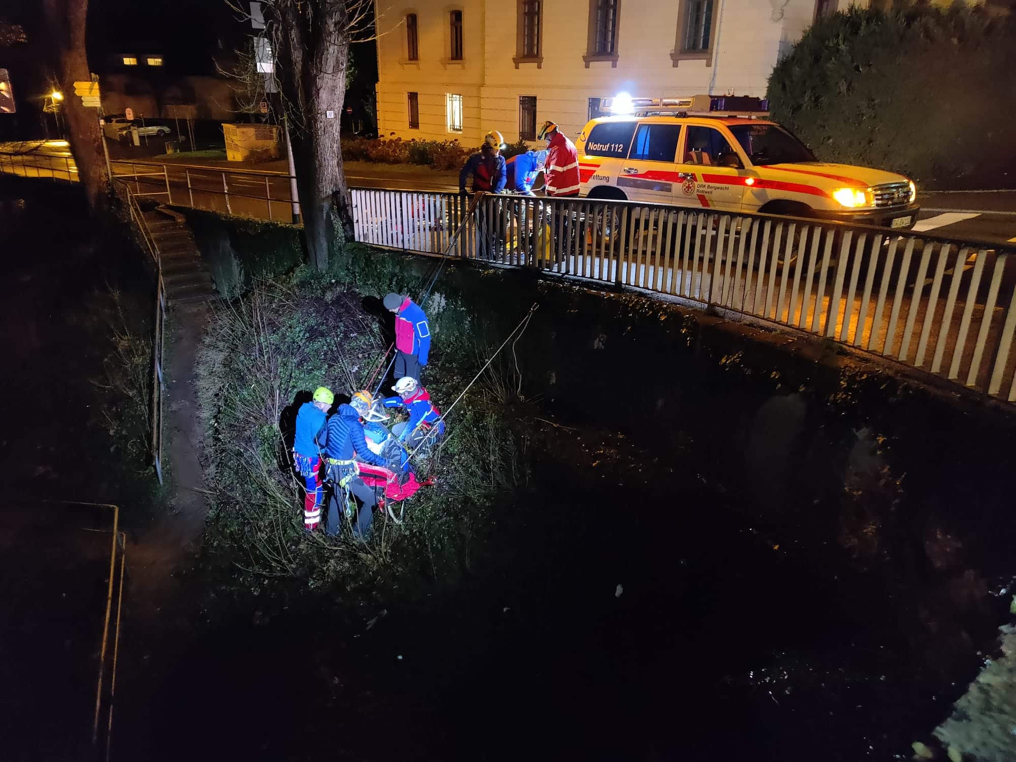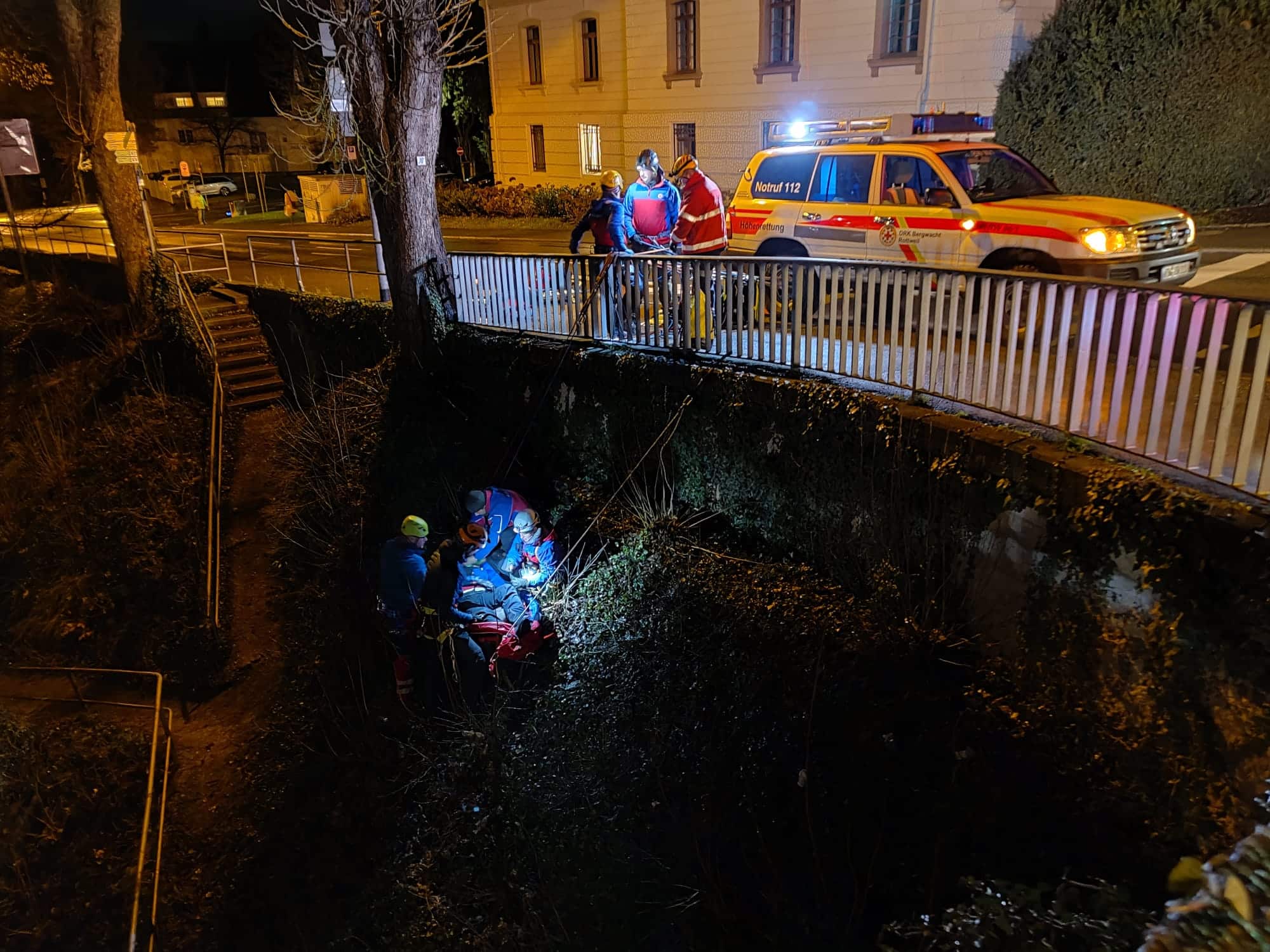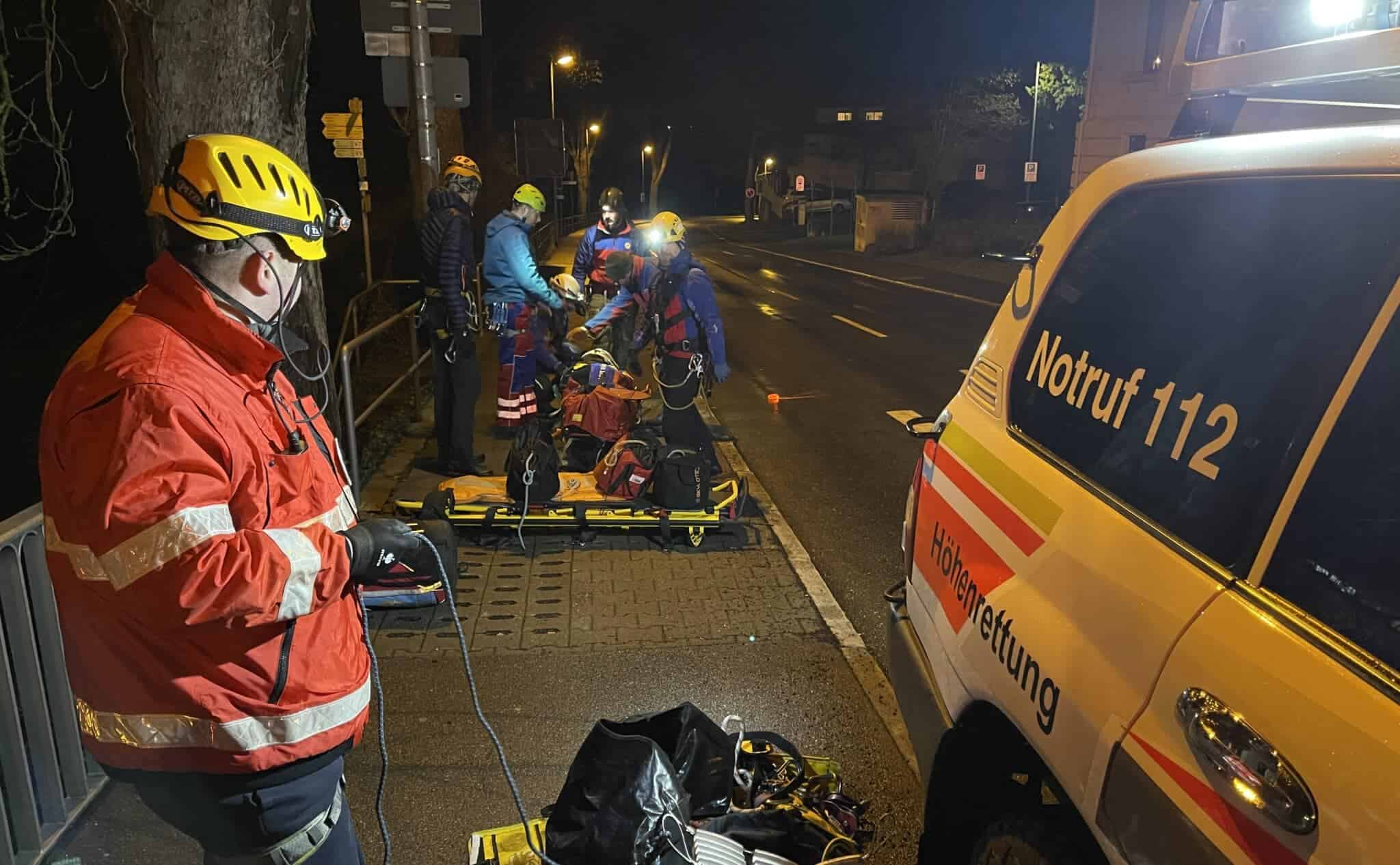 Die Annahme an diesem nasskalten Januarabend bei zwei Grad Celsius: Jemand, der zunächst auf einem Geländer an der Bahnhofstraße gesessen hatte, sei den Hang Richtung Stadtgraben hinab gestürzt. Im Ernstfall hieße das Alarmstichwort „Rettung aus unwegsamem Gelände“ – ein Fall für die beim DRK-Kreisverband angesiedelte Bergwacht. Deren Einsatzkräfte sind beispielsweise ausgerüstet und ausgebildet für die notfallmedizinische Versorgung im Gelände, für Fels-, Höhen- und Grubenrettung – wie etwa auf einer Baustelle in Deißlingen -, und würden im Falle eines tatsächlichen Sturzes eines Menschen, hinzugezogen. Das war auch an der Hochbrücke schon der Fall, jüngst wurde das Team etwa bei Dietingen gebraucht, als ein Paketbote im Wald verunglückte. Und der für die Ausbildungseinheit am Montagabend angenommene Fall, der hatte sich fast identisch erst im vergangenen November in Rottweil ereignet, außerdem im Mai am Rande einer Party im Neckartal. Auch etwa bei Vermisstensuchen wird die Bergwacht eingesetzt.