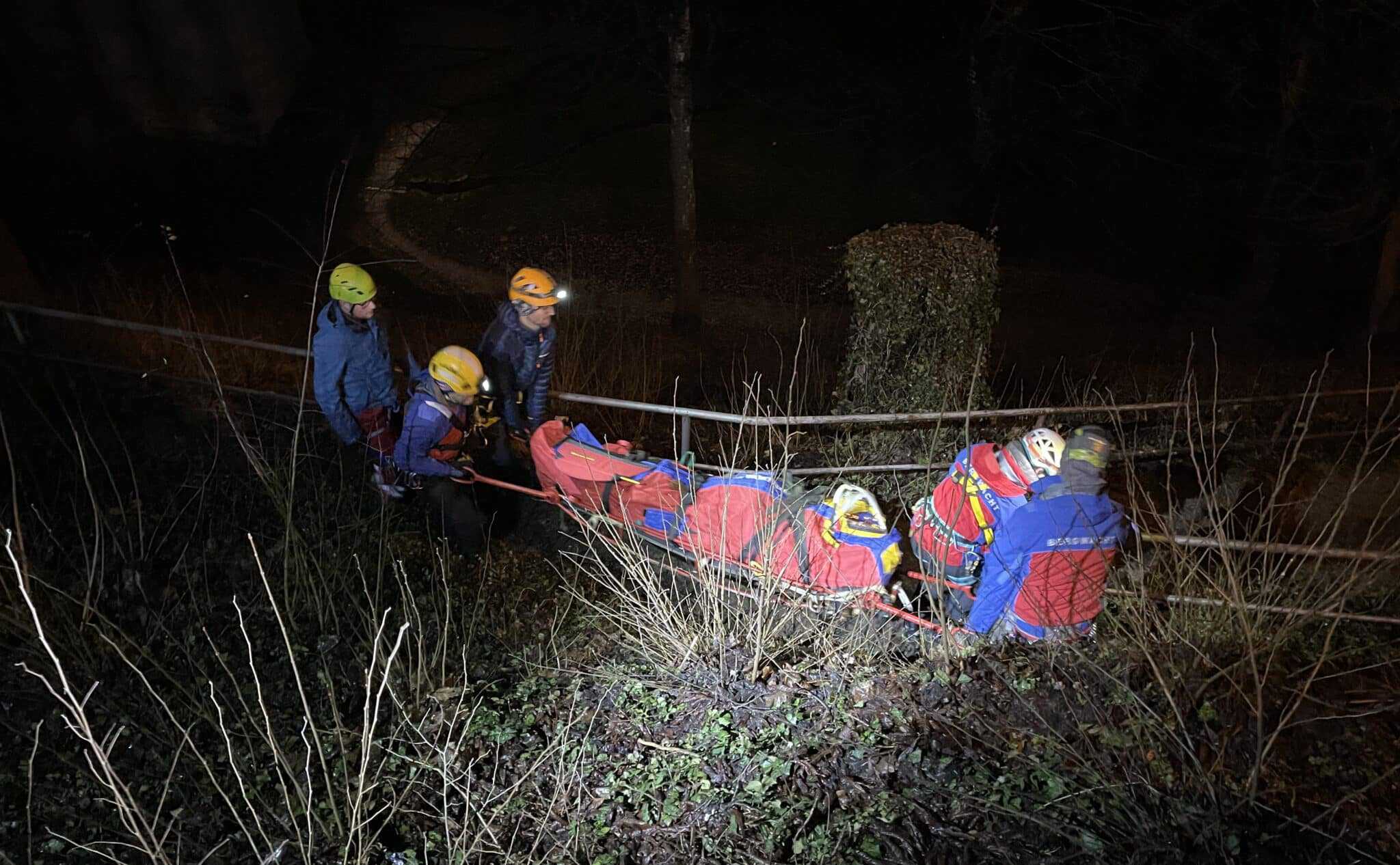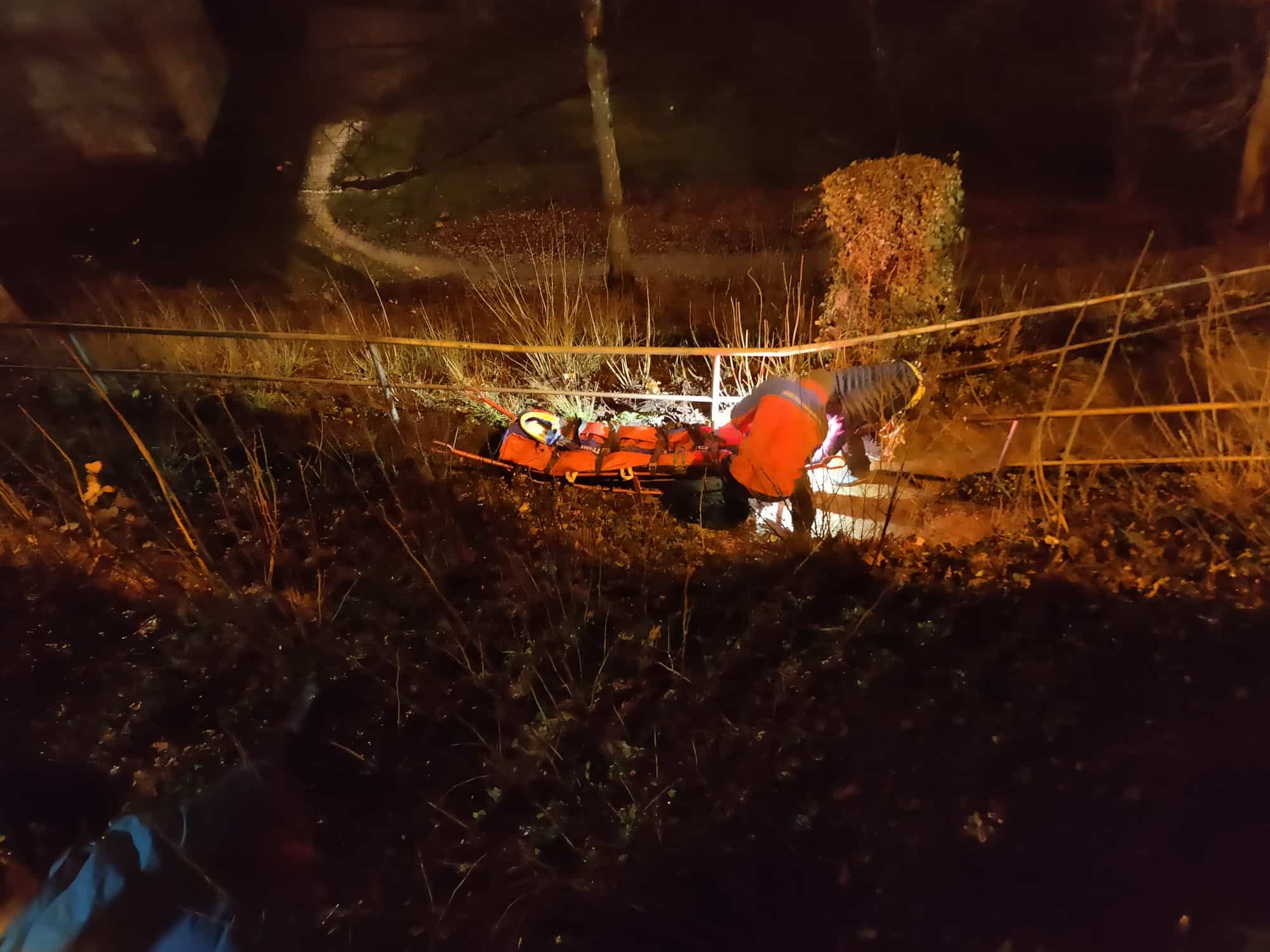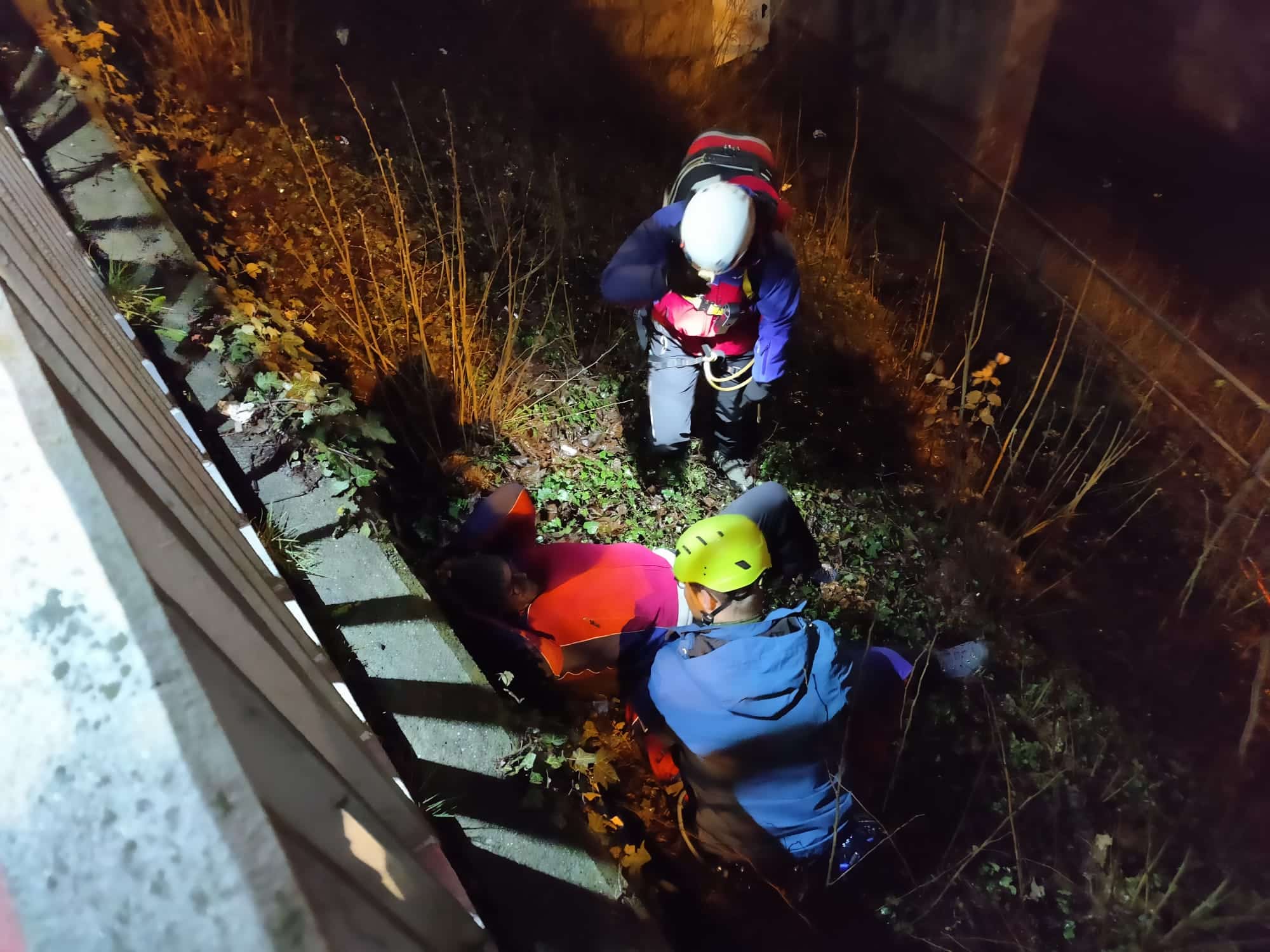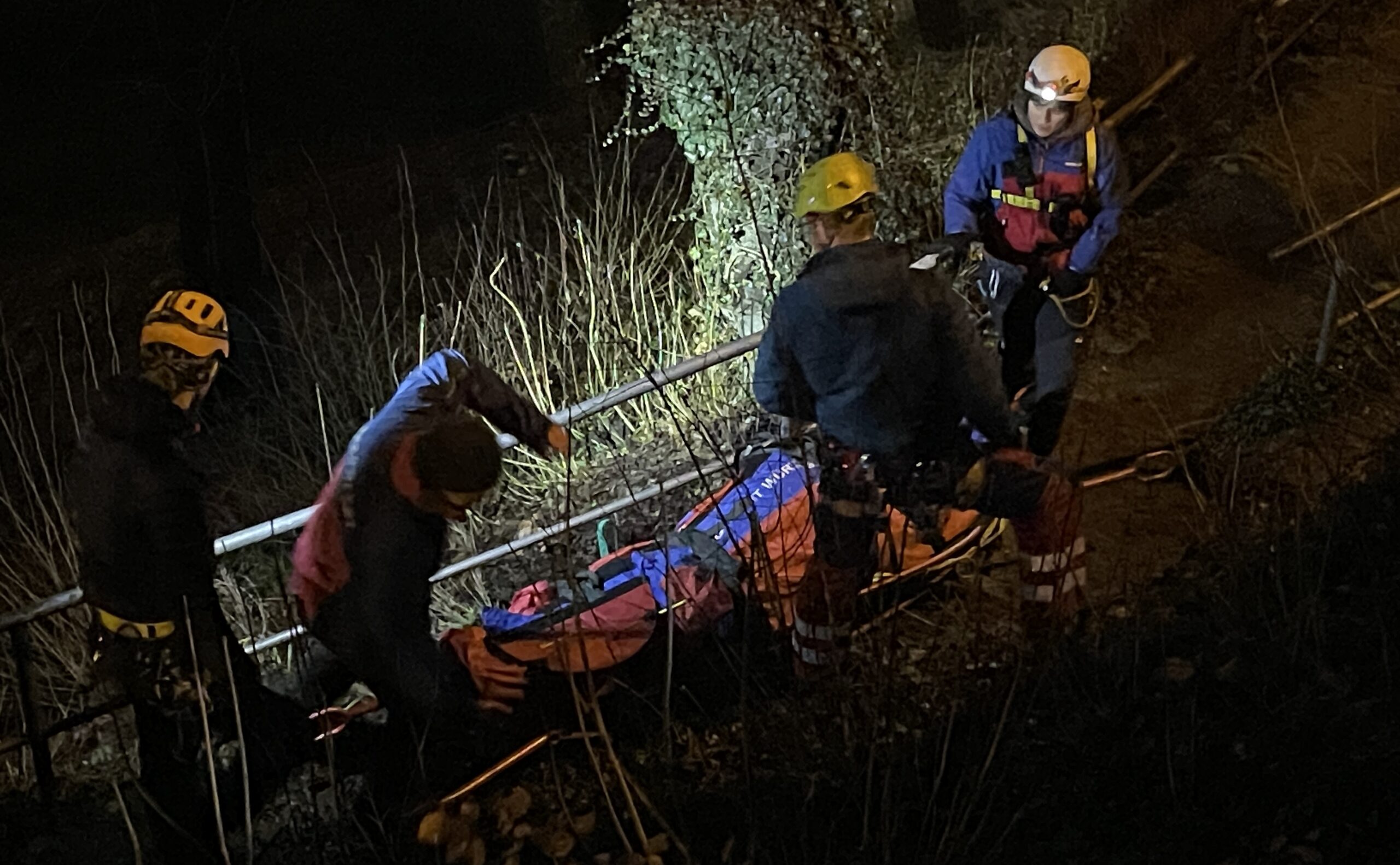 Die Annahme an diesem nasskalten Januarabend bei zwei Grad Celsius: Jemand, der zunächst auf einem Geländer an der Bahnhofstraße gesessen hatte, sei den Hang Richtung Stadtgraben hinab gestürzt. Im Ernstfall hieße das Alarmstichwort „Rettung aus unwegsamem Gelände“ – ein Fall für die beim DRK-Kreisverband angesiedelte Bergwacht. Deren Einsatzkräfte sind beispielsweise ausgerüstet und ausgebildet für die notfallmedizinische Versorgung im Gelände, für Fels-, Höhen- und Grubenrettung – wie etwa auf einer Baustelle in Deißlingen -, und würden im Falle eines tatsächlichen Sturzes eines Menschen, hinzugezogen. Das war auch an der Hochbrücke schon der Fall, jüngst wurde das Team etwa bei Dietingen gebraucht, als ein Paketbote im Wald verunglückte. Und der für die Ausbildungseinheit am Montagabend angenommene Fall, der hatte sich fast identisch erst im vergangenen November in Rottweil ereignet, außerdem im Mai am Rande einer Party im Neckartal. Auch etwa bei Vermisstensuchen wird die Bergwacht eingesetzt.