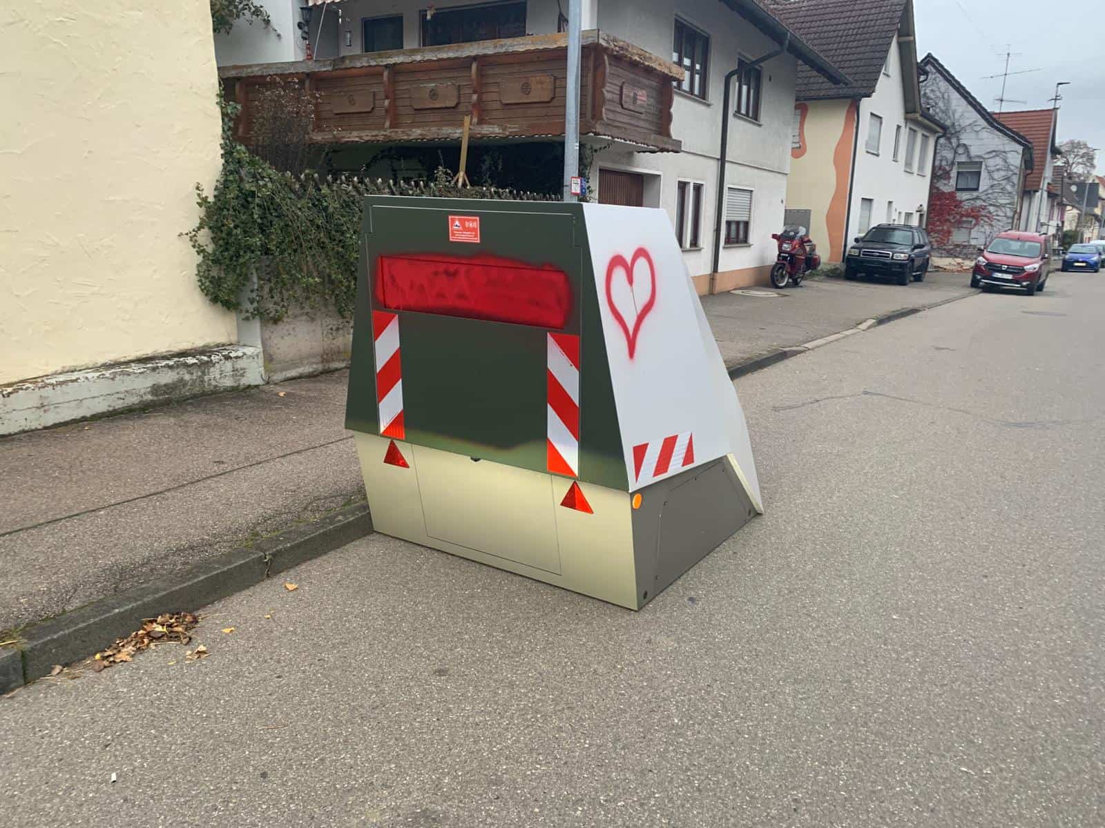 Es passierte vermutlich in der Halloween-Nacht, der Nacht des Grauens. Der im Bühlinger Unterdorf abgestellte Blitzeranhänger der Stadt Rottweil überstand diese Unruhenacht nicht unbeschadet. Unbekannte haben das Gerät mit roter Farbe besprüht. Das Sichtfenster, hinter dem Kamera und Blitz sitzen, ist jetzt undurchsichtig.