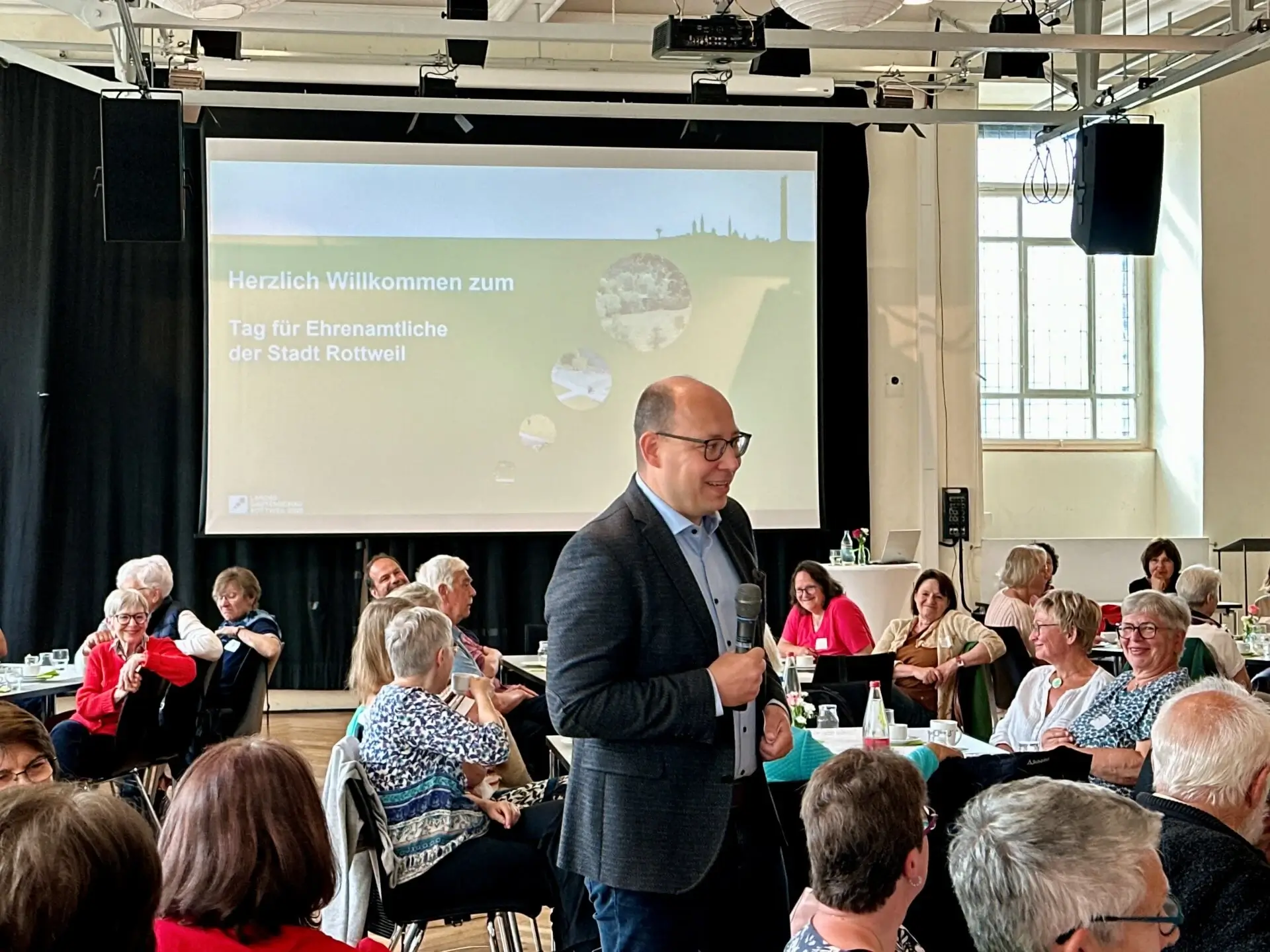 Bereits ab 8.30 Uhr fanden sich zahlreiche Gäste im Sonnensaal des Kapuziners ein – so viele wie noch nie zuvor. Bei einem herzlichen Frühstück mit Butterbrezeln und Kaffee oder Tee kam man miteinander ins Gespräch. Oberbürgermeister Dr. Christian Ruf eröffnete die Veranstaltung und sprach in seinem Grußwort allen Engagierten einen großen Dank aus: „Ohne das Ehrenamt wären viele Bereiche des öffentlichen Lebens in Rottweil nicht denkbar. Ihre Arbeit in Vereinen, Kirchen, Nachbarschaften und Initiativen ist unverzichtbar – oft still und im Hintergrund. Heute soll sie sichtbar gewürdigt werden.“