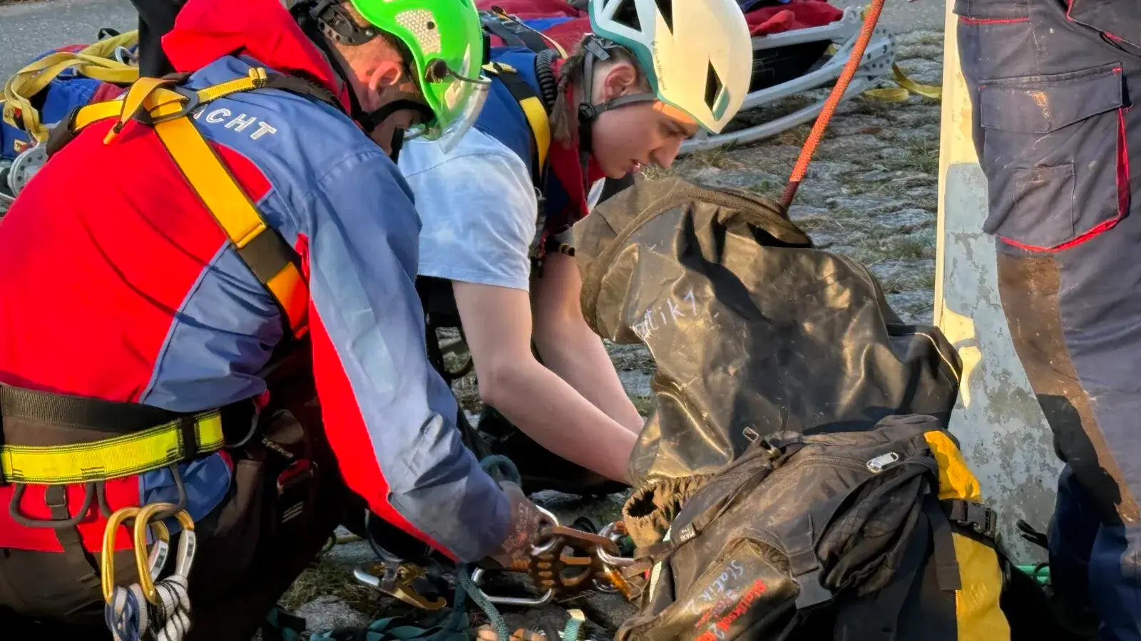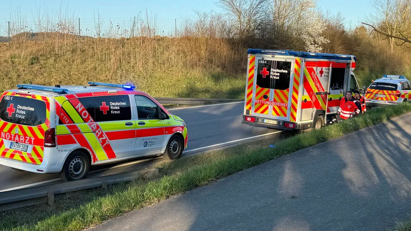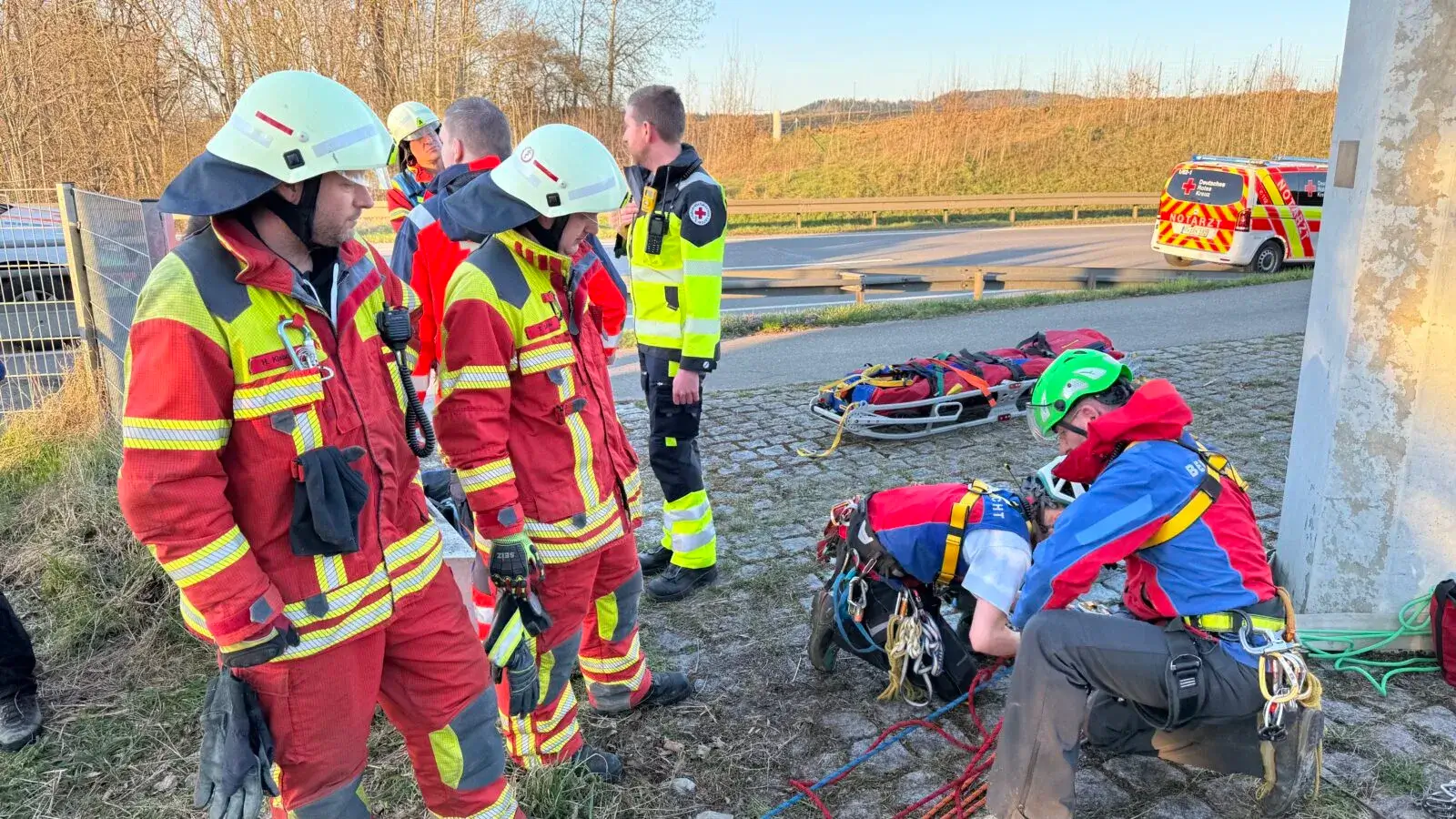 Ein Rettungswagen des DRK stand für den Mann bereit. Ein DRK-Notarzt war anfänglich ebenfalls vor Ort, konnte dann aber für einen Folgeeinsatz abrücken, weil für ihn der Notarzt der Bergwacht übernahm. Diese ist für Einsätze wie den vorliegenden, Rettung aus unwegsamem Gelände, besonders ausgebildet und gerüstet.