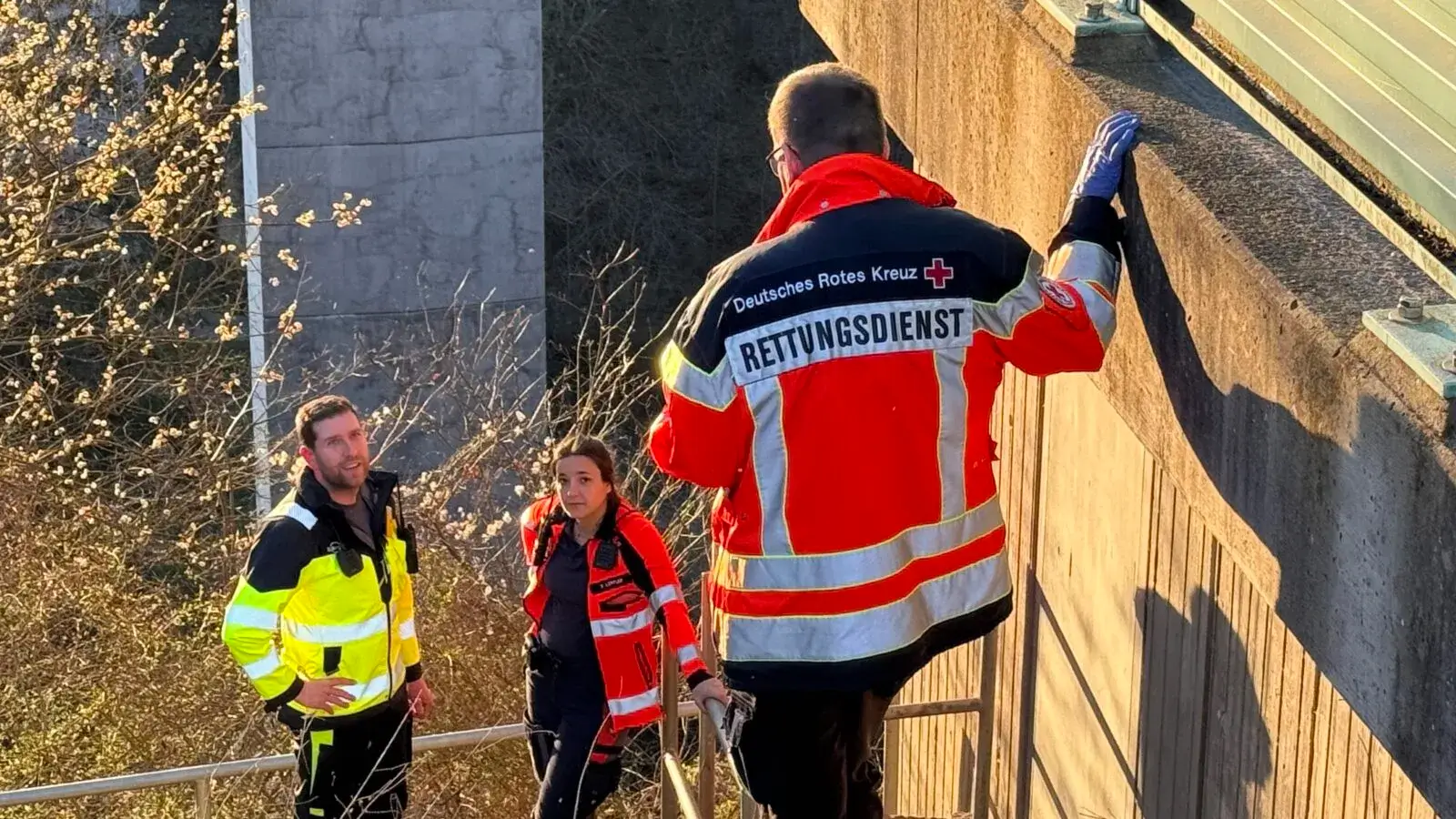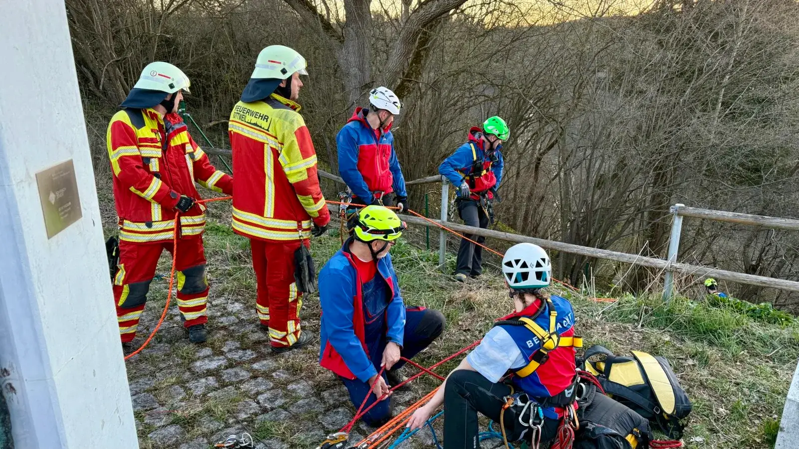 Offenbar hatte der Mann unten im Hang bis zu seiner Rettung auf einem Baumstumpf ausgeharrt, hieß es. Er kam, begleitet von den Rettern und von ihnen ausgestattet mit einem Helm, nach oben. Auf eigenen Füßen. Und direkt in den Rettungswagen.