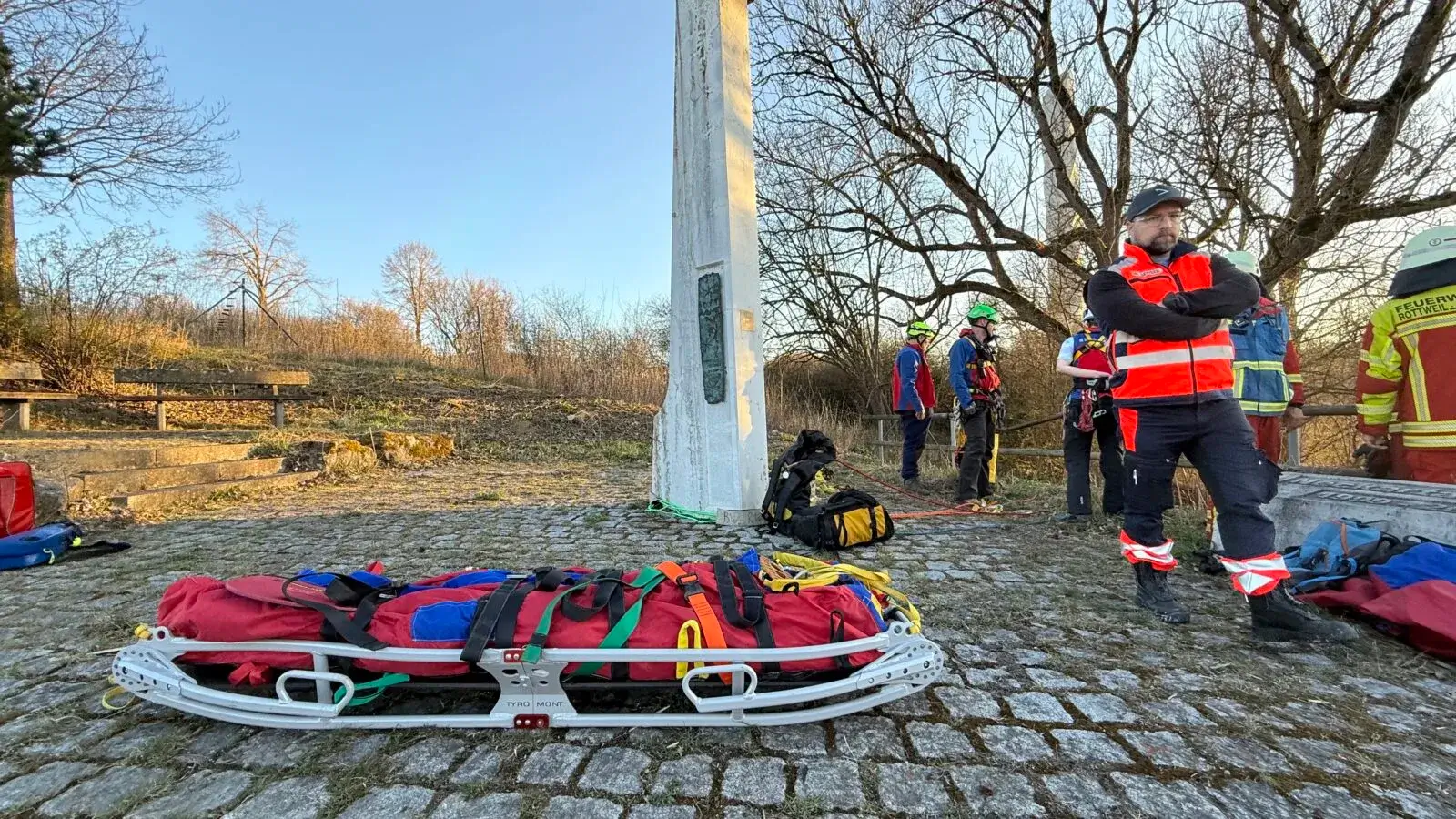 „Das ist eine Rettungsaktion, aber sie geschieht ohne Eile.“ Der Organisatorische Leiter Rettungsdienst, Etienne Bantle, konnte gleich zu Beginn den Druck rausnehmen. Zwar sei ein Mann aus misslicher, hilfloser Lage am Abhang zum Neckar zu befreien, doch sei er glücklicherweise allenfalls leicht verletzt. Die Bergwacht, mit drei Fahrzeugen unter dem Kommando von Steffen Weiss angerückt, machte sich an die Aufgabe. Die Retter brachten Sicherungsseile an, an denen der Verunglückte hochgezogen wurde. Dazu eignet sich, wie sich herausstellte, die Figur des Nepomuk, liegend auf einer massiven Säule, bestens.