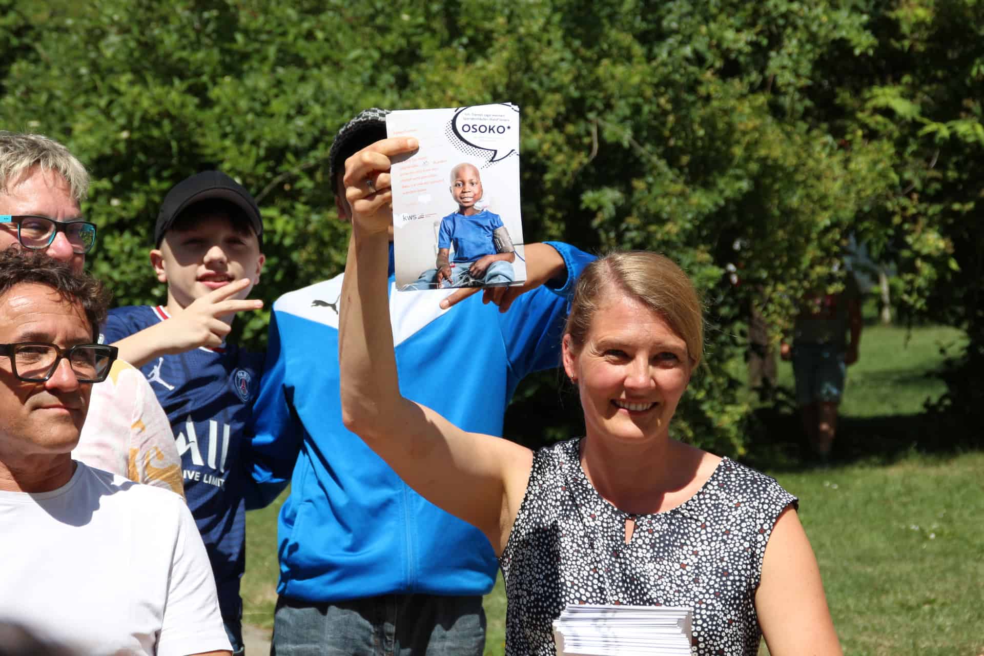 Genauso gut waren die Schüler beim Spendensammeln. Da wurde teilweise die gesamte Verwandtschaft um gesponserte Laufrunden gefragt, manche klapperten die ganze Straße und sogar die Rottweiler Einzelhändler samt der Kreissparkasse ab. Und das hat sich wirklich gelohnt. Daniel selbst konnte bei der Spendenübergabe nicht dabei sein, er macht gerade die achte Chemotherapie durch und soll danach gleich den Stammzellentausch bekommen. Da darf er sich auf keinen Fall irgendwie anstecken, sogar ein Schnupfen wäre da gefährlich. Houma Kustermann erklärte das den Schülern und versprach, dass er, sobald er gesund ist, auf jeden Fall vorbeikommt. Ein Dankeschön hat er dennoch für die Schüler: Jeder Läufer bekam eine Karte mit einem „Osoko“ – Danke in seiner Heimatsprache. „Er wäre gerne gekommen“, erzählte Houma Kustermann. Daniels Mama im fernen Kamerun sei in Tränen ausgebrochen, als sie die Fotos der vielen Kinder sah, die sich für Daniel einsetzten. „Ihr seid unglaublich“, so Houma Kustermann. „Und Ihr habt es uns Erwachsenen echt gezeigt!“