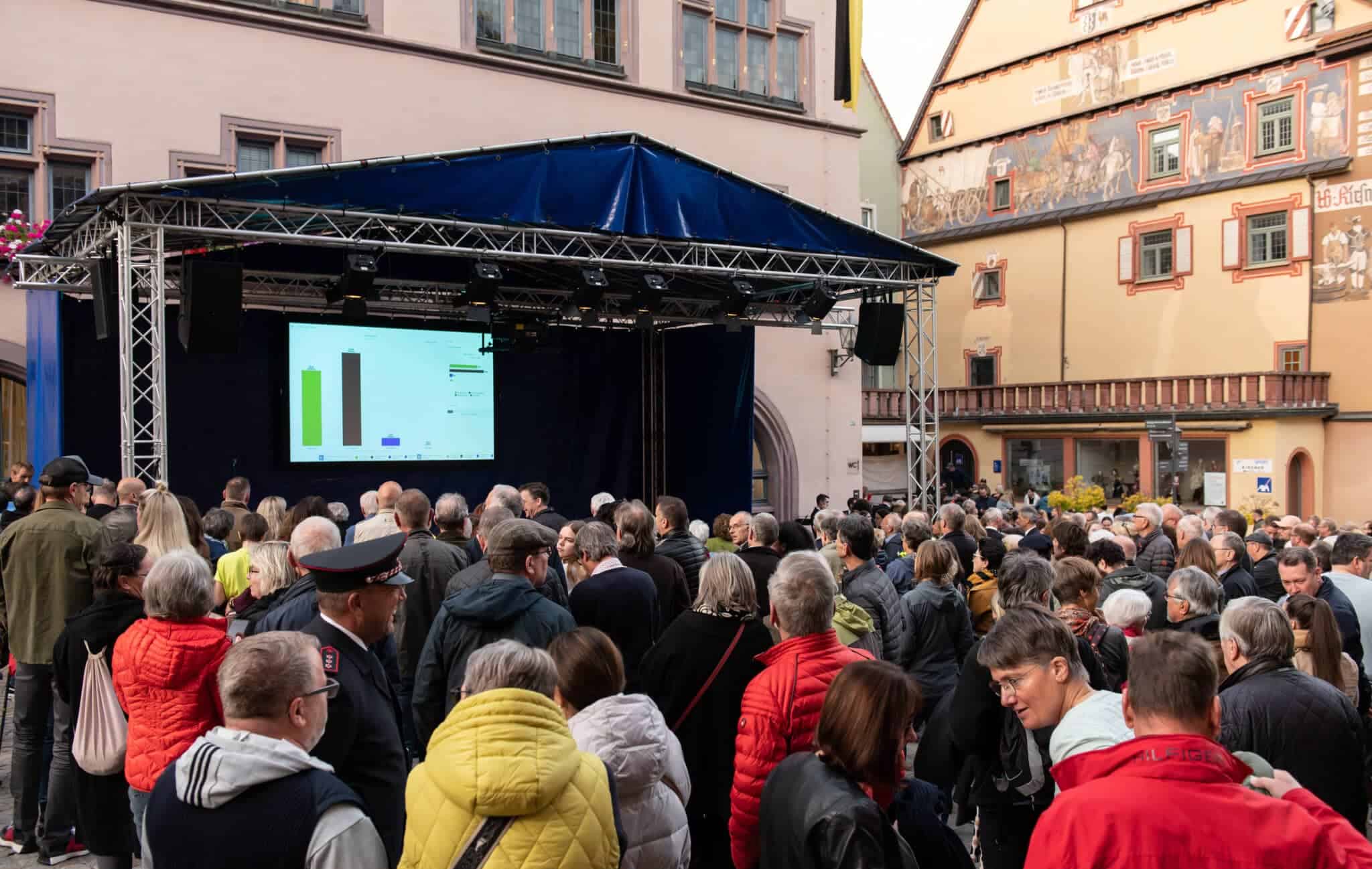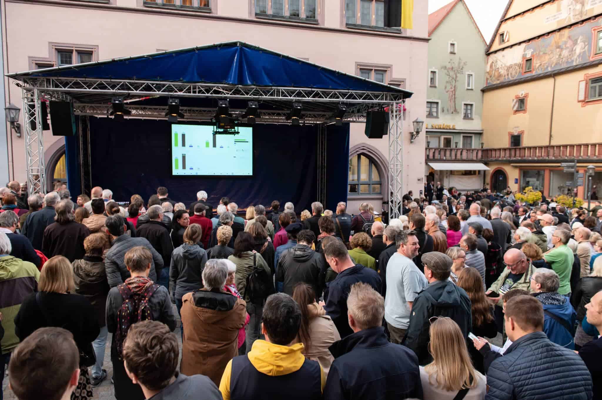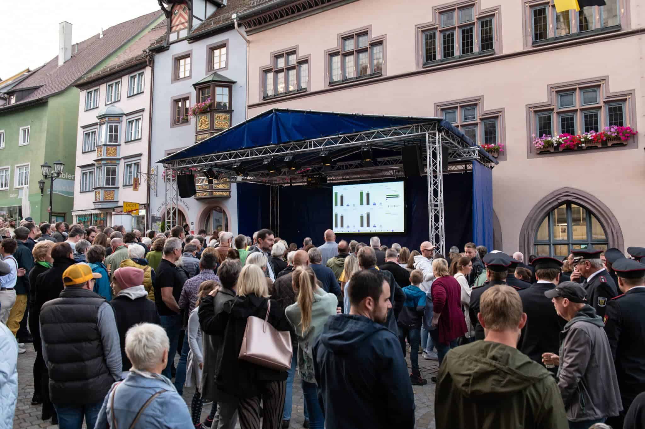 Die Techniker von Power4Events haben die Bühne vor dem Alten Rathaus längst wieder hergerichtet. Dort wird die Auszählung der Stimmen übertragen, dort wird Ralf Broß dann den Namen seines Nachfolgers bekannt geben. Und die Musik spielt. Die Stadtkapelle war vor drei Wochen, zum Ende des ersten Wahlgangs, schon erschienen, musste dann aber nicht in Aktion treten. Denn damals gab es noch kein eindeutiges Ergebnis. Heute wird das der Fall sein.