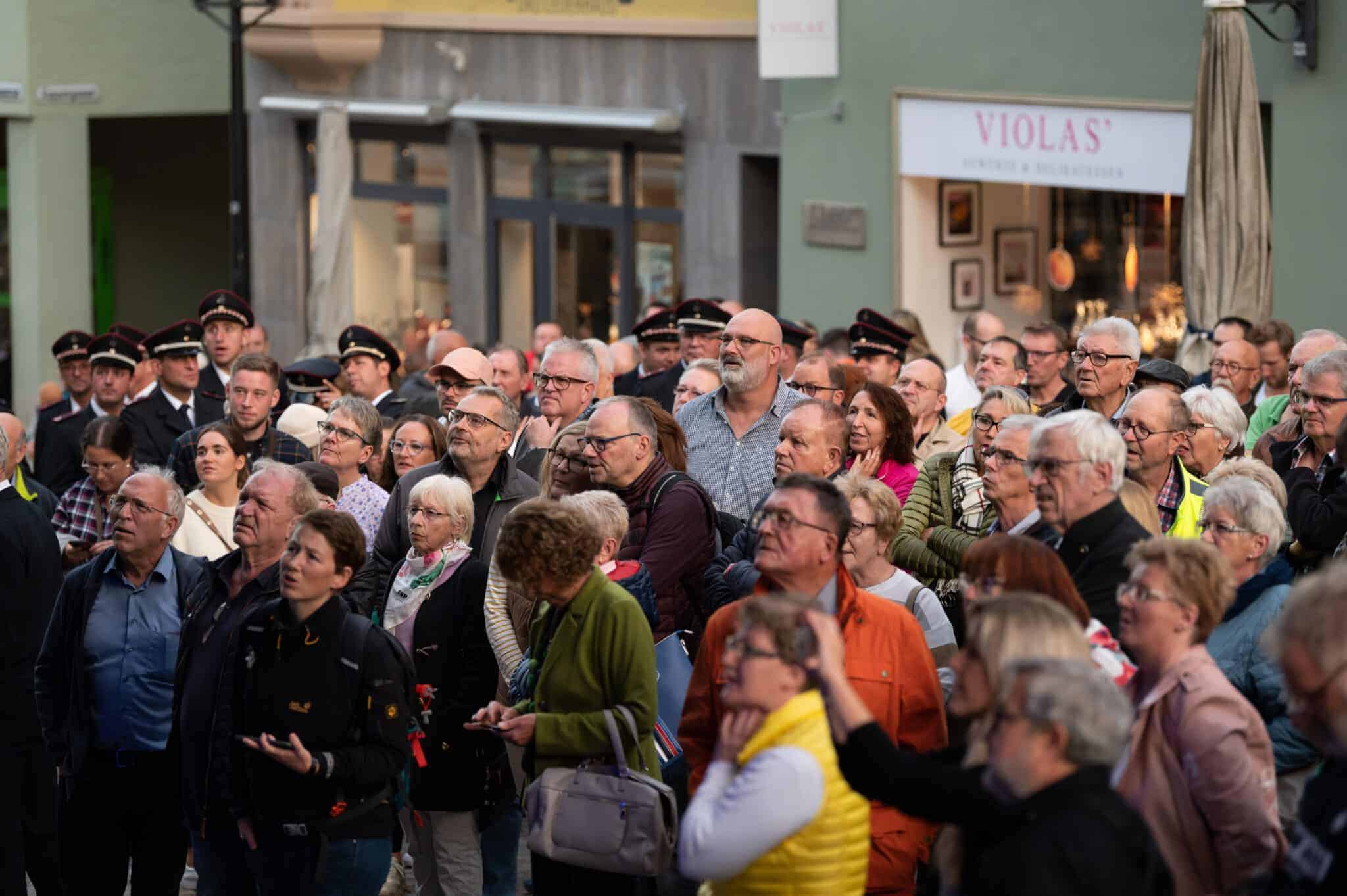 Die Obere Hauptstraße hat sich derweil weiter mit Menschen gefüllt. Und die Feuerwehr steht mit zwei Fahrzeugen für den Notfall bereit.