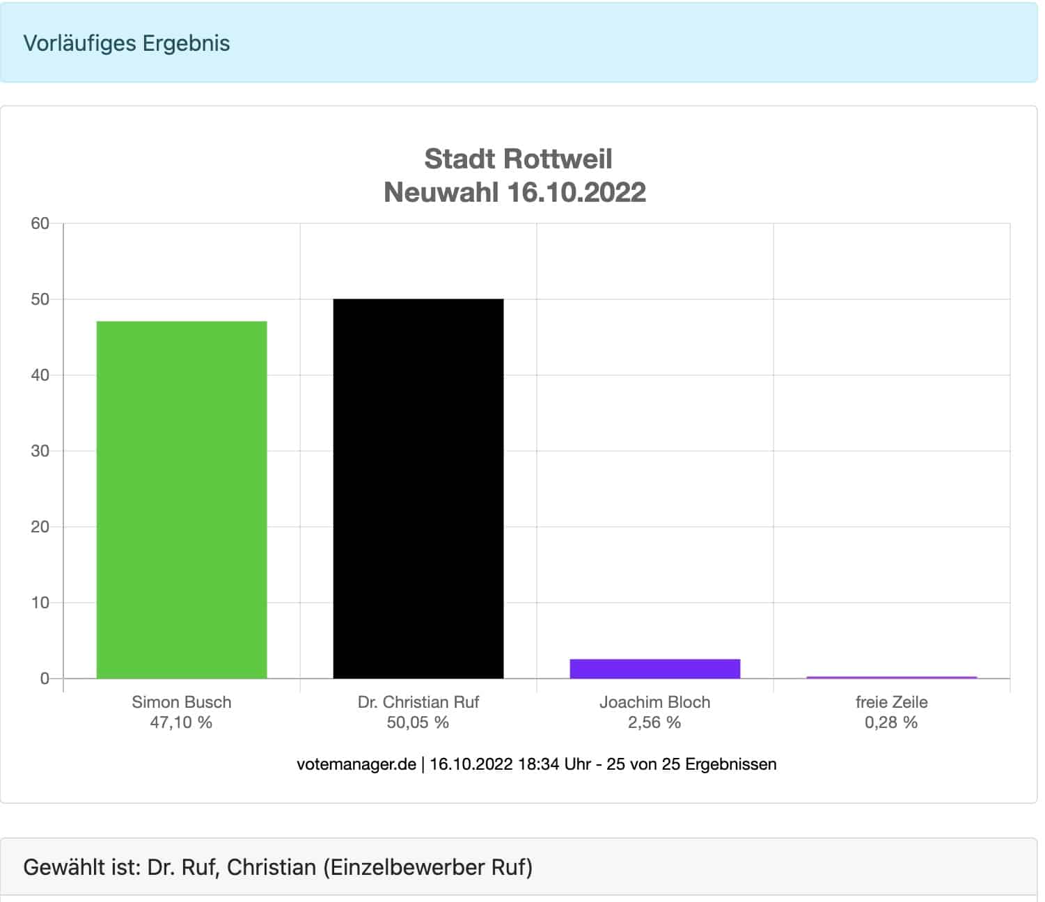 Update, 18.30 Uhr: Zwei Wahlbezirke stehen noch aus. Dr. Christian Ruf liegt knapp vorn.