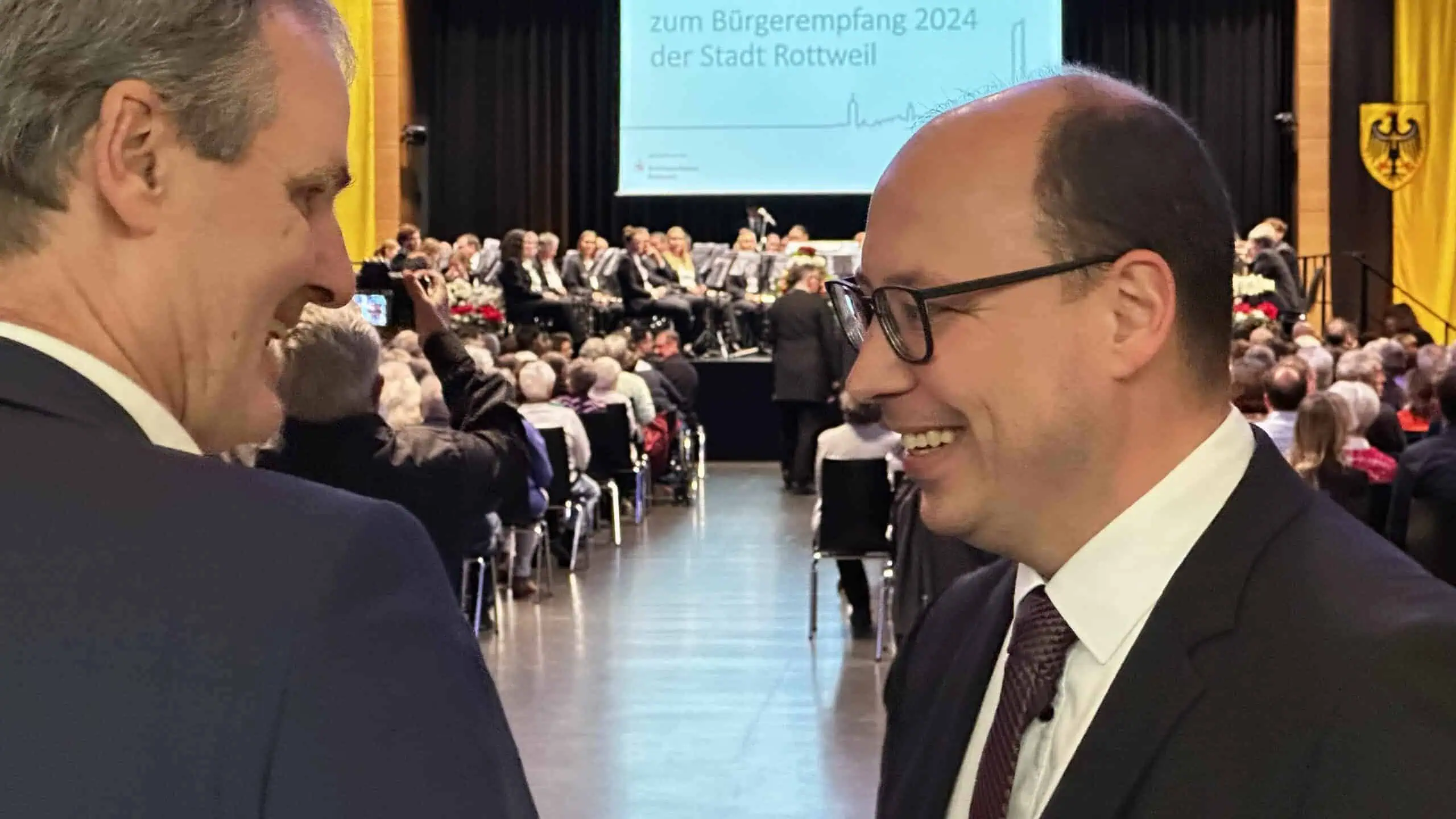 ich heiße Sie alle herzlich willkommen zum Bürgerempfang 2024 der Stadt Rottweil hier in unserer Stadthalle. Ich bin zugegebenermaßen beeindruckt, dass Sie in so großer Zahl meiner Einladung gefolgt sind. Vor Jahresfrist war es vielleicht noch der Reiz, mal eine Rede des neuen OB zu hören. Heute blicke ich auf mein erstes Jahr als Ihr Oberbürgermeister zurück und ganz offensichtlich ist das Interesse an unserer Stadtentwicklung nach wie vor groß. Ja, darüber freue ich mich sehr.