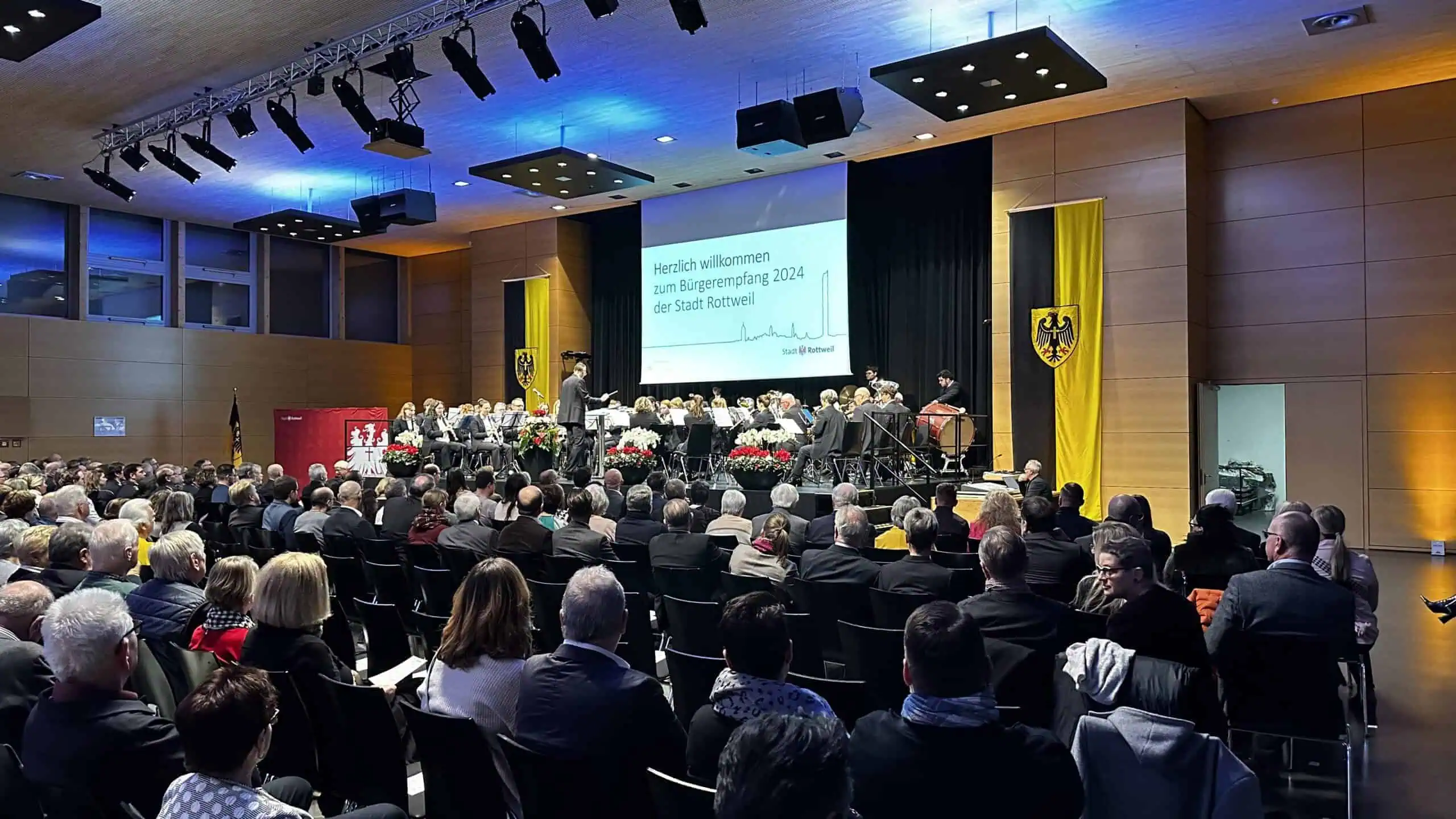 Mein besonderer Dank geht gleich zu Beginn an die Stadtkapelle Rottweil unter der Leitung von Herrn Johannes Nikol, die uns musikalisch bereits begrüßt und in den Abend eingestimmt hat. Die korrekte Bezeichnung lautet Stadtmusikdirektor Johannes Nikol – diesen Titel hat der Gemeinderat Ihnen im vergangenen Jahr verliehen, um Ihre herausragenden Leistungen für die Stadtkapelle zu würdigen. Wir freuen uns noch auf weitere musikalische Beiträge im Laufe des Abends.