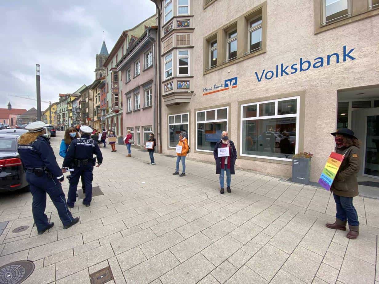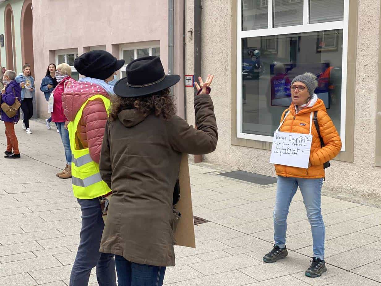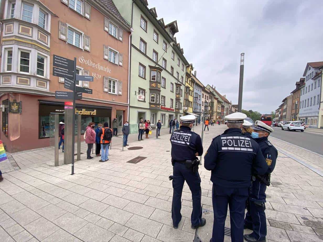 Die Polizei und das Ordnungsamt, mit sieben Kräften vor Ort und von weiteren Streifen aus dem Hintergrund unterstützt, hatten wenig zu tun. Allenfalls, wenn Demo-Teilnehmer gegen die Auflage verstießen, einen Mundschutz zu tragen, wurden sie von den Streifenbeamten und Ordnungsamtsmitarbeiterinnen um Nachbesserung gebeten. Der Ton untereinander war bestimmt, blieb aber freundlich.