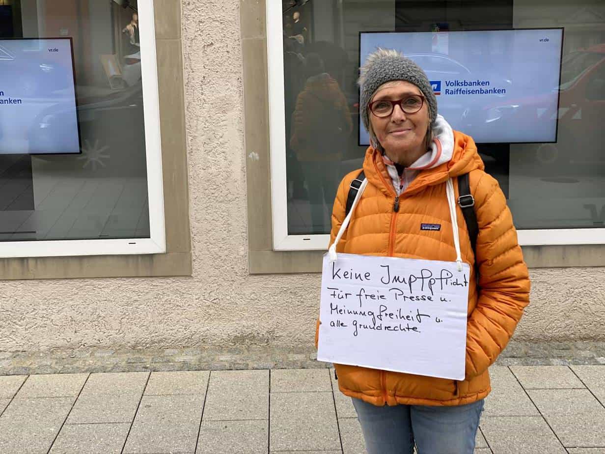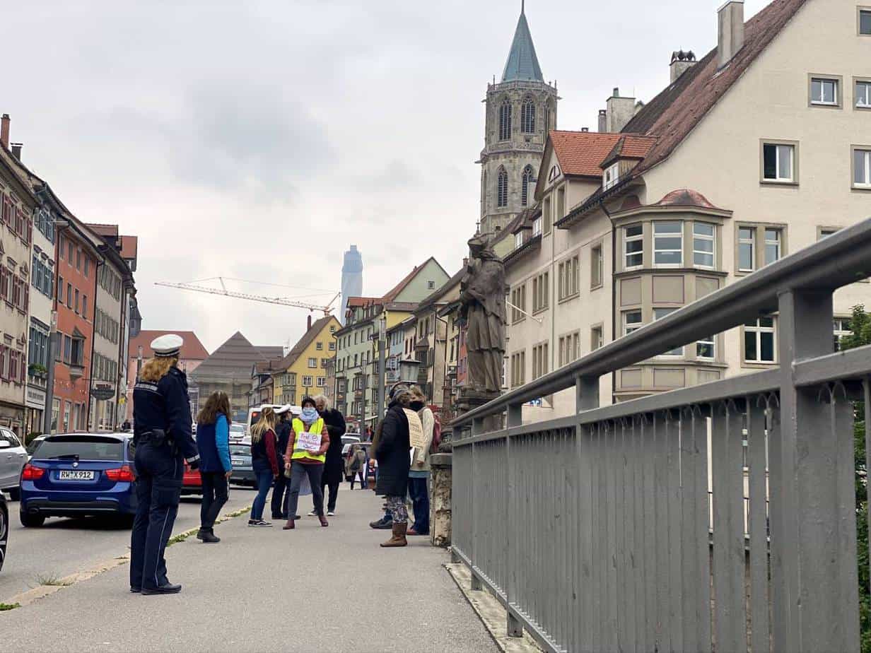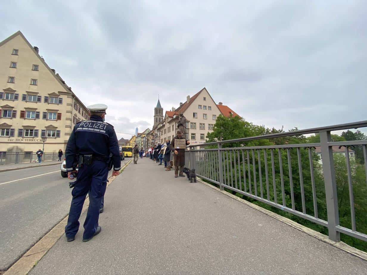 Es war ein stiller und, wie von den Veranstaltern auch ausdrücklich gewünscht, friedlicher Protest. Die 80 Teilnehmer, so eine Schätzung eines der Veranstalter, reihten sich auf der vom Ordnungsamt vorgegebenen Strecke zwischen dem Kapellenturm und dem Paracelsushaus auf. Die Menschenreihe reichte damit diesmal bis auf die Hochbrücke. Die Zahl der Teilnehmer hatte der Veranstalter in der vergangenen Woche auf 160 geschätzt. Die Polizei nannte 140.